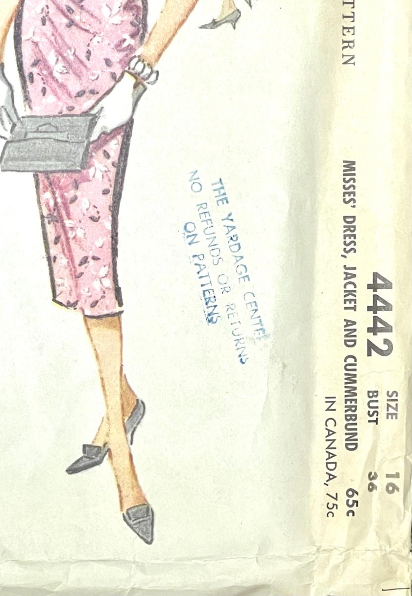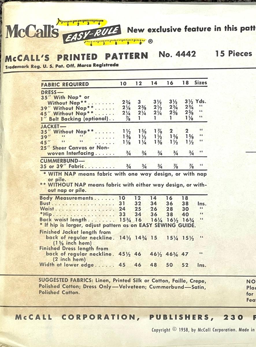 McCall’s Misses’ Dress, Jacket and Cummerbund No. 4442 size 16 bust 36 1958. All pieces verified.