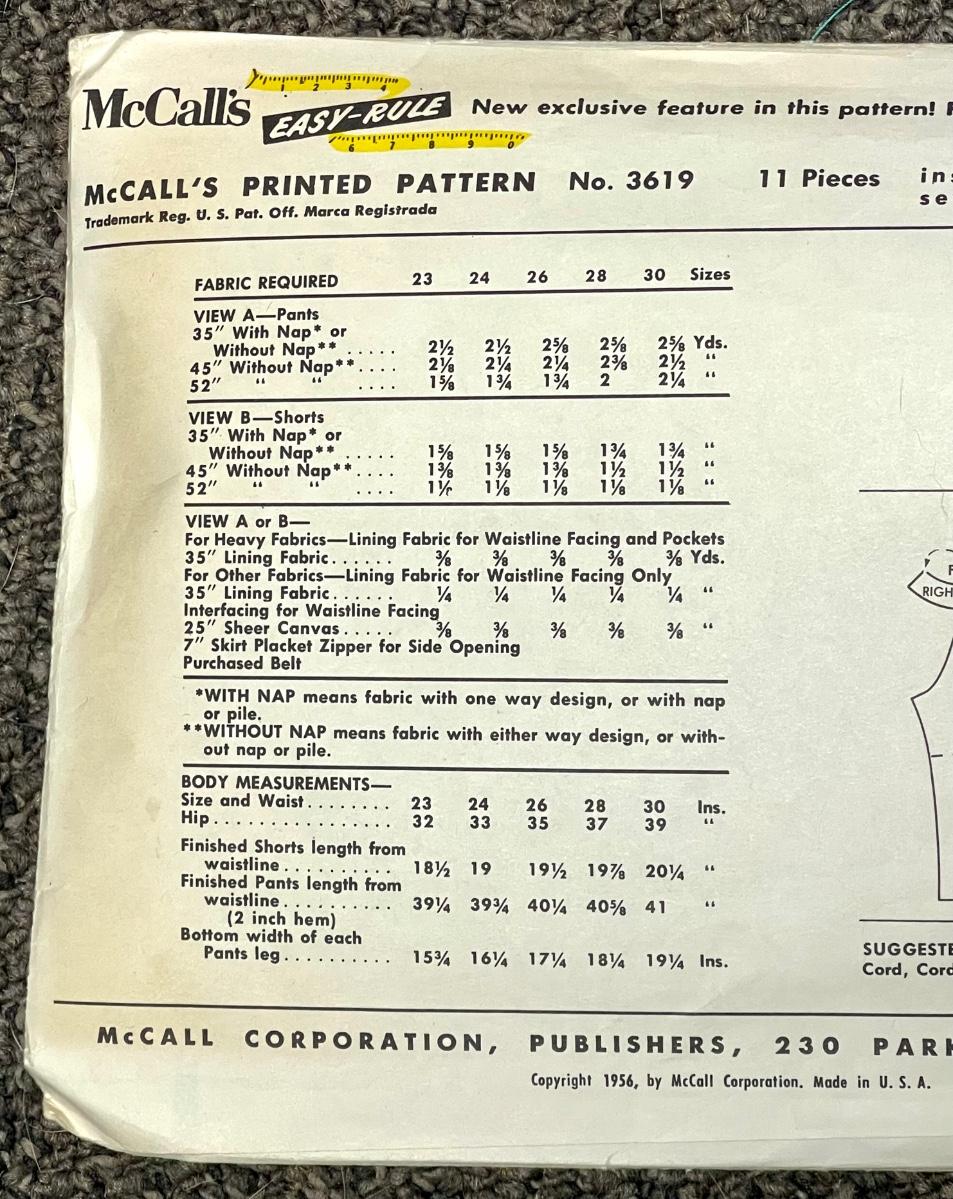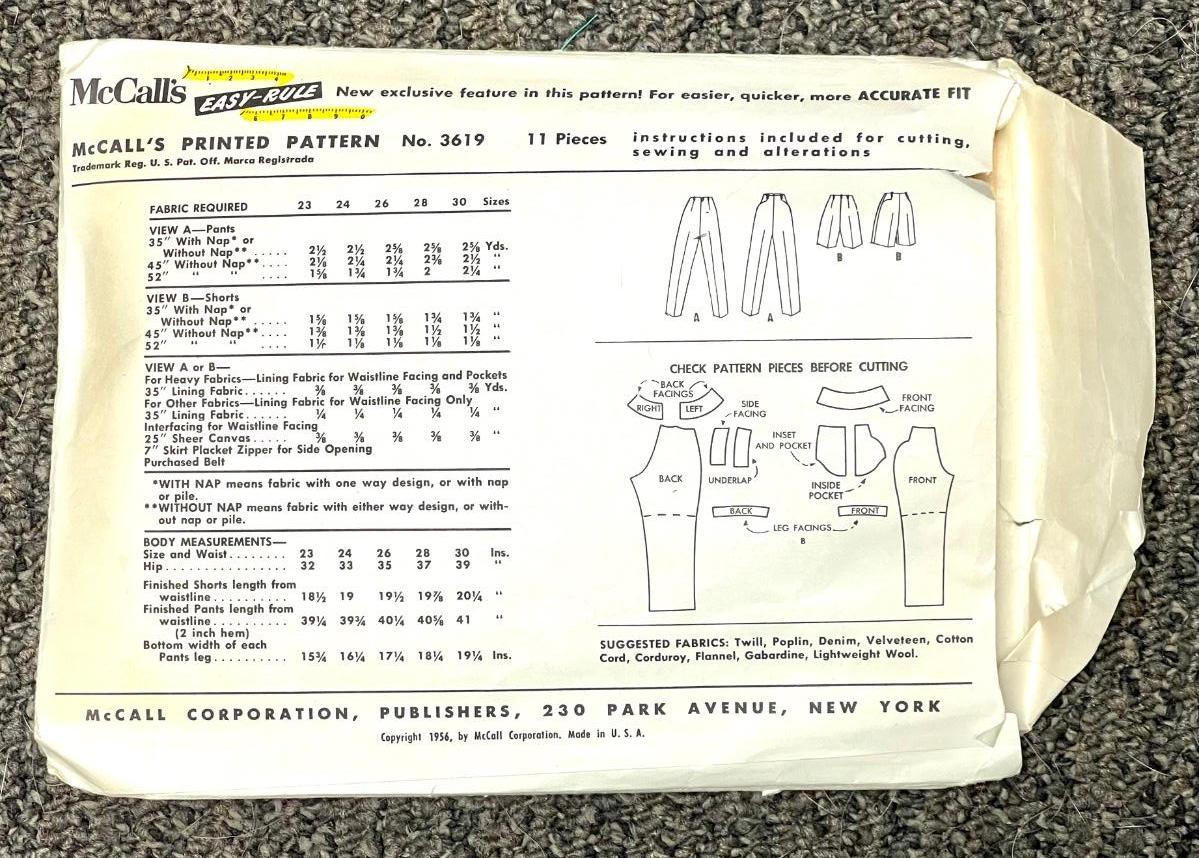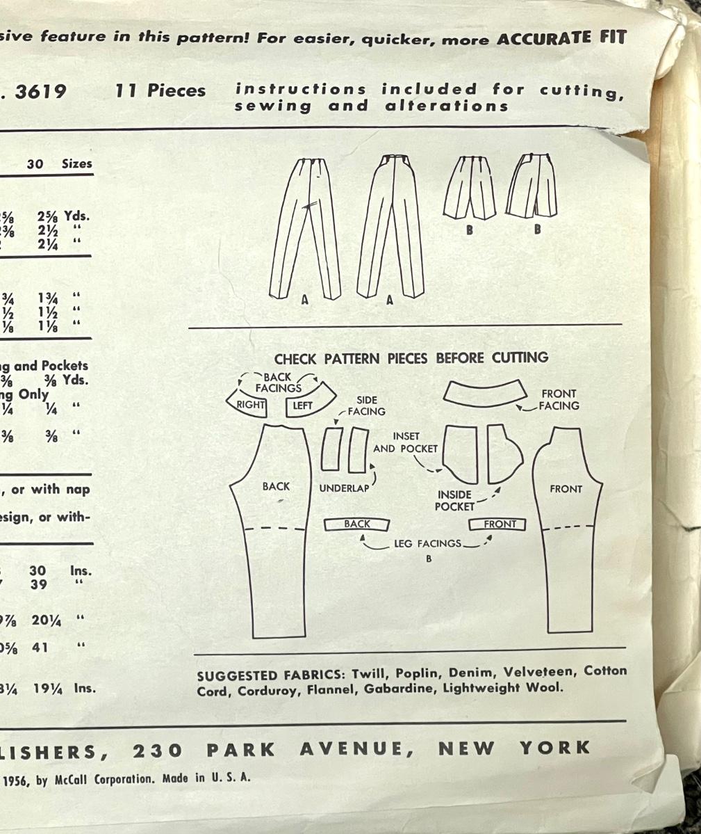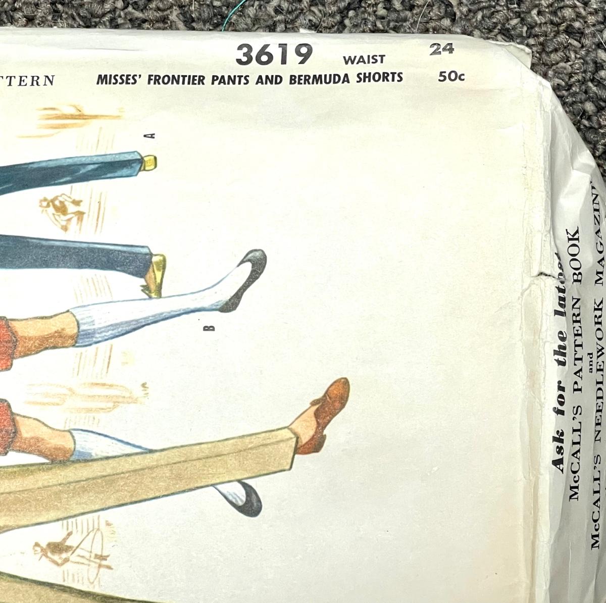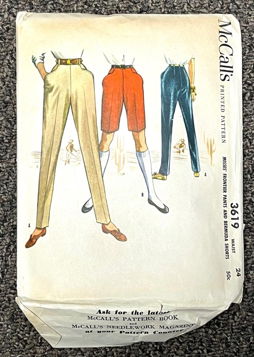 McCall’s Misses’ Frontier Pants and Bermuda Shorts No. 3619 1956. Missing Inside Pocket and Side Facing pieces.
