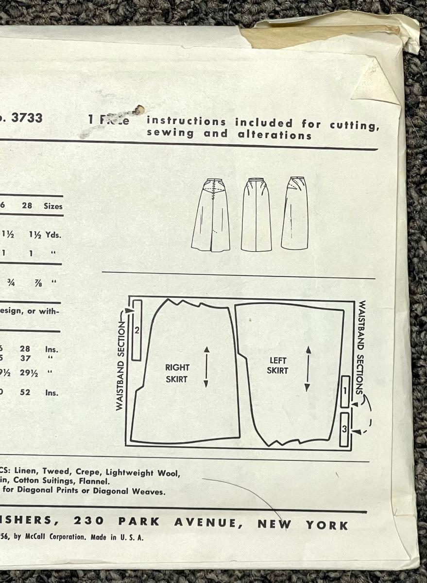 McCall’s Misses’ One Yard, One Pattern Piece Skirt No. 3733 waist 24 hip 33 1956. All pieces verified.