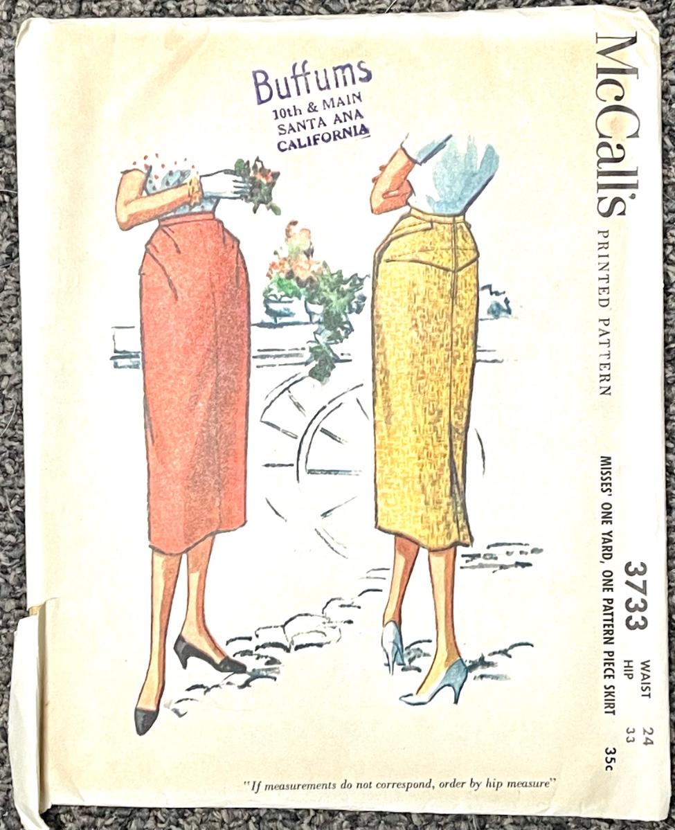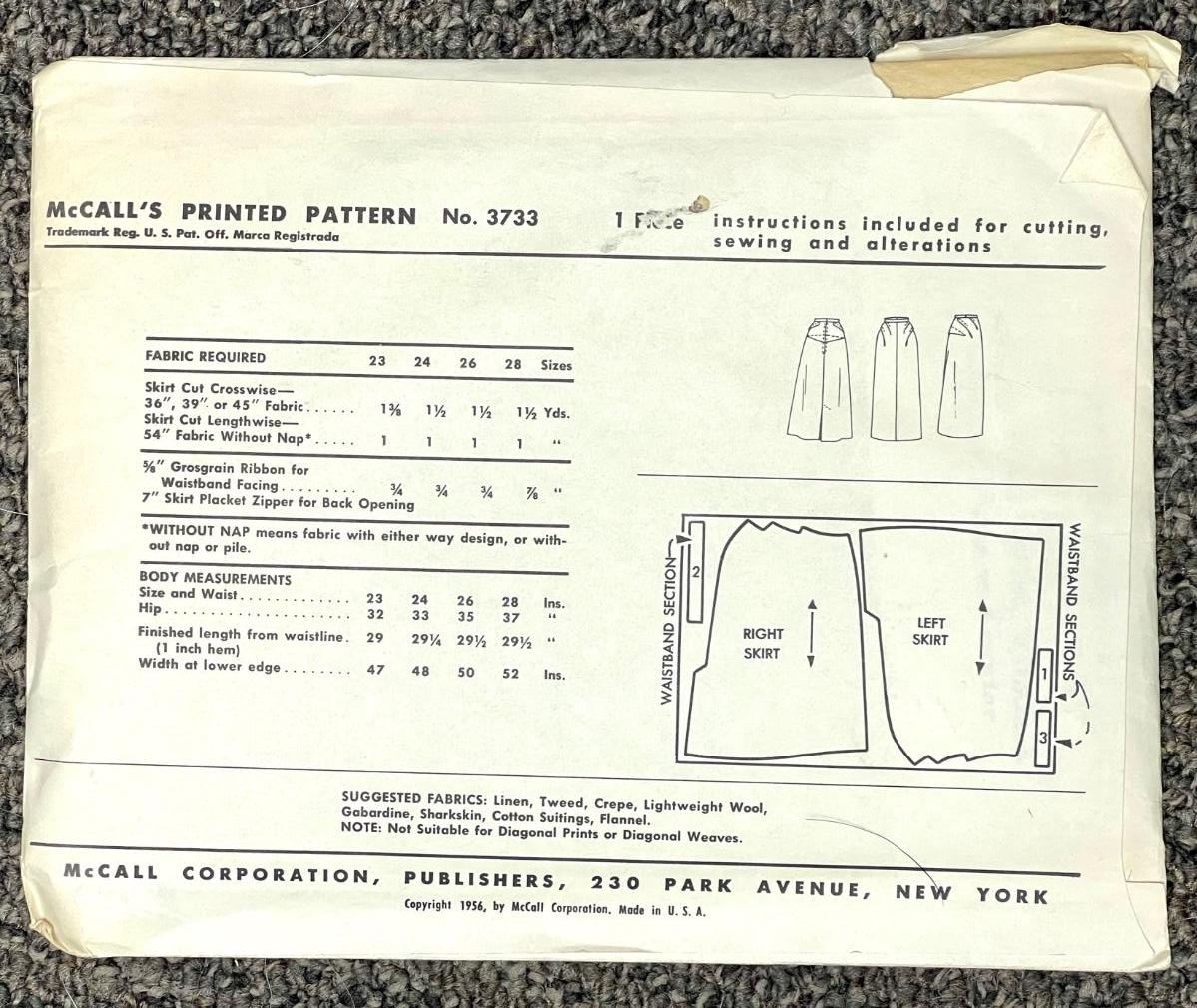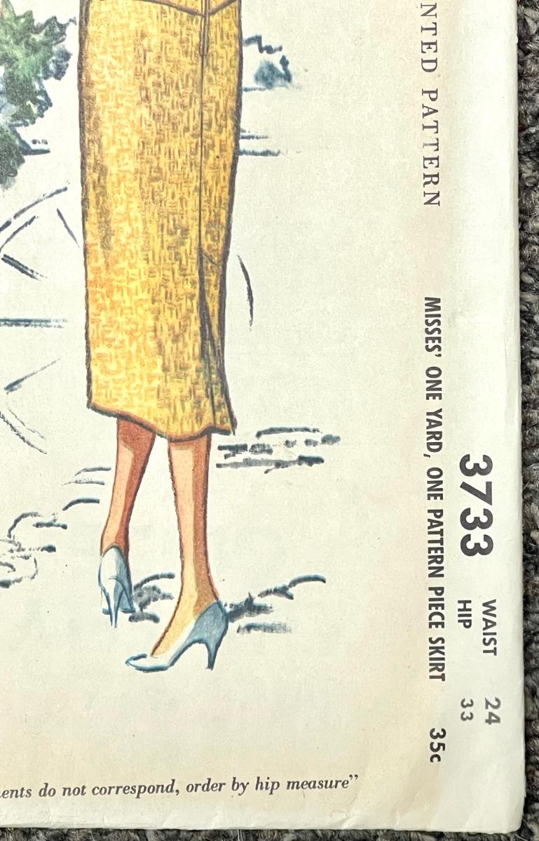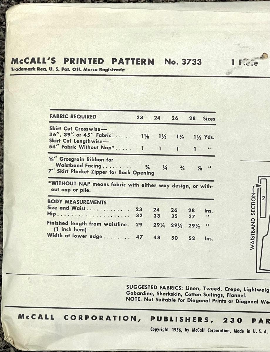 McCall’s Misses’ One Yard, One Pattern Piece Skirt No. 3733 waist 24 hip 33 1956. All pieces verified.
