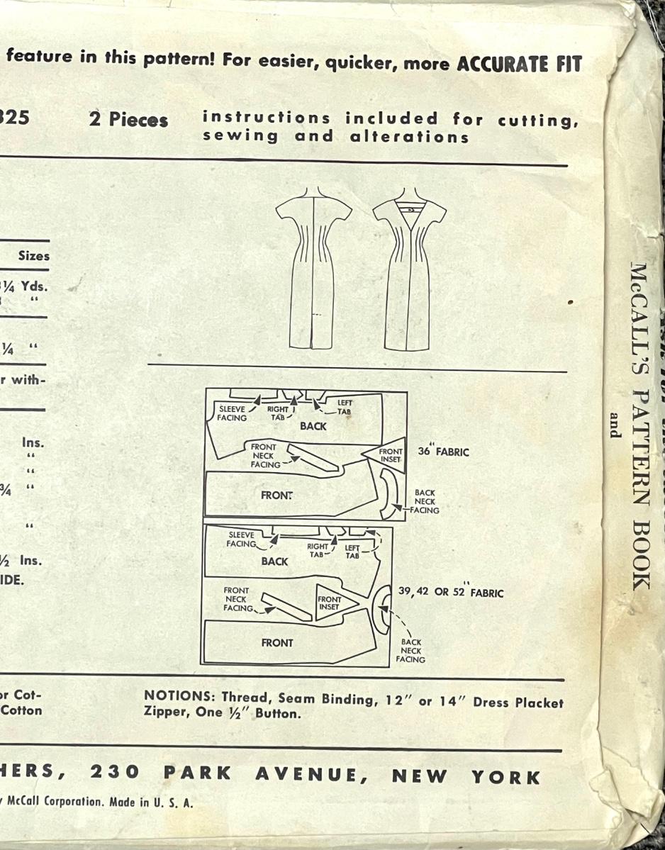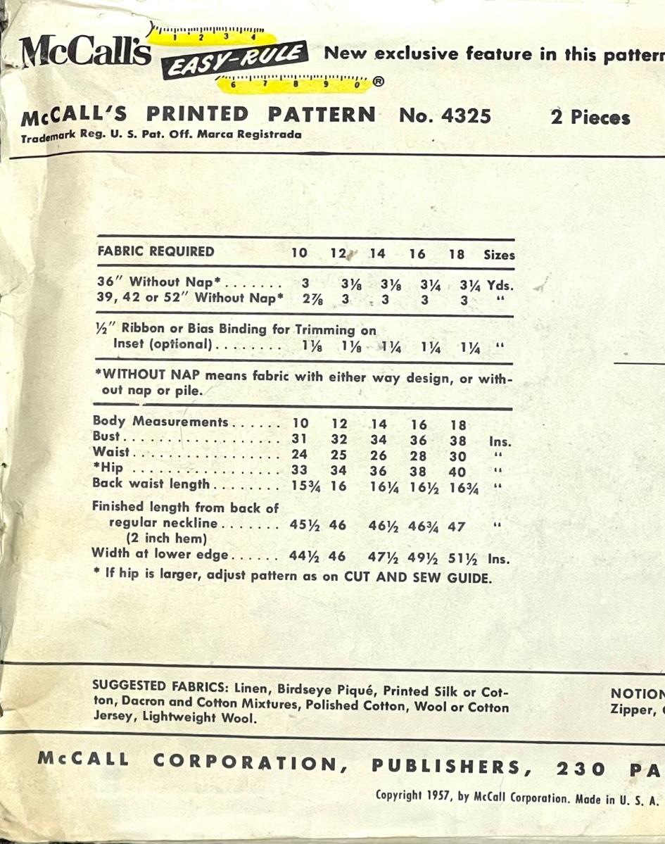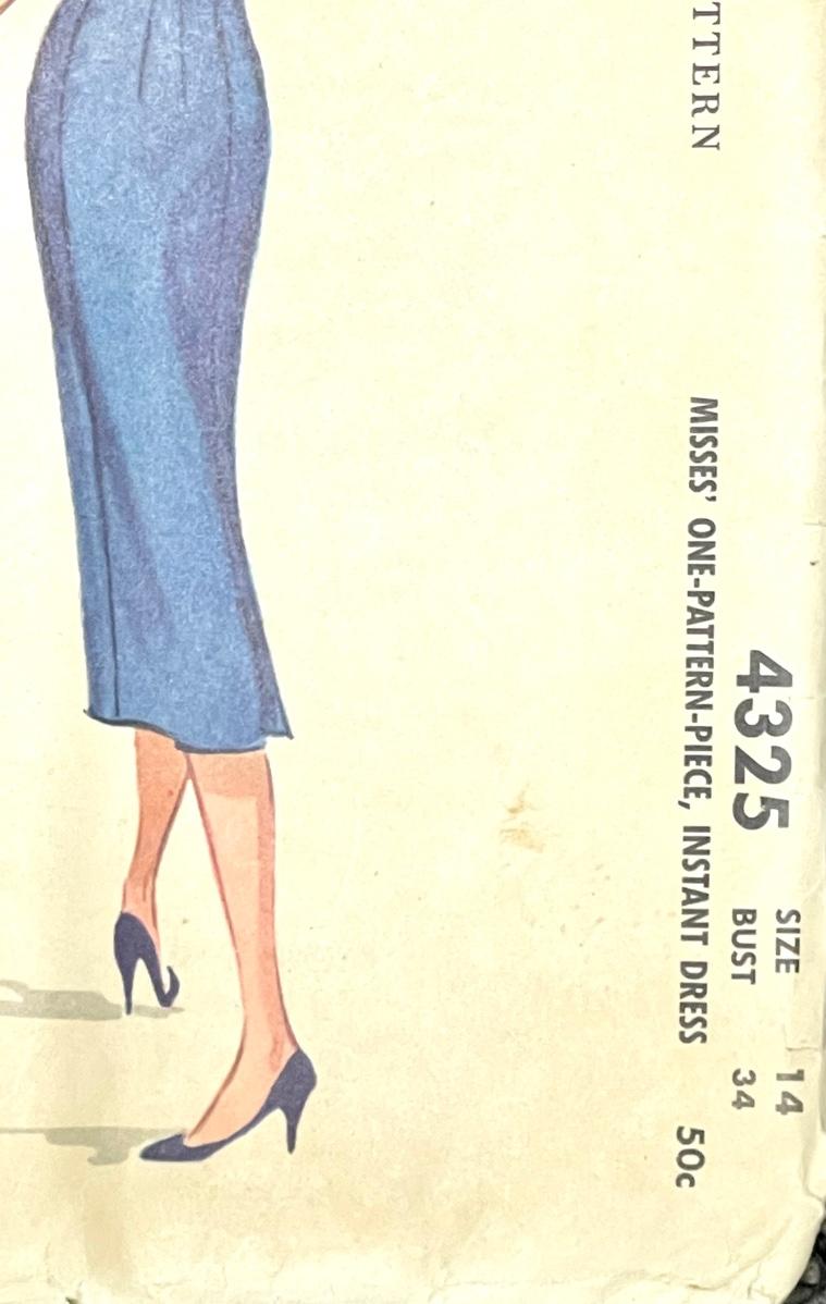 McCall’s Misses’ One-Pattern-Piece, Instant Dress size 14 bust 34 1957