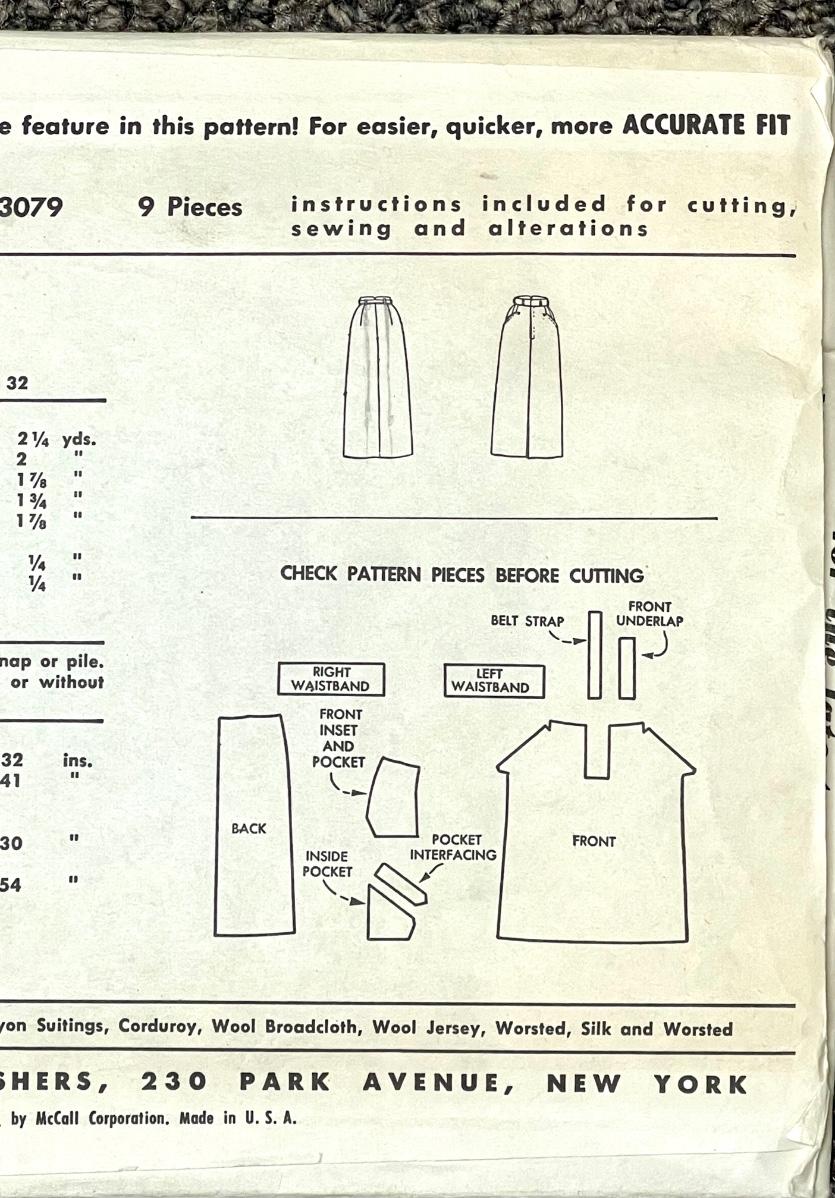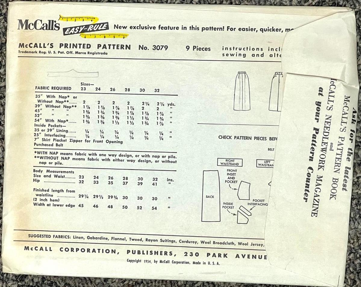 McCall’s Misses’ Skirt No. 3079 waist 24 1954. All pieces verified.