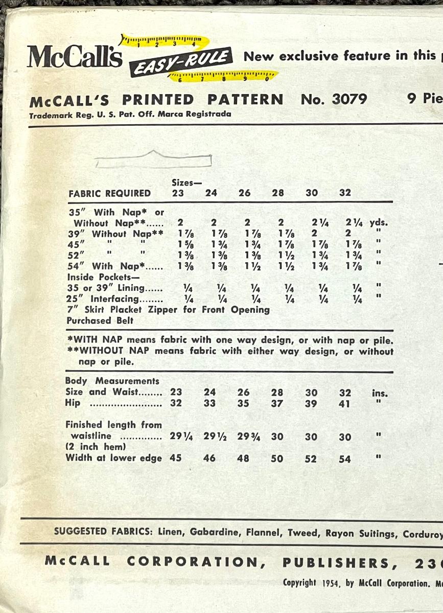 McCall’s Misses’ Skirt No. 3079 waist 24 1954. All pieces verified.