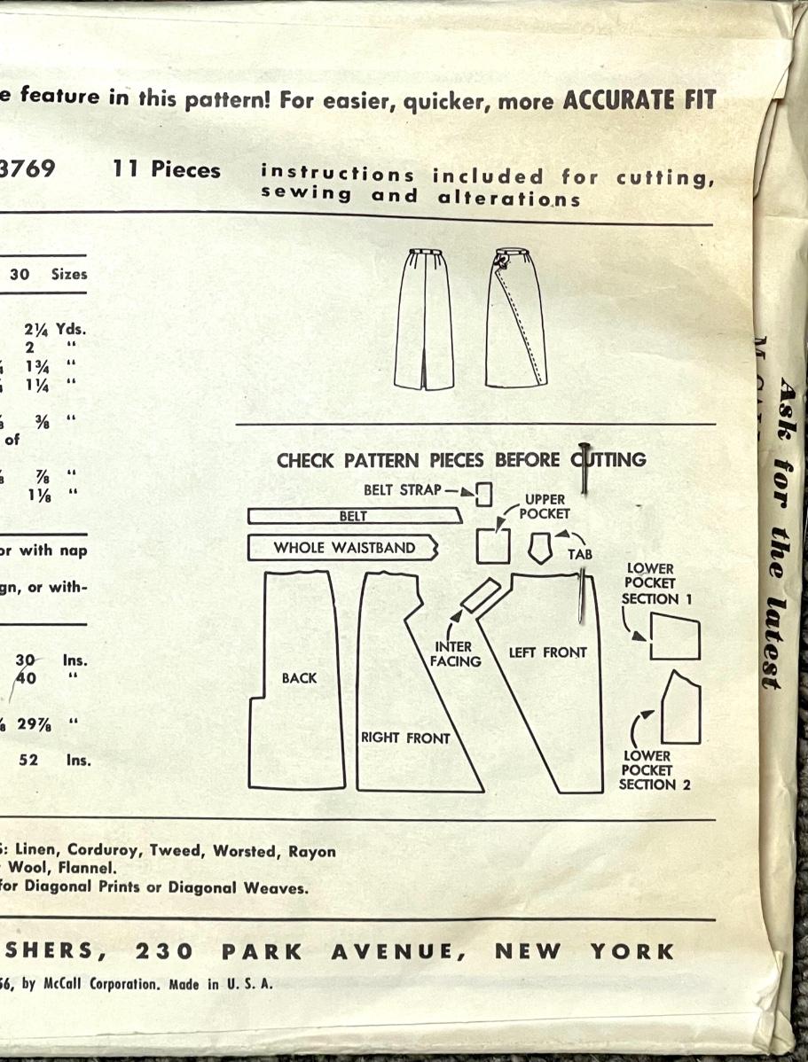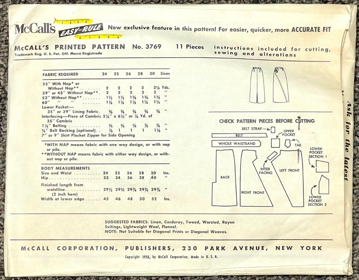 McCall’s Misses’ Skirt No. 3769 waist 28 1956. All pieces verified.