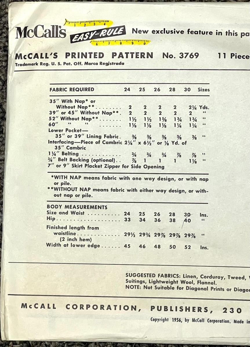 McCall’s Misses’ Skirt No. 3769 waist 28 1956. All pieces verified.