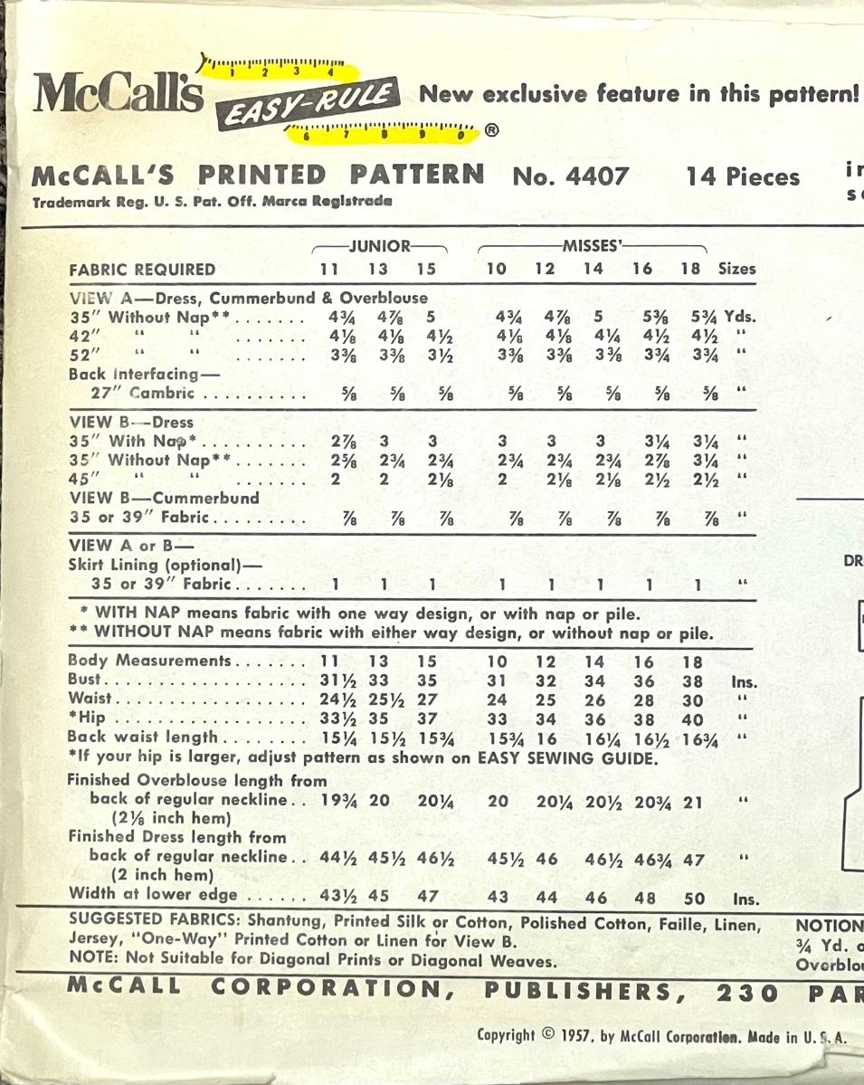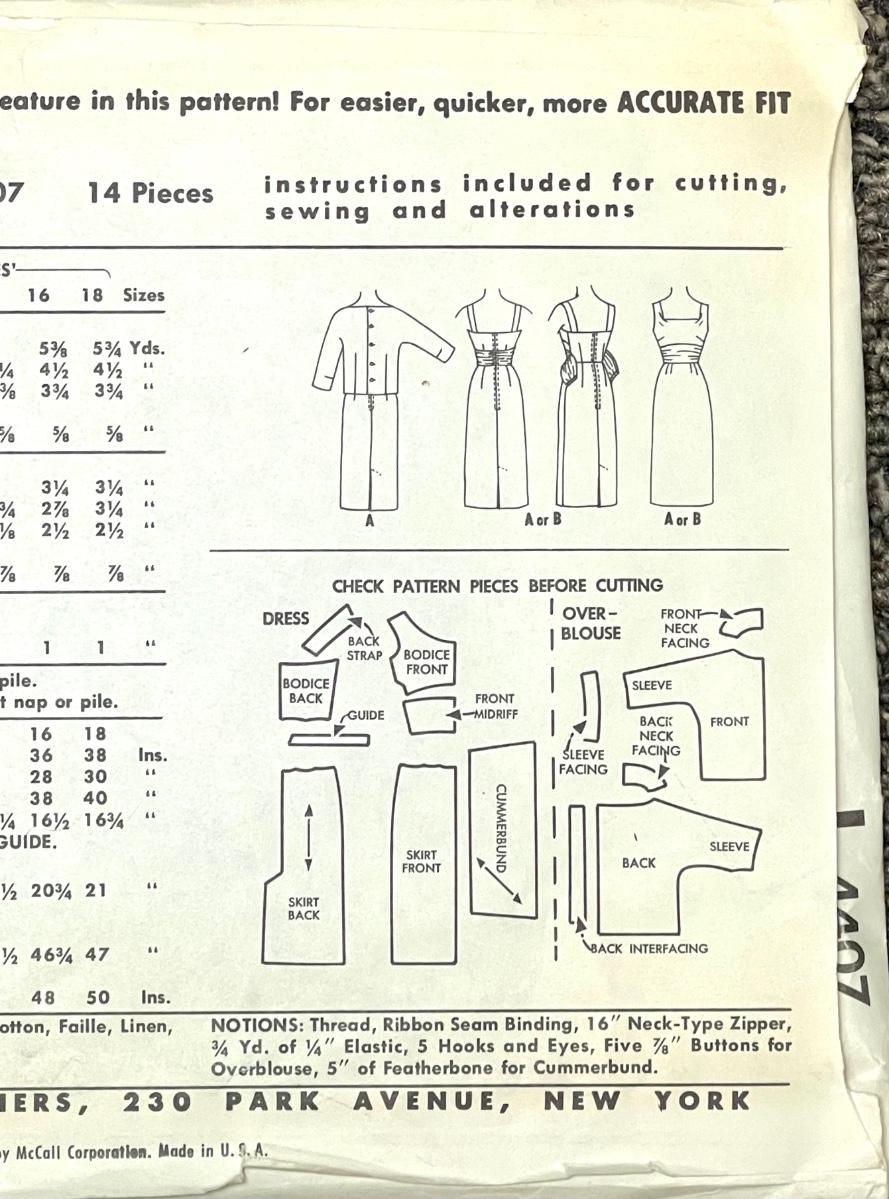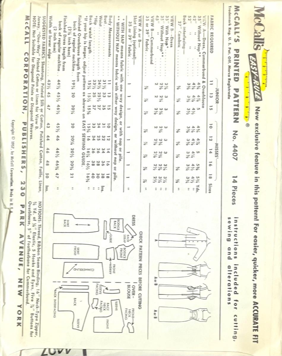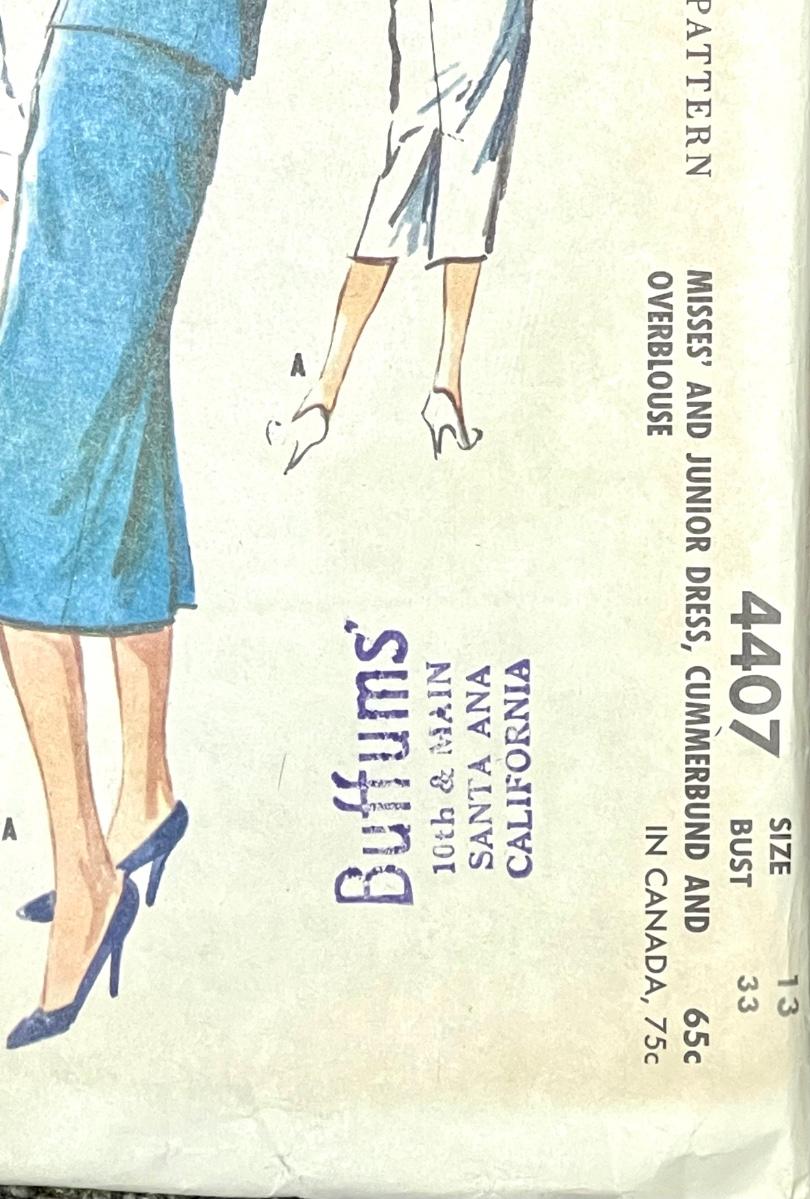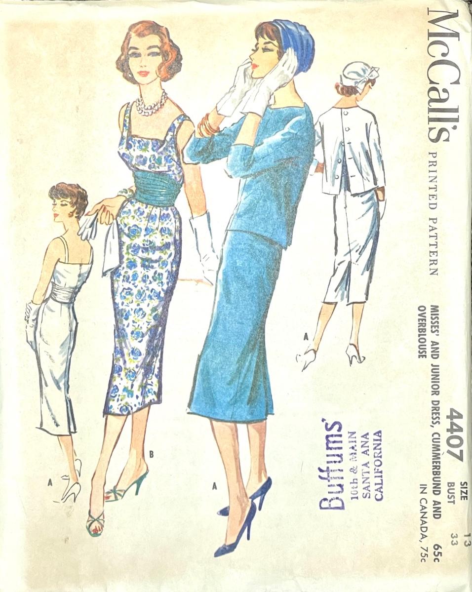 McCall’s Printed Pattern Misses’ and Junior Dress, Cummerbund and Overblouse No. 4407 size 13 bust 33 1957. All pieces verified.