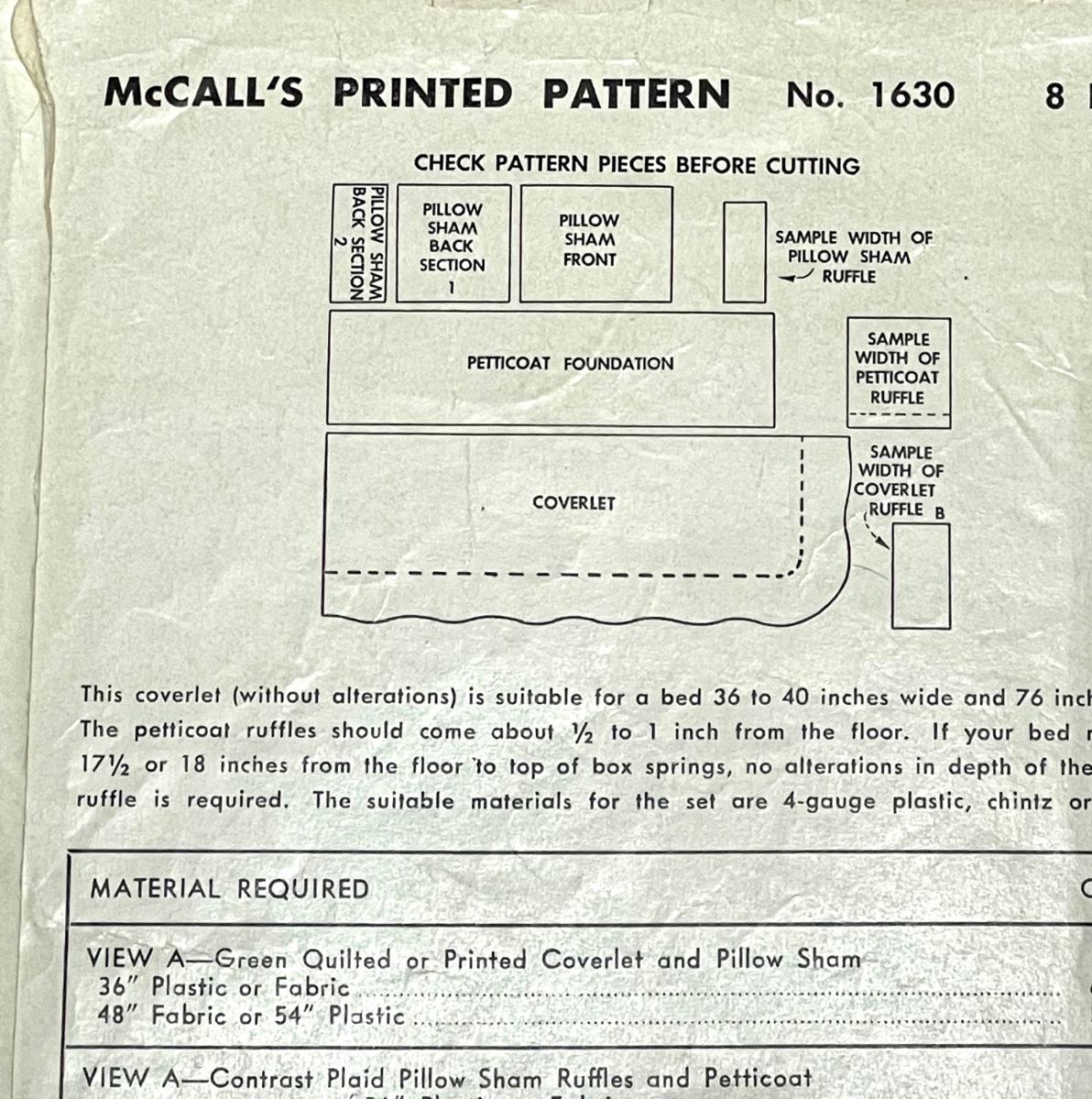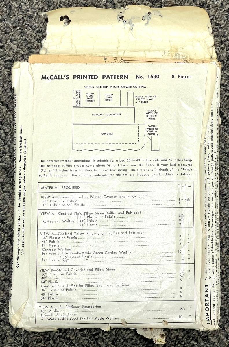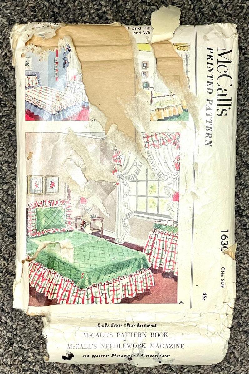 McCall’s Printed Pattern No. 1630 one size bedding set 1951. All pieces verified. Envelope opened, torn, in used condition.