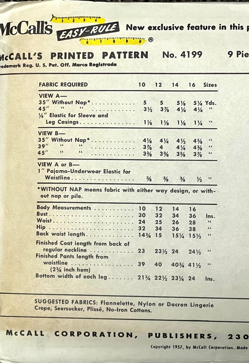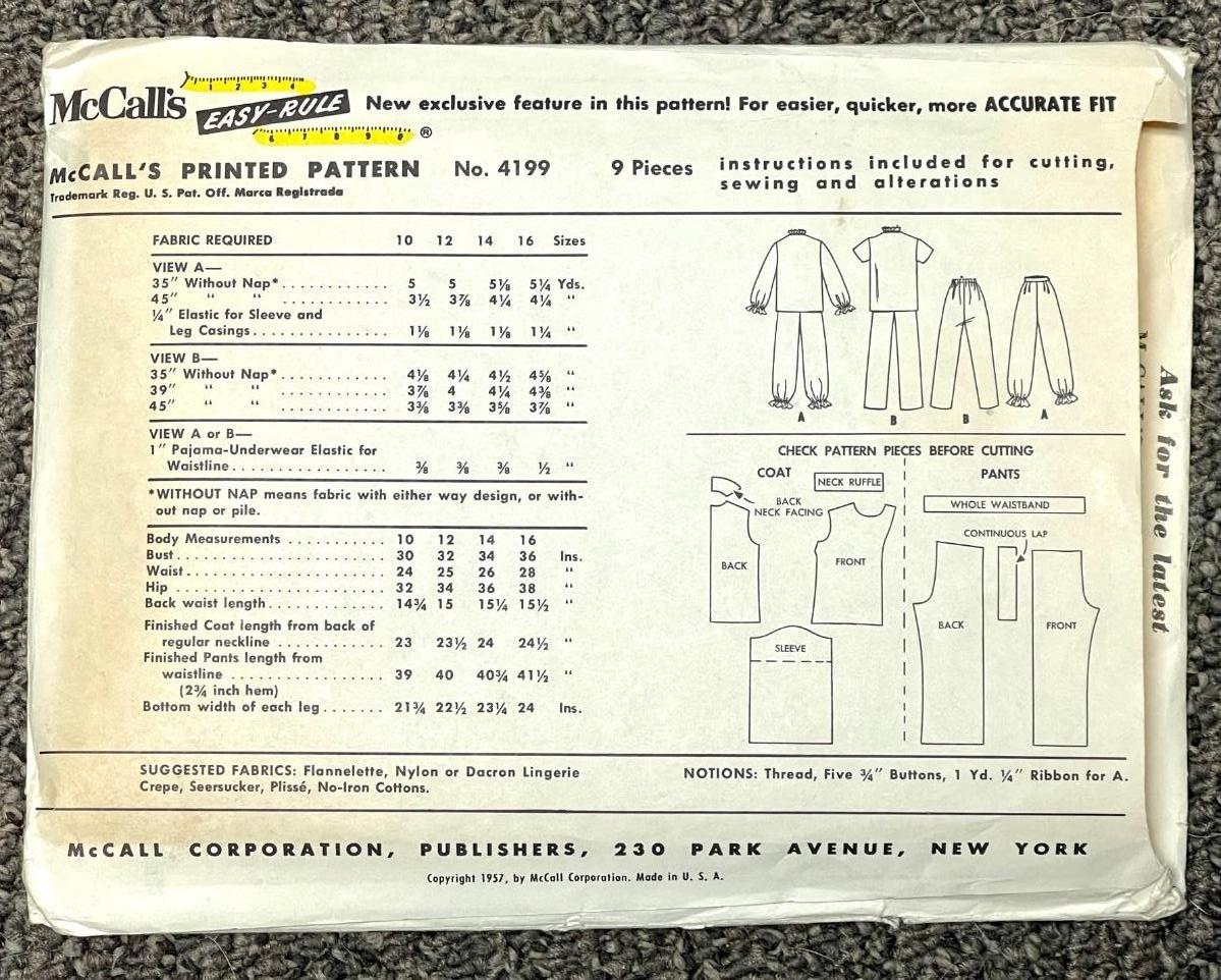 McCall’s Teen Girl's Pajamas No. 4199 size 14 bust 34 1957 vintage sewing pattern