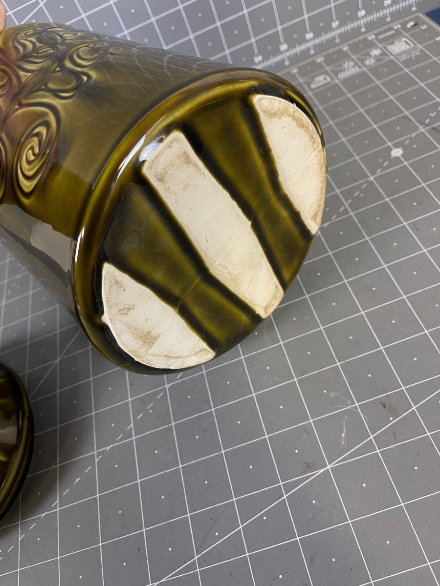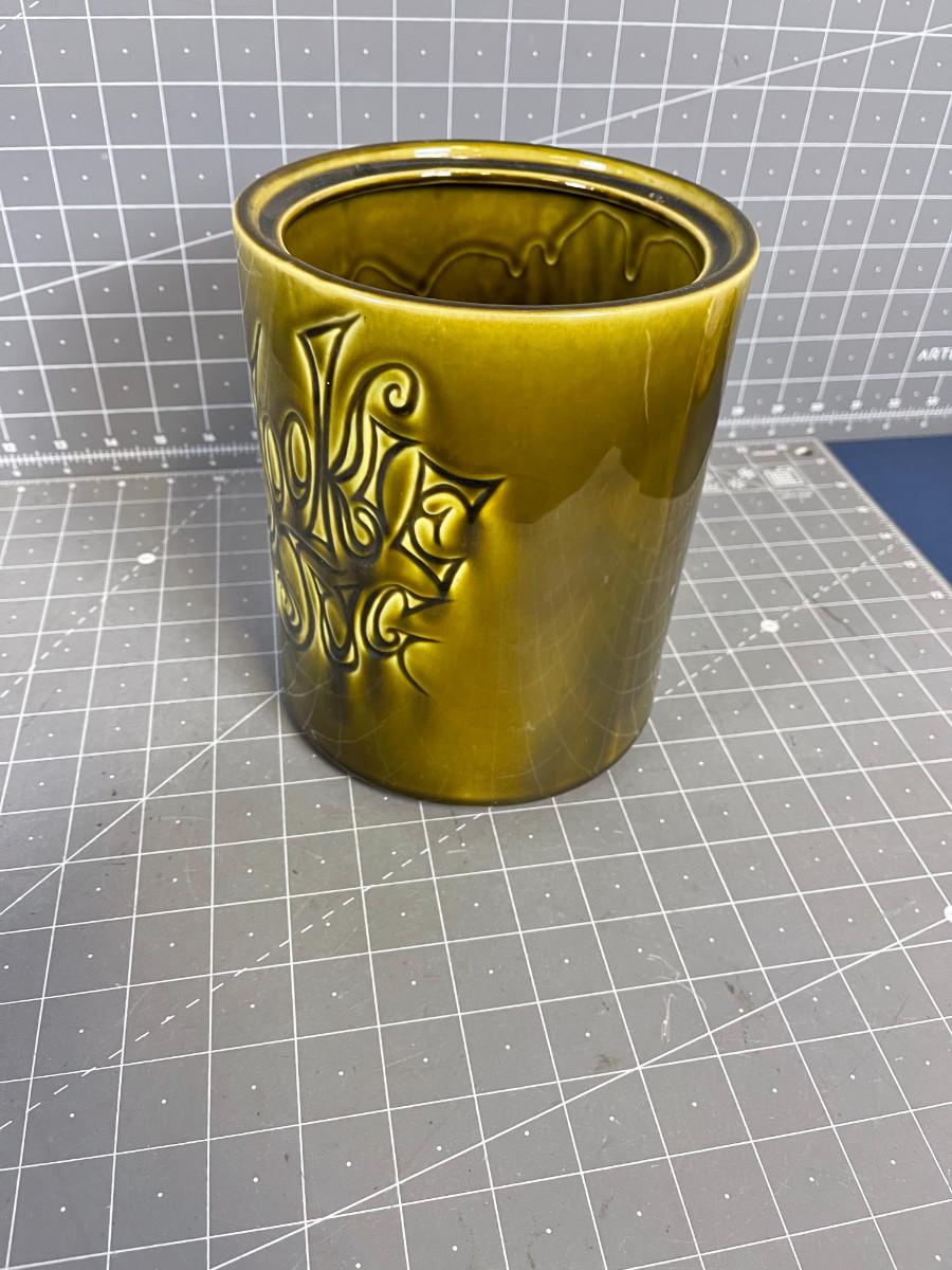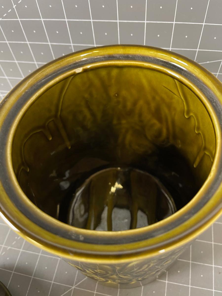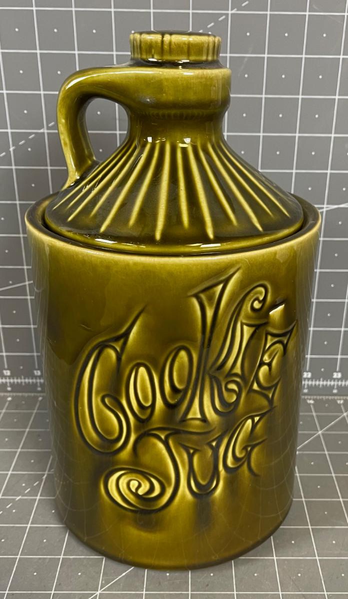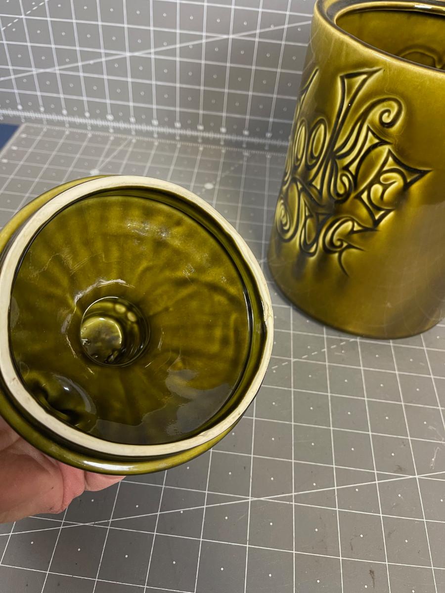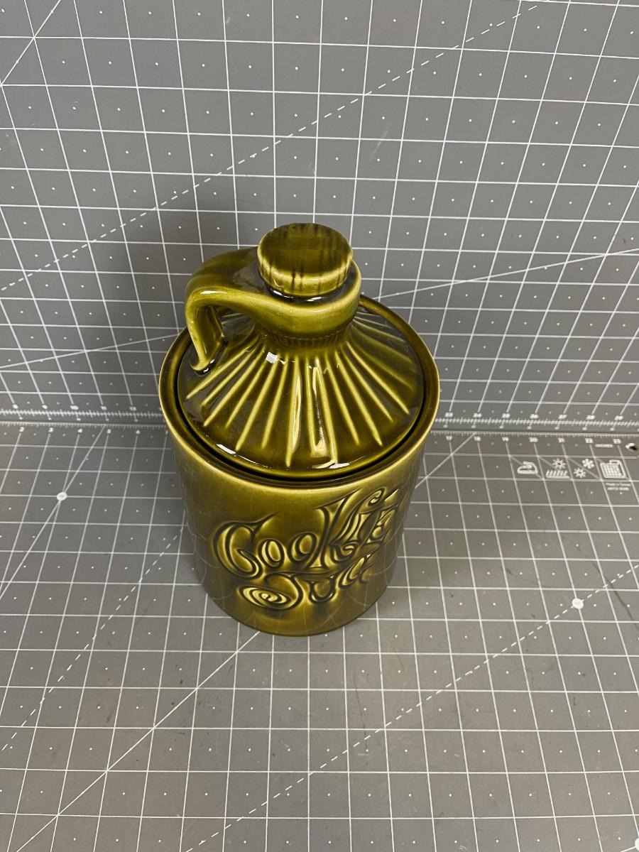 Vintage 1970's cookie jar, awesome avocado green color, small chip in rim of jar, not noticeable with lid on