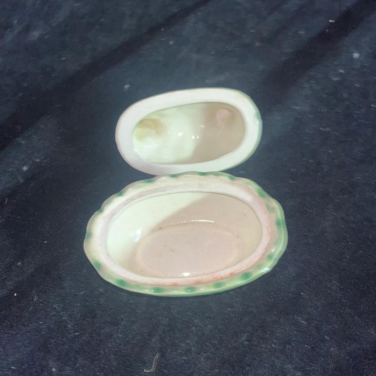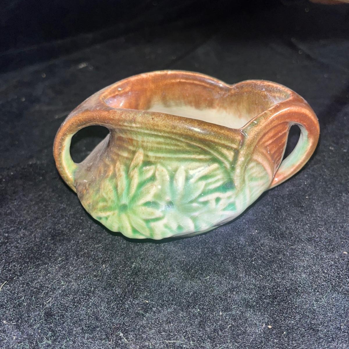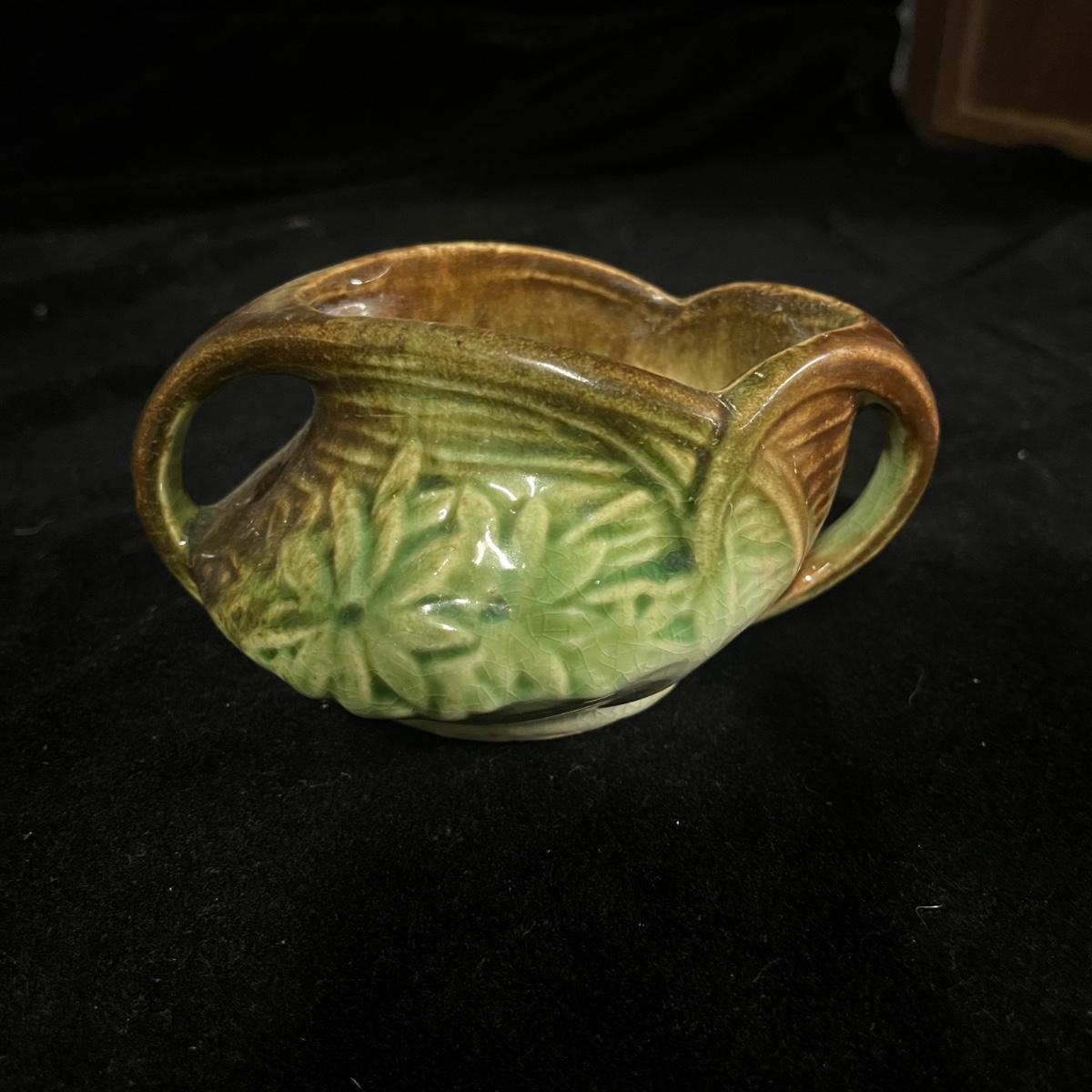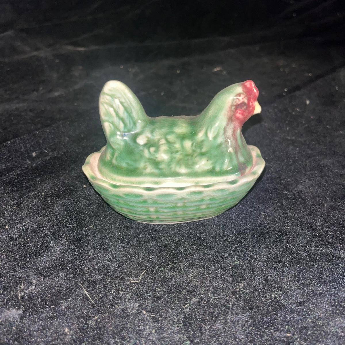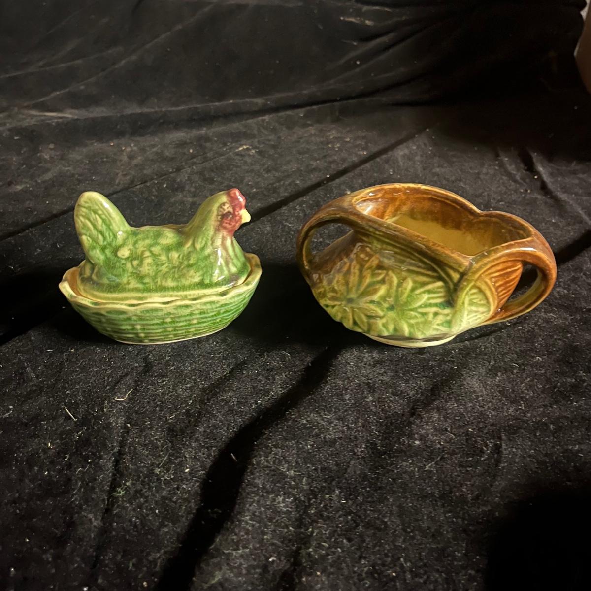 Lot includes a McCoy Daisy pattern sugar bowl that measures 6” x 4” x 3.25”H. Also includes a small lidded hen dish that is made in the USA.