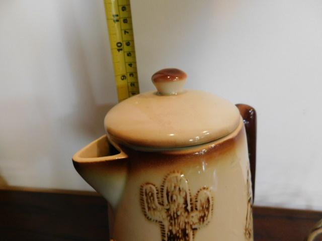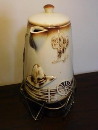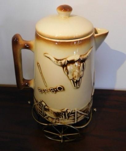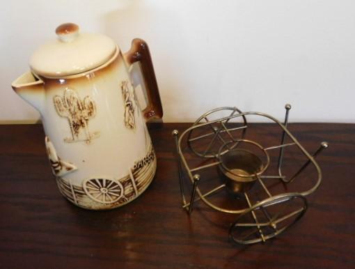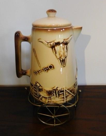 McCoy El Rancho Bar-B-Q Pottery Kettle with Wire Wagon Wheel Sterno Caddy