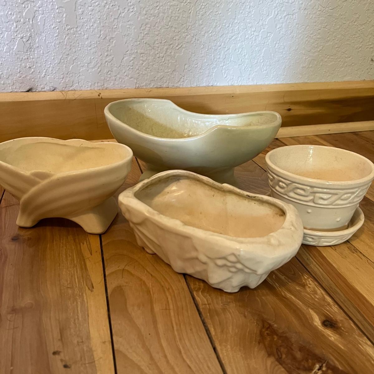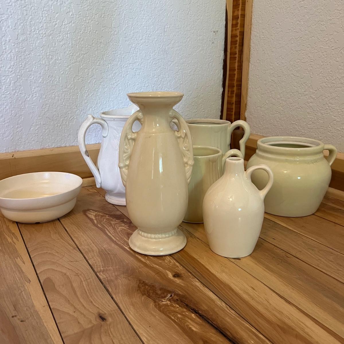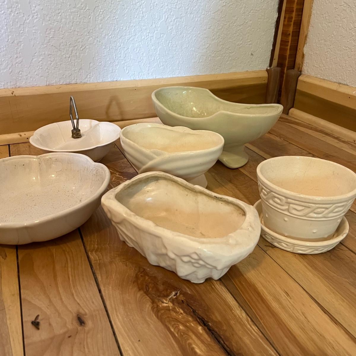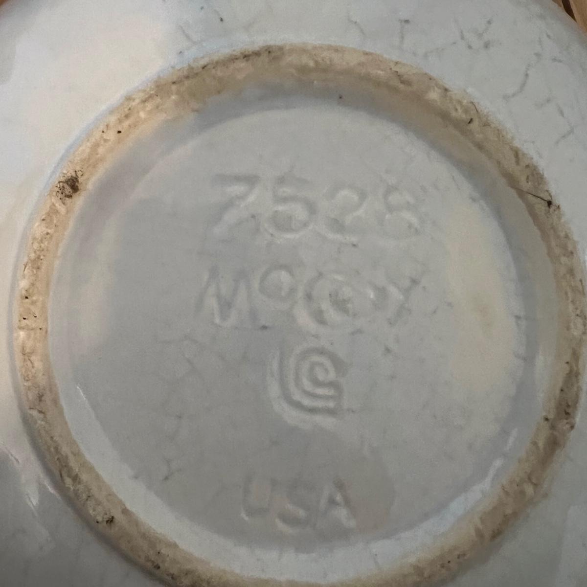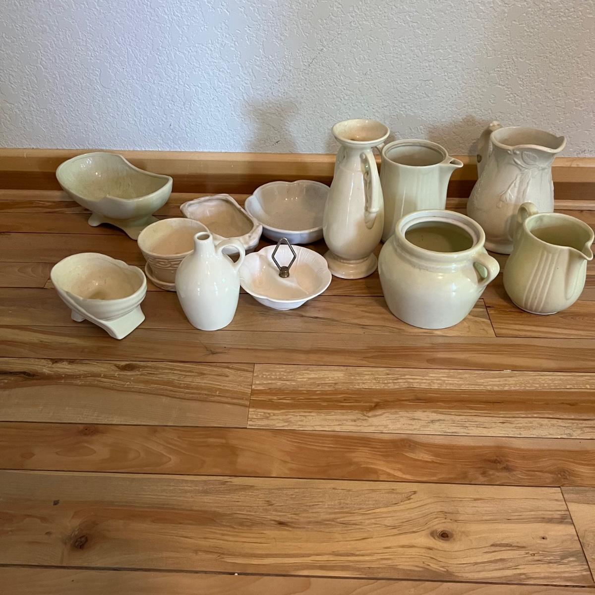 Thirteen pieces in this large assortment of pottery that includes some McCoy items and other pieces with possibly some Hull pieces, see images for all makers marks, etc. A few items have blemishes which are shown in images. Deco style vase is the tallest item measuring 4”D (base) x 11”H.