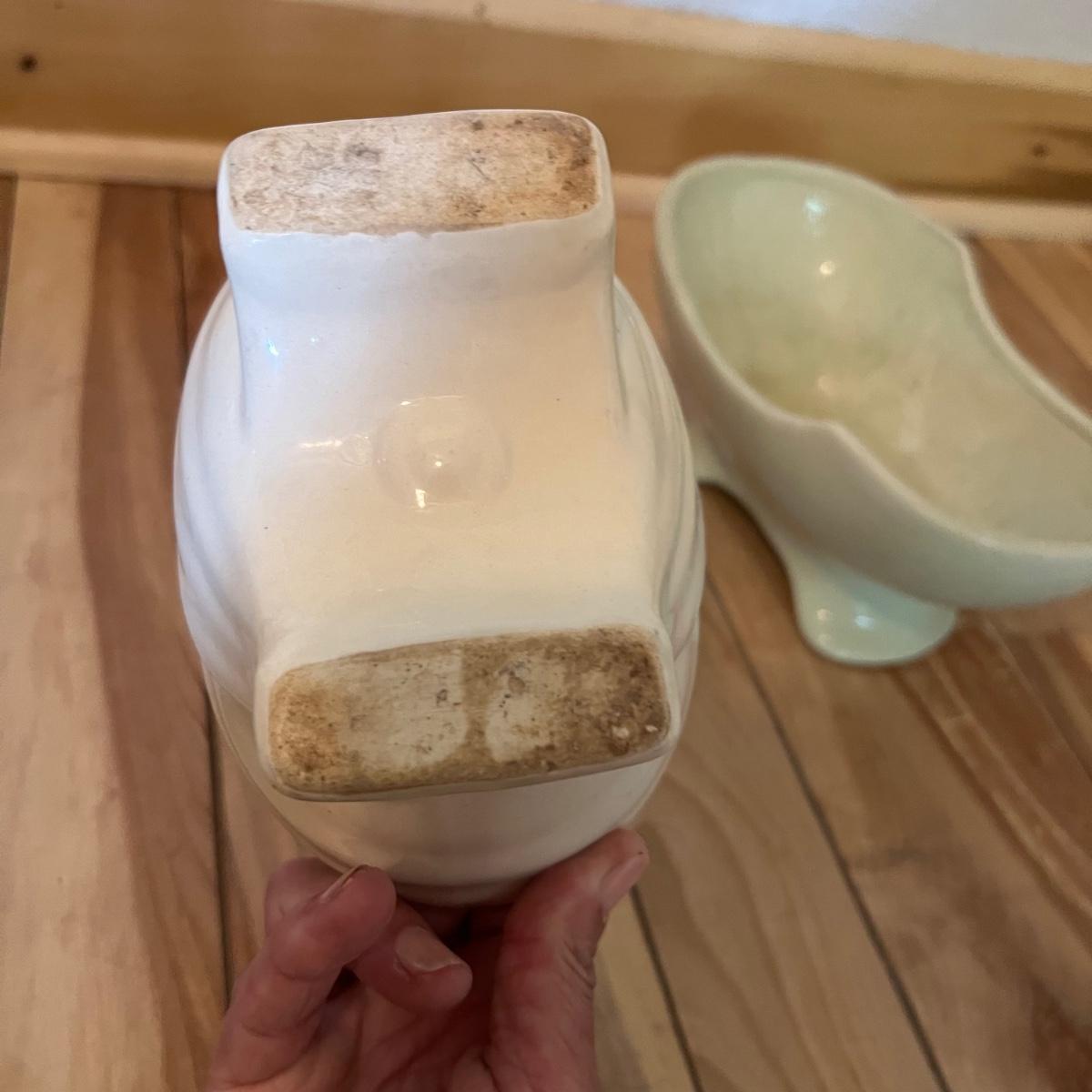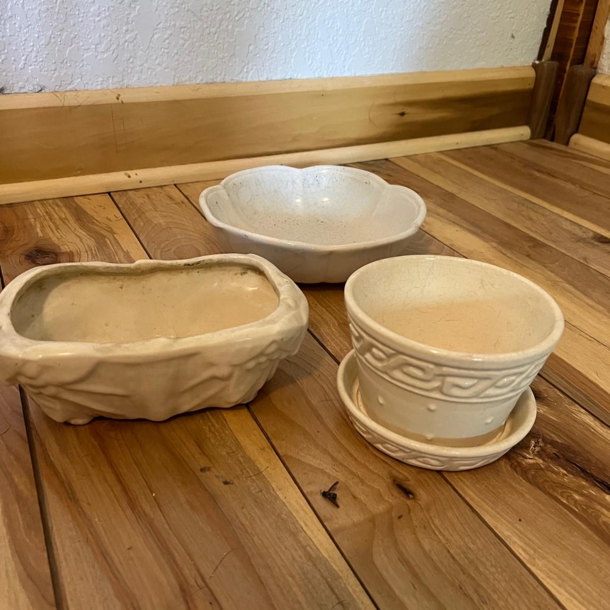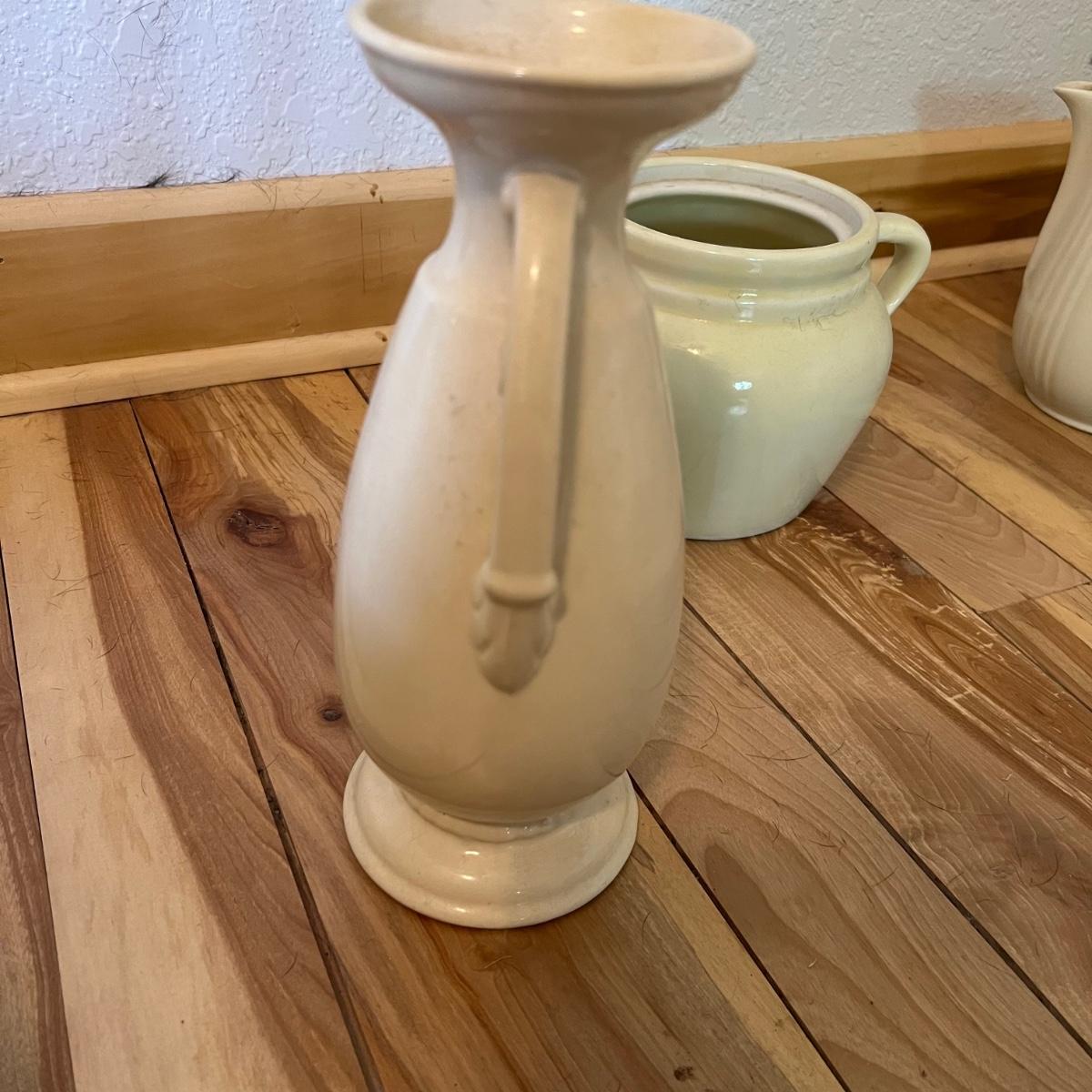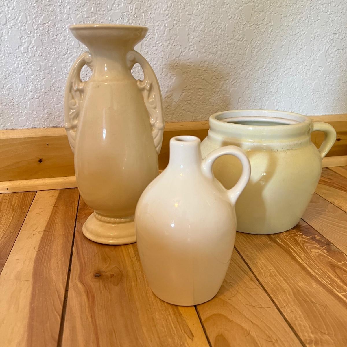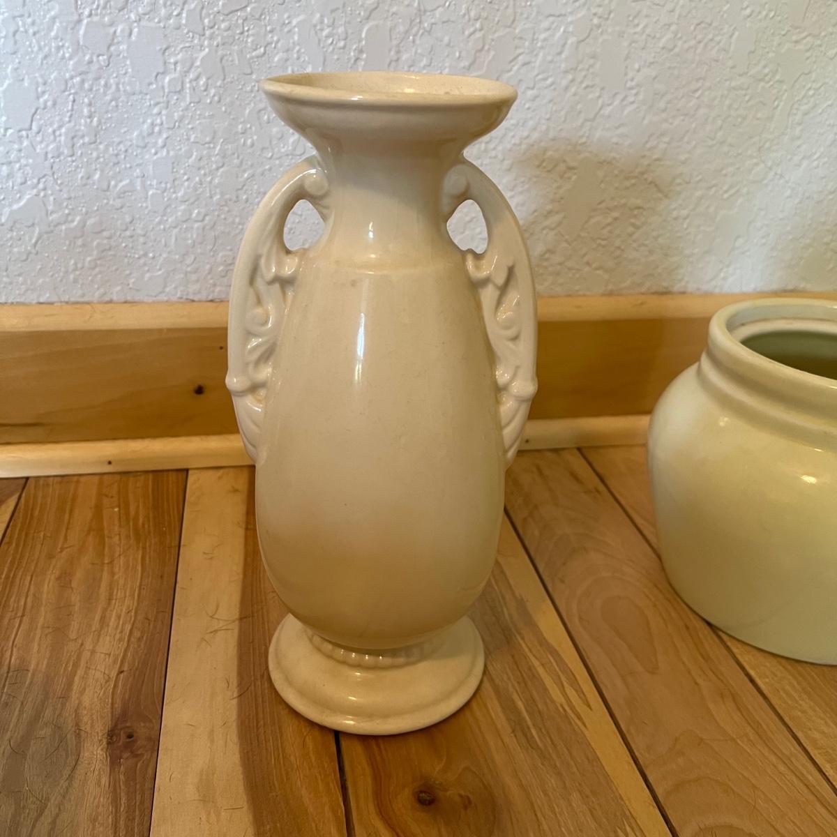 Thirteen pieces in this large assortment of pottery that includes some McCoy items and other pieces with possibly some Hull pieces, see images for all makers marks, etc. A few items have blemishes which are shown in images. Deco style vase is the tallest item measuring 4”D (base) x 11”H.