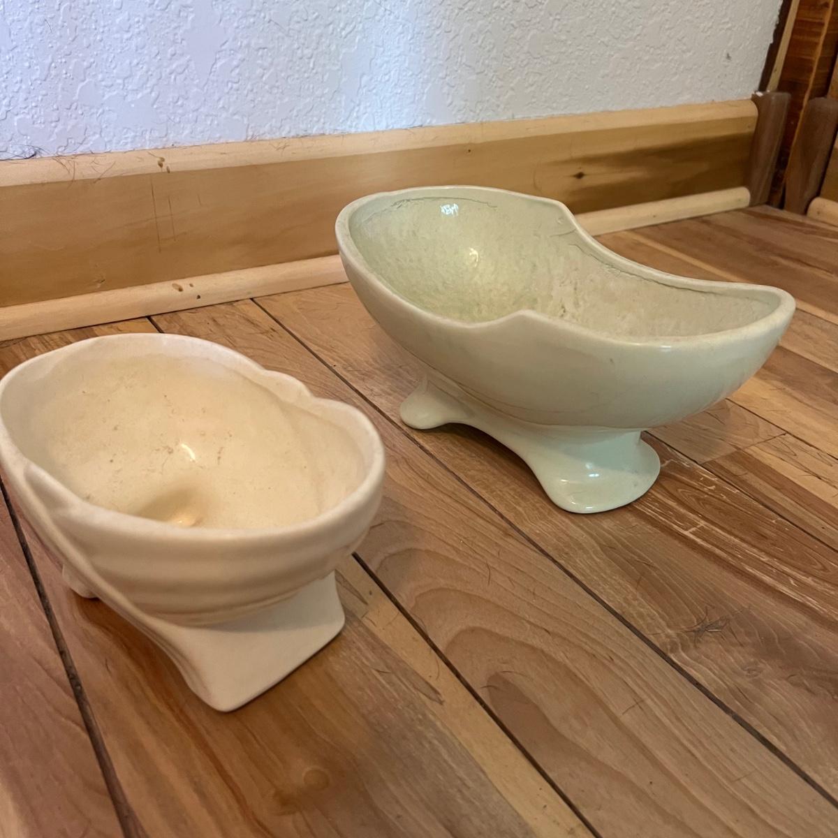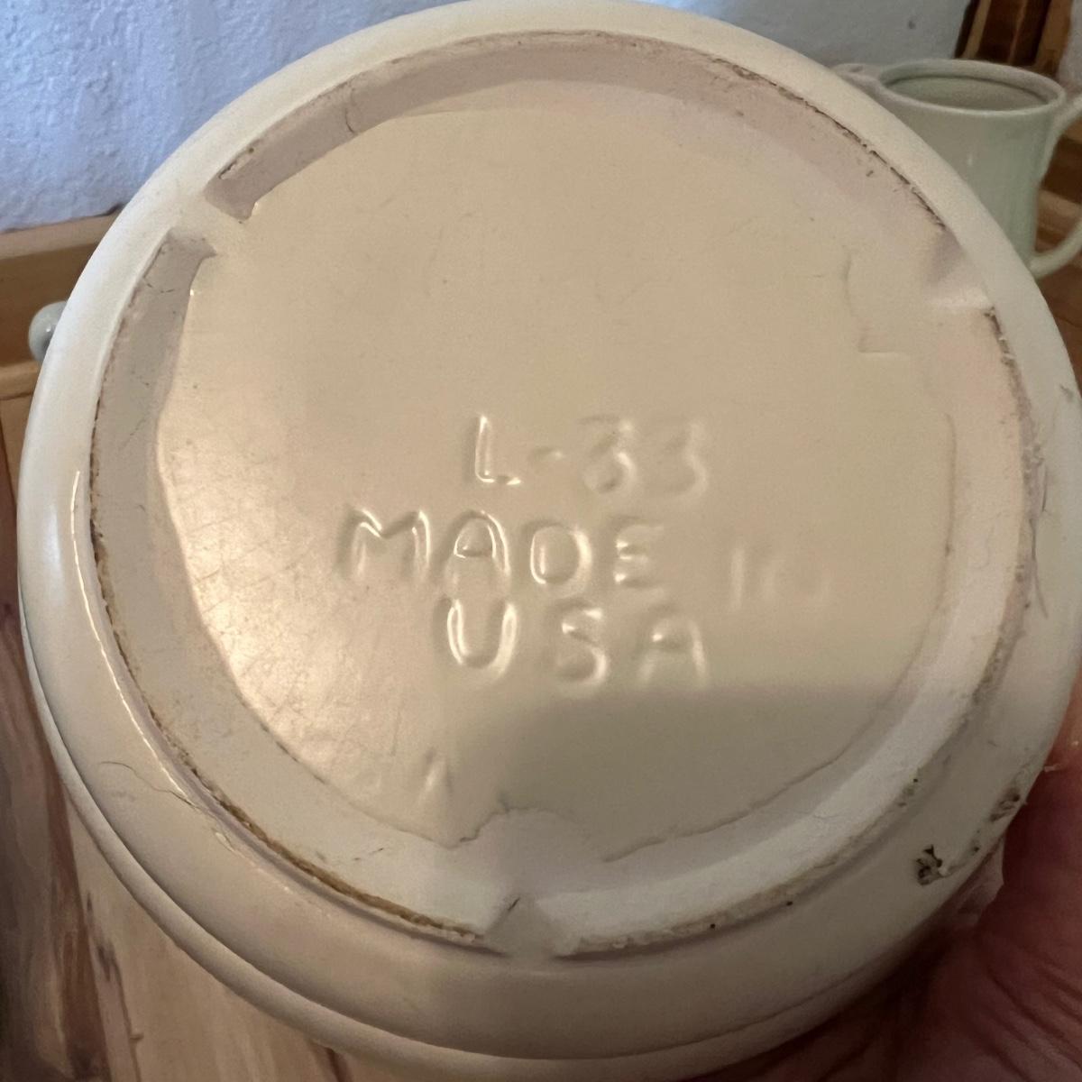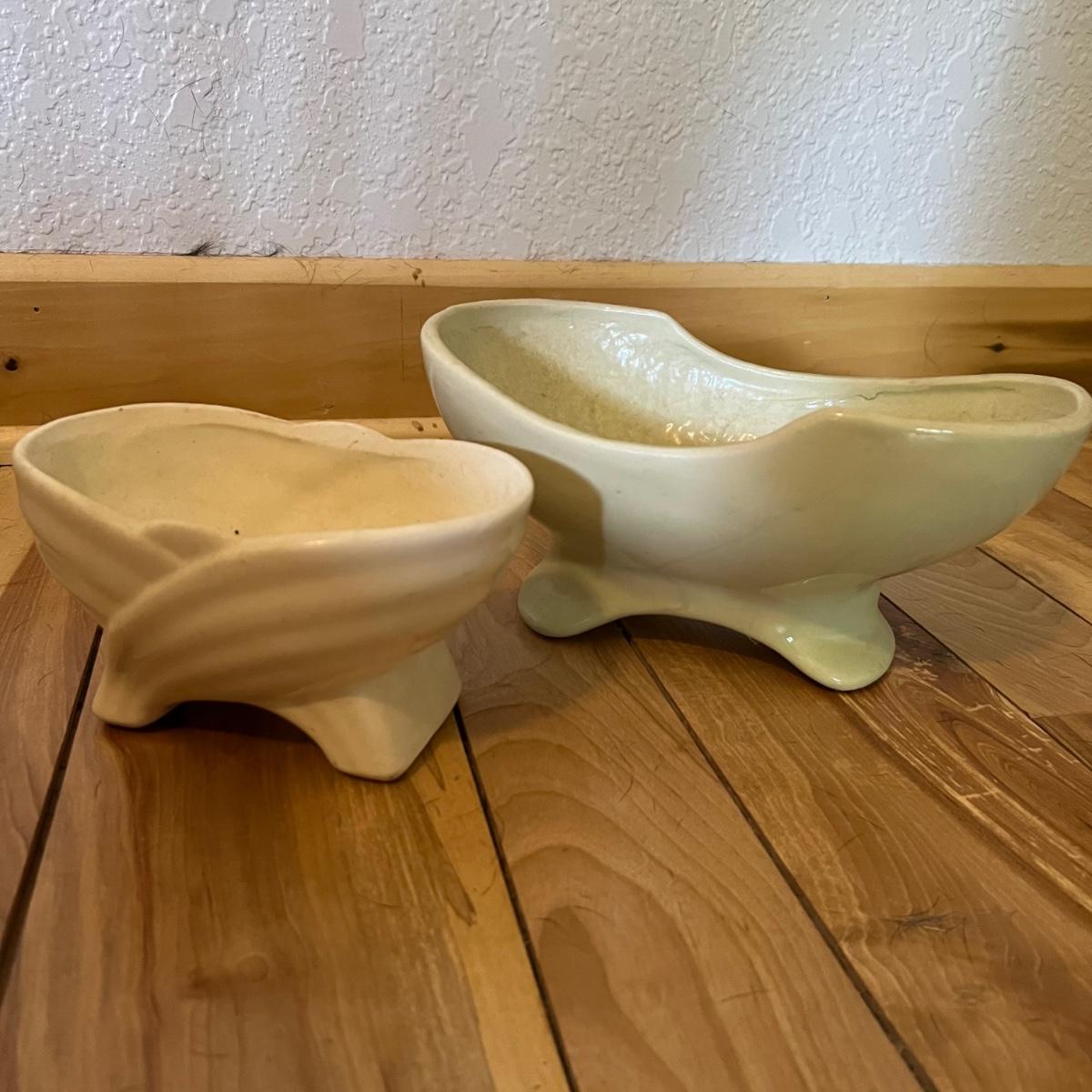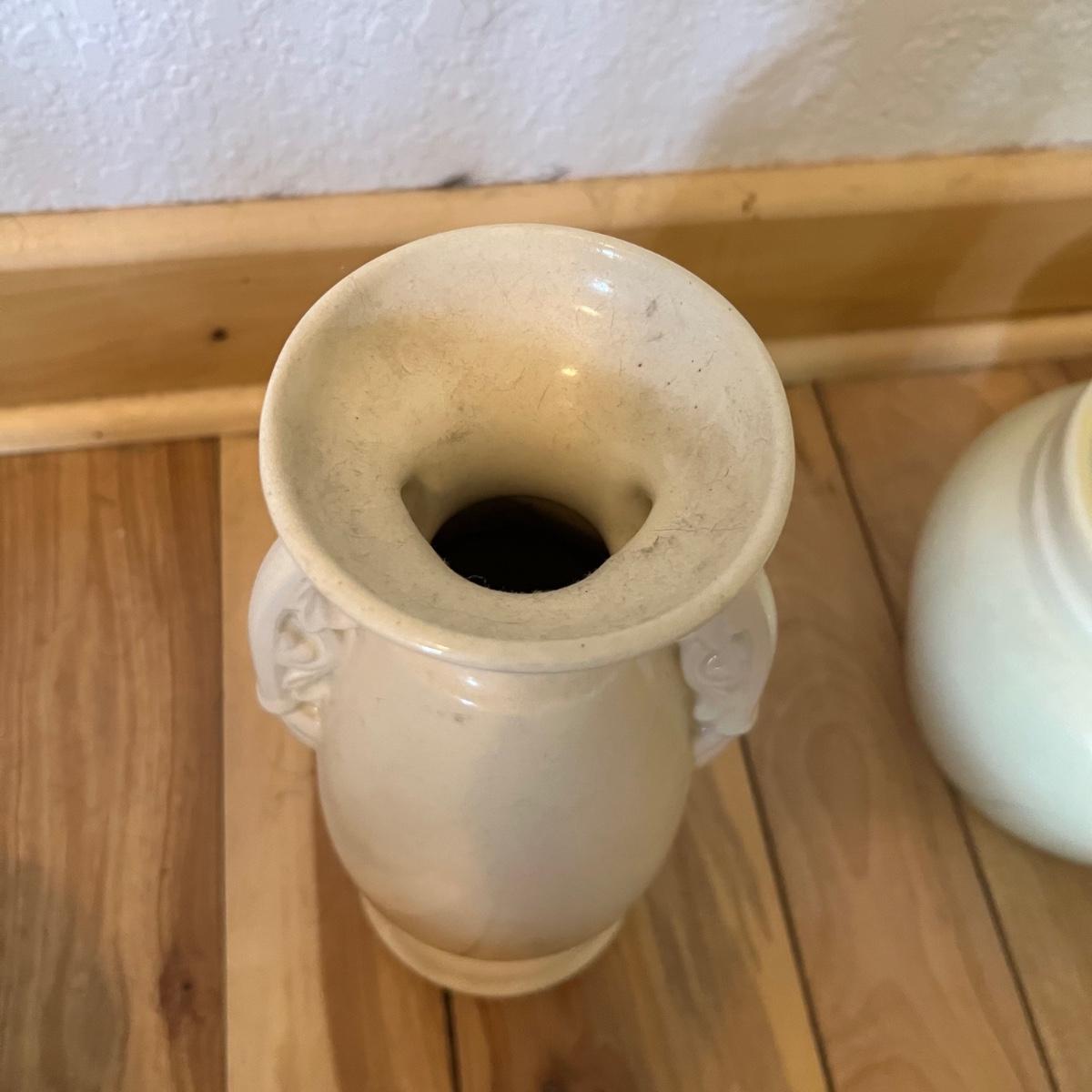 Thirteen pieces in this large assortment of pottery that includes some McCoy items and other pieces with possibly some Hull pieces, see images for all makers marks, etc. A few items have blemishes which are shown in images. Deco style vase is the tallest item measuring 4”D (base) x 11”H.