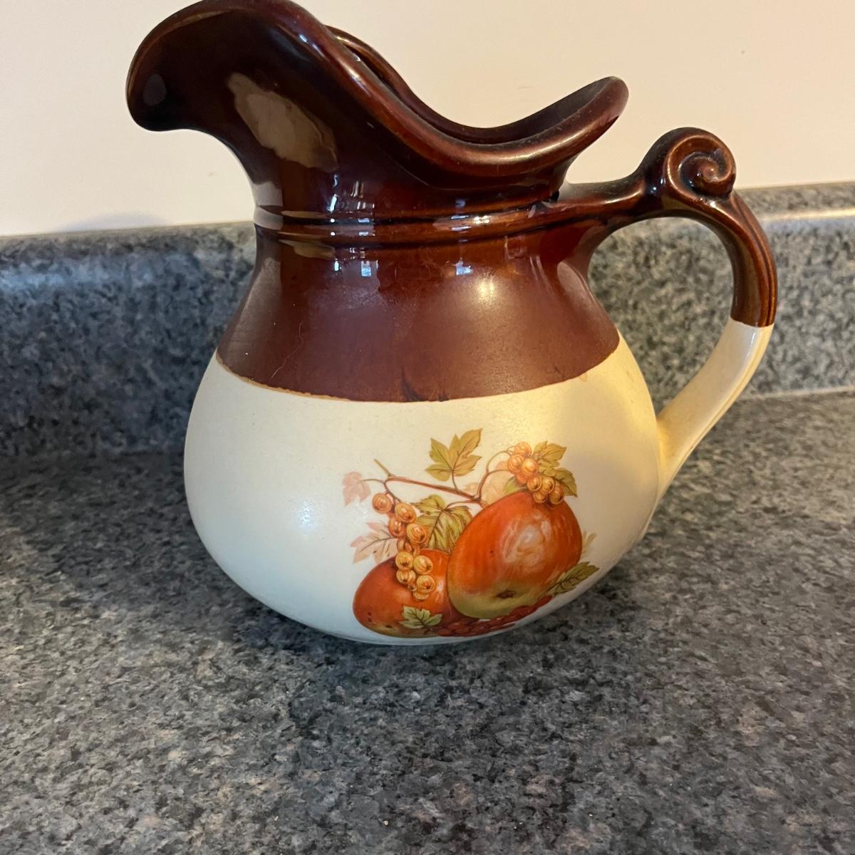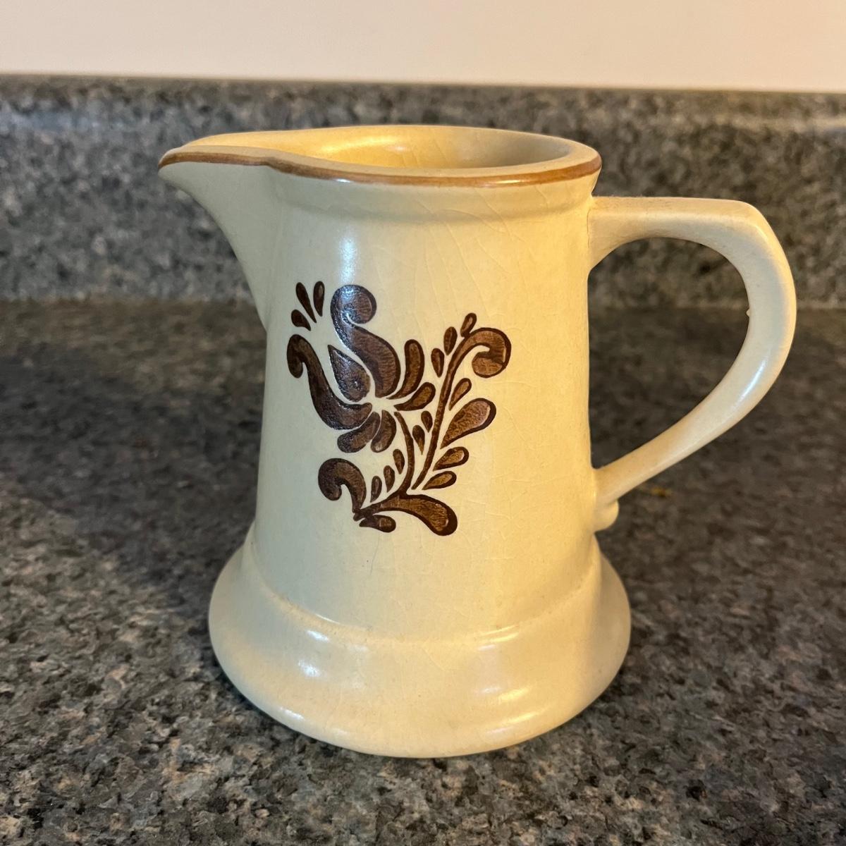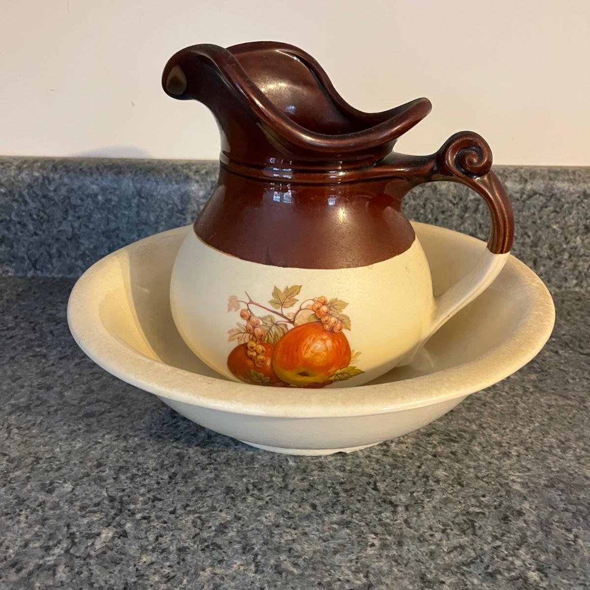 Lot includes a McCoy Pitcher and basin and a Pfaltzgraff Turin with ladle small pitcher and salt and pepper shakers. McCoy basin measures 11”D x 3” tall.