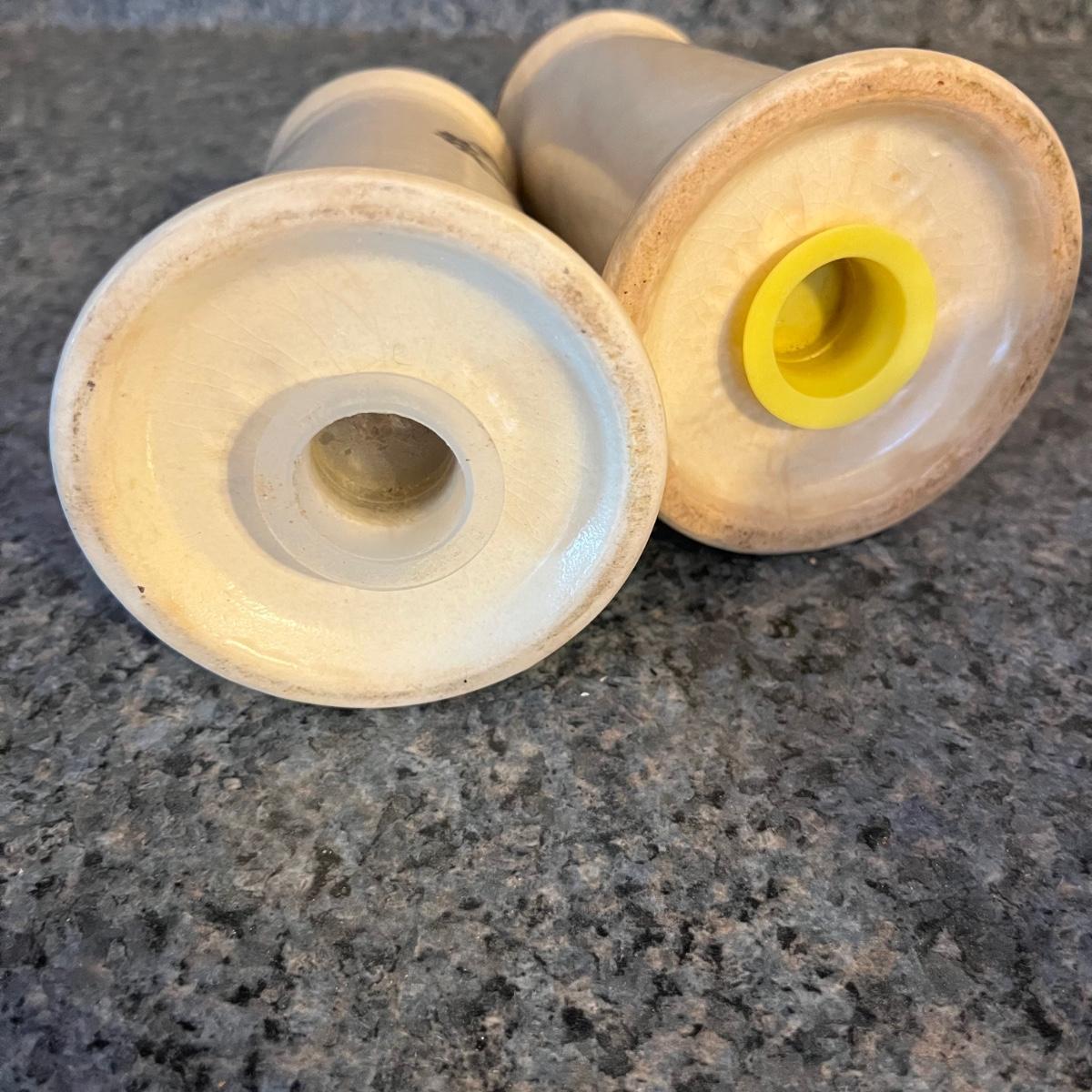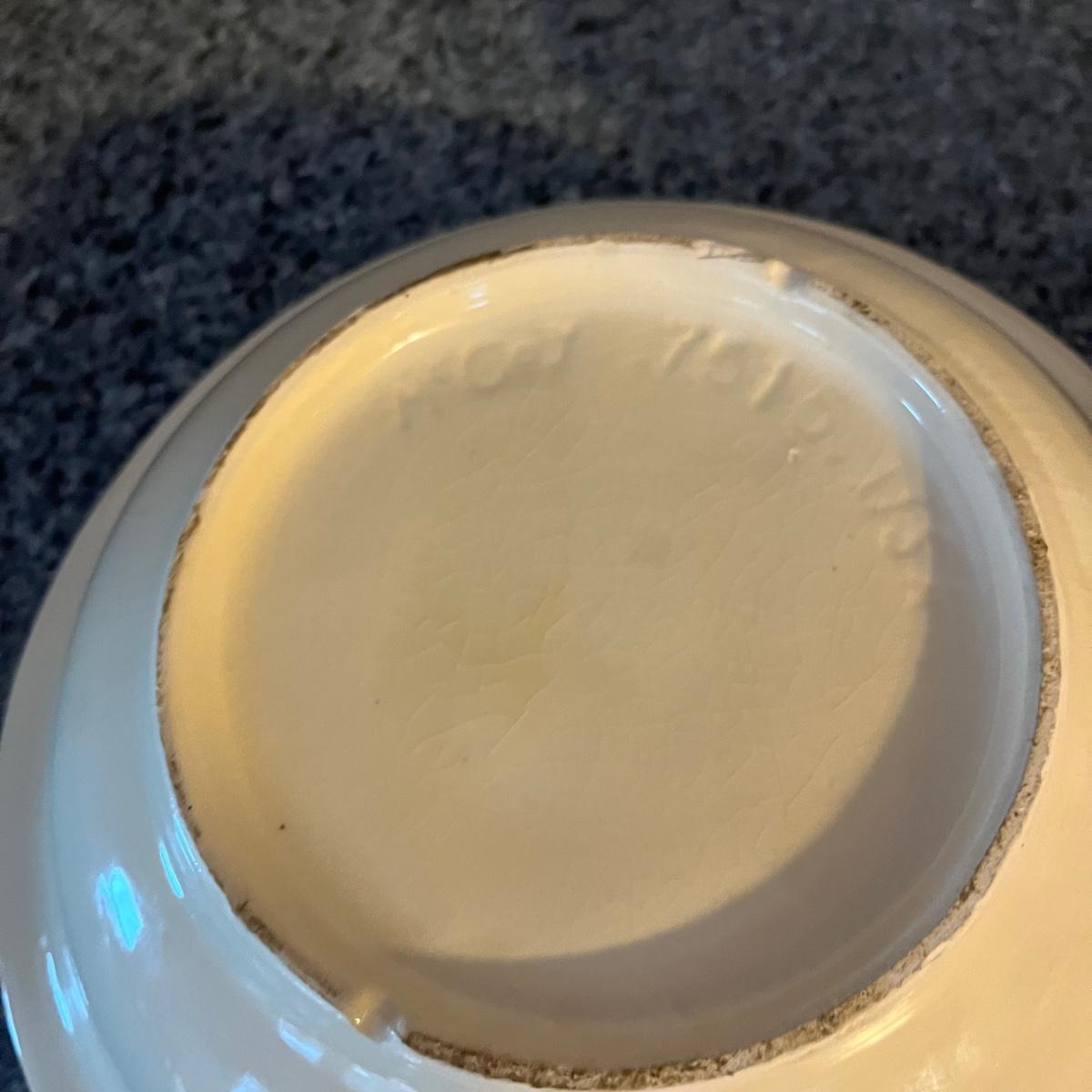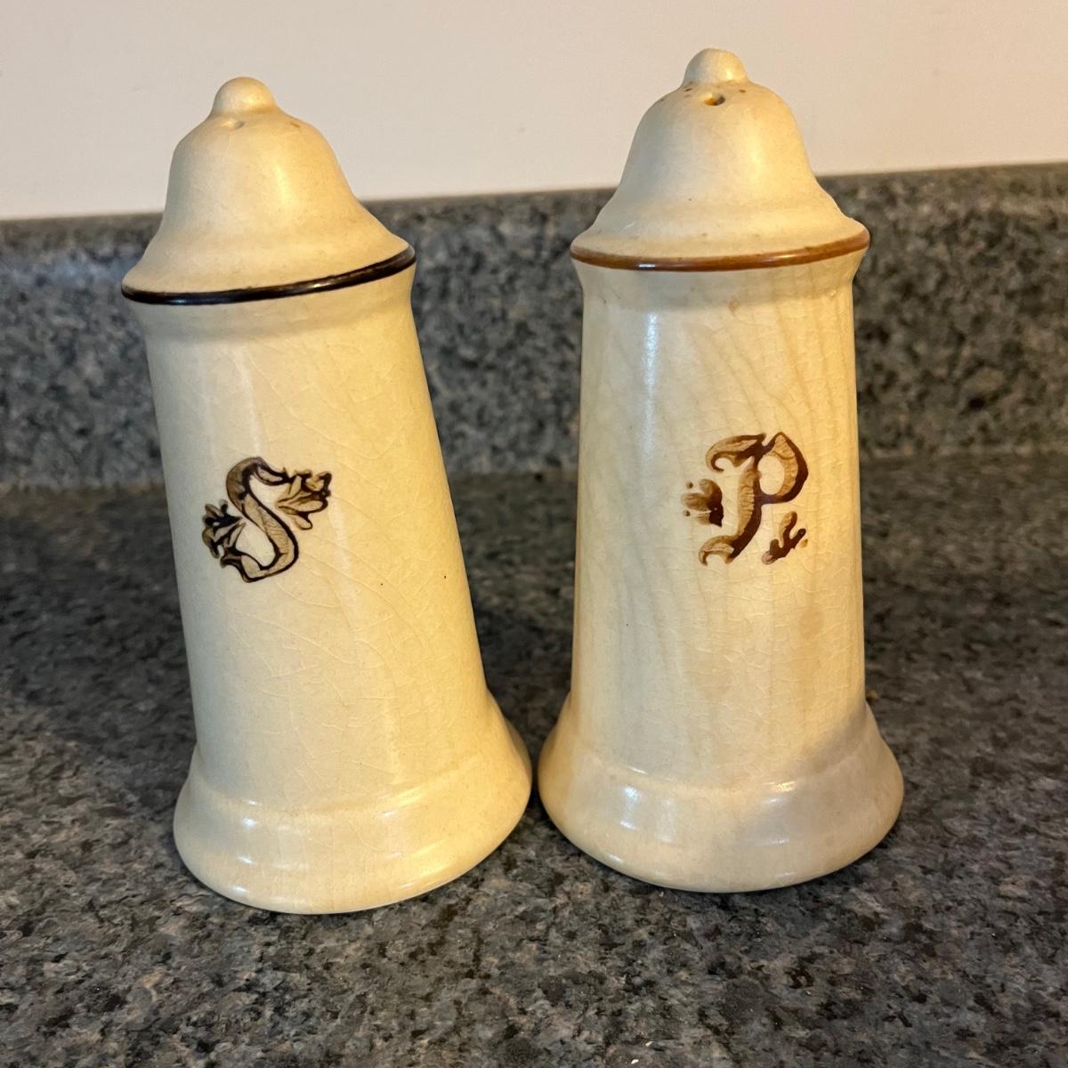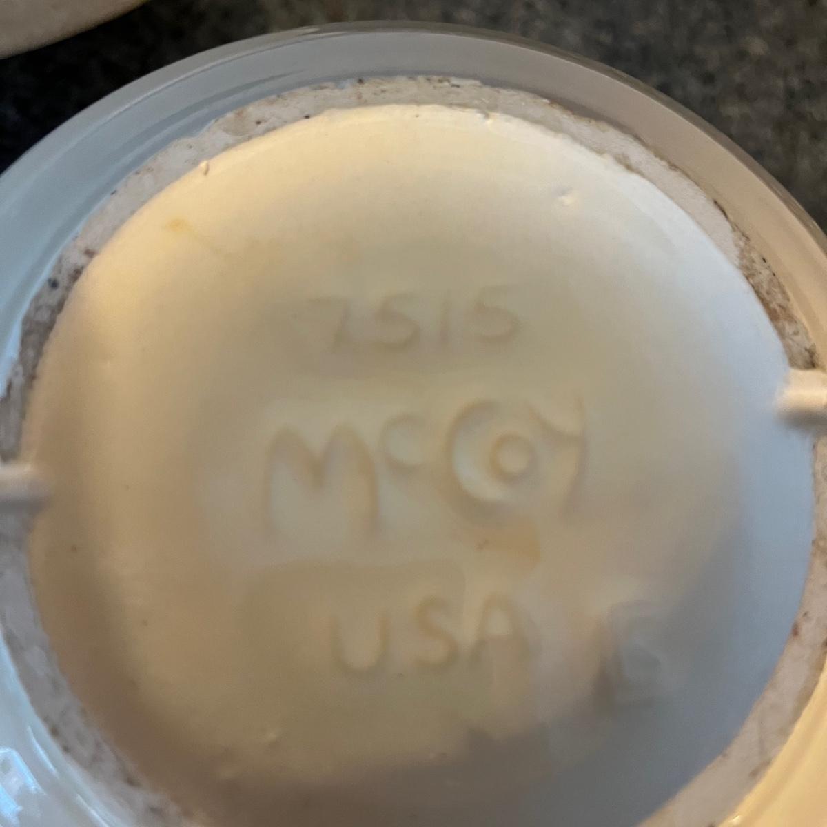 Lot includes a McCoy Pitcher and basin and a Pfaltzgraff Turin with ladle small pitcher and salt and pepper shakers. McCoy basin measures 11”D x 3” tall.