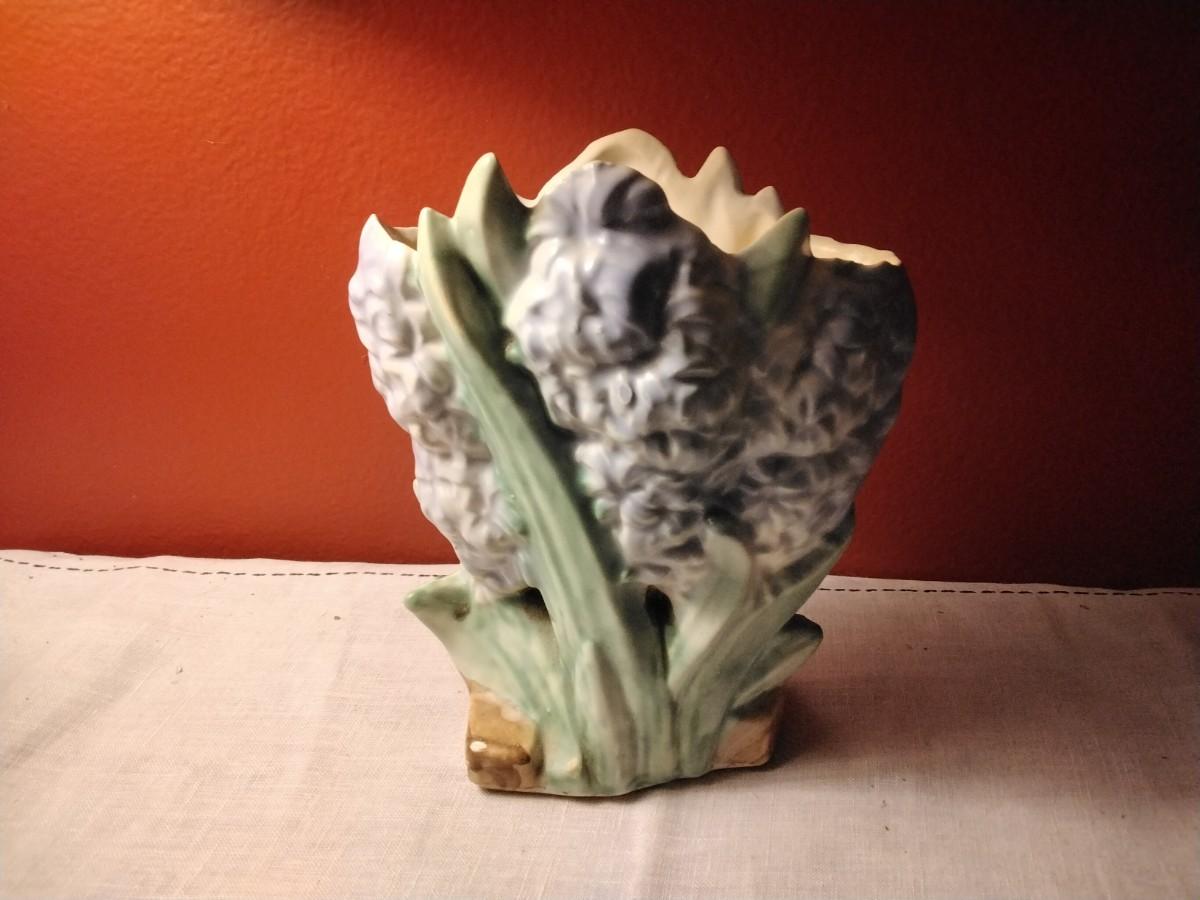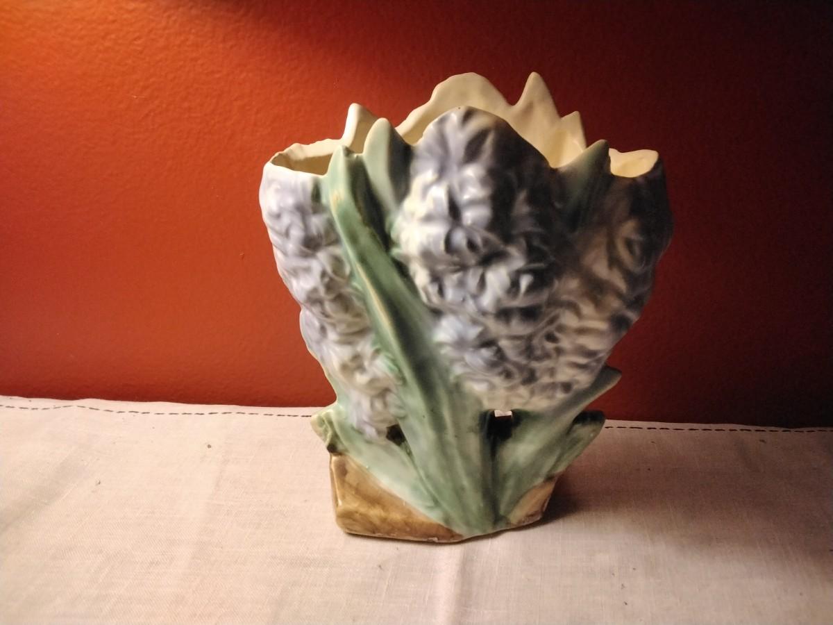 Pretty blue McCoy Pottery hyacinth flower form vase. EXCELLENT CONDITION. No chips, cracks, damage, or repair of any kind. Typical factory flaws. Bottom marked with McCoy. Vase is 8" tall and 7" wide.