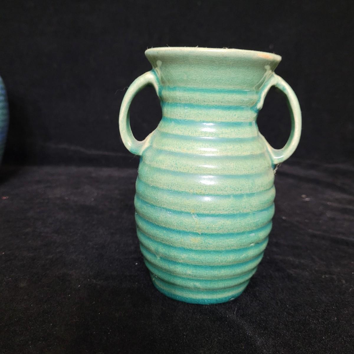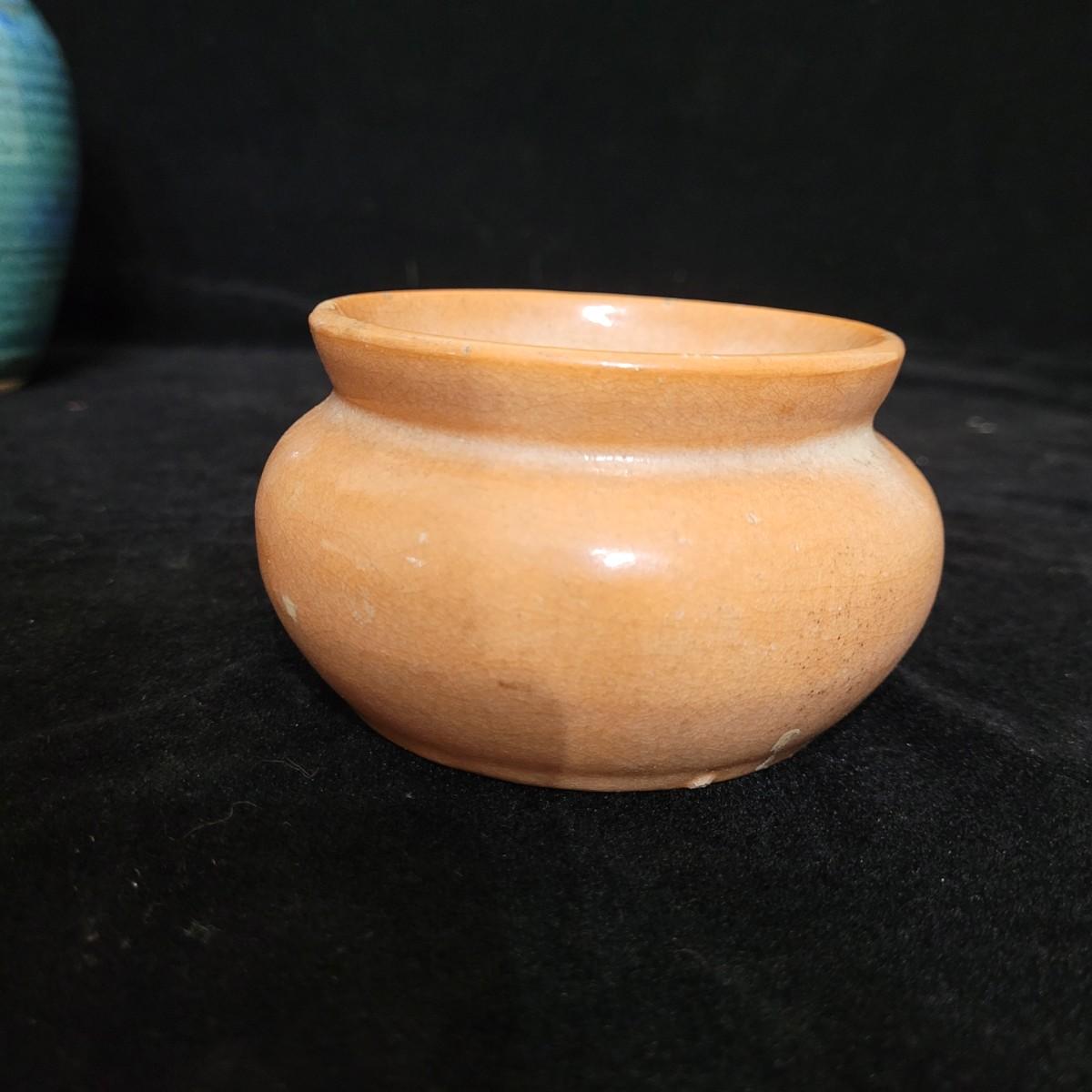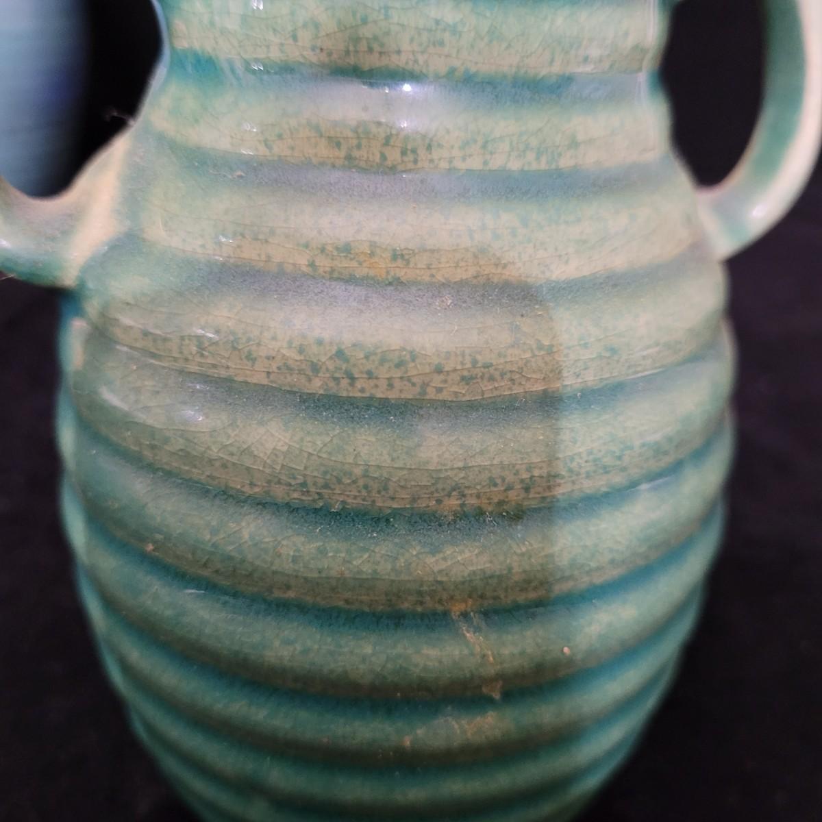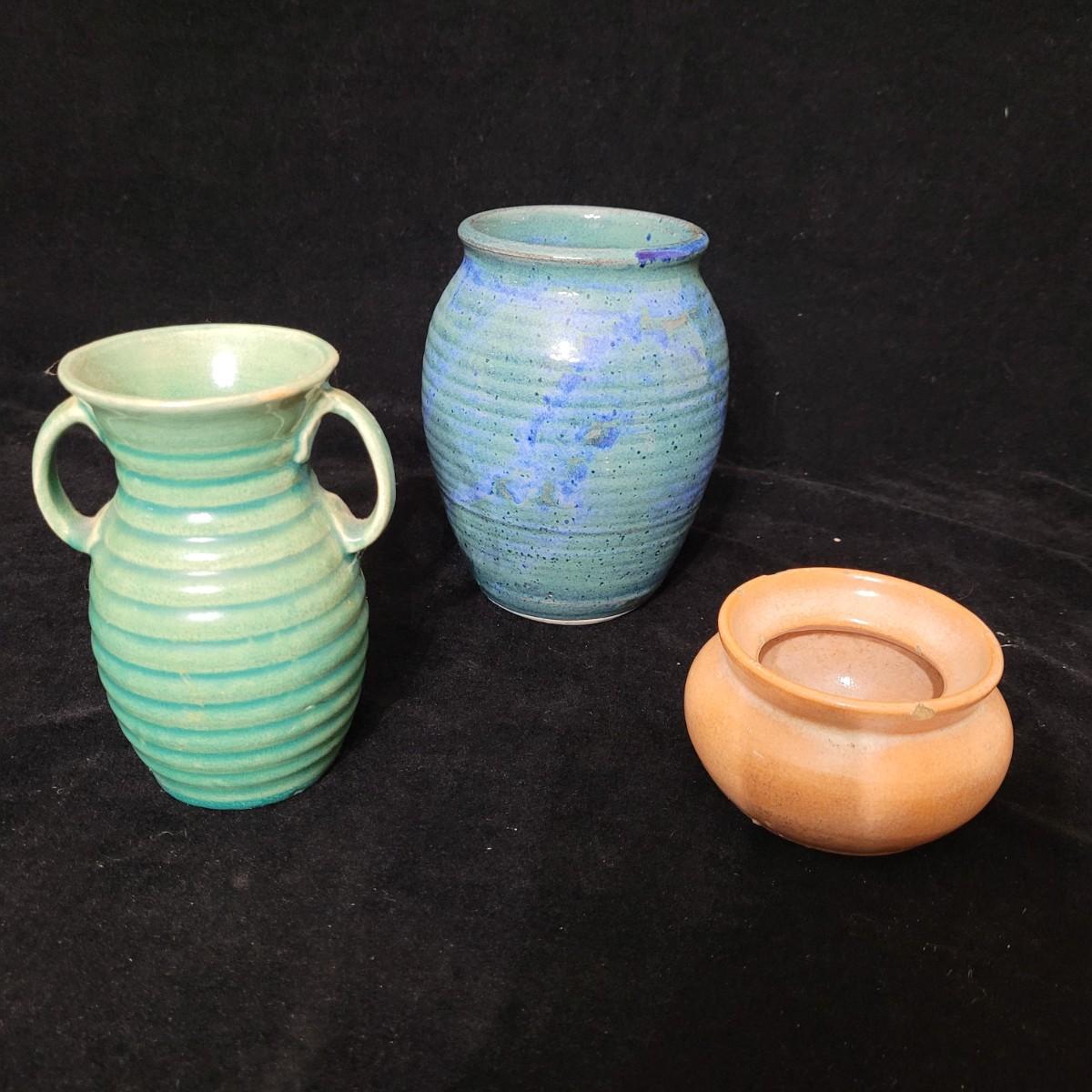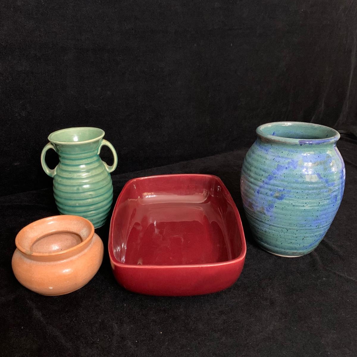 A lovely collection of pottery including a small McCoy vase, larger Mud Puppies Pottery vase, small decorative bowl, and rectangular Haeger planter dish. Bowl has chipping at lid (see photos). Large blue vase measures approximately 4"DIA x7"H. Shipping available.