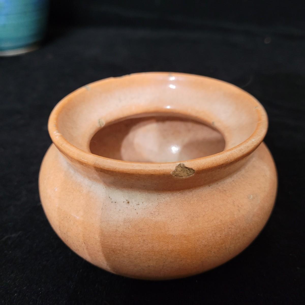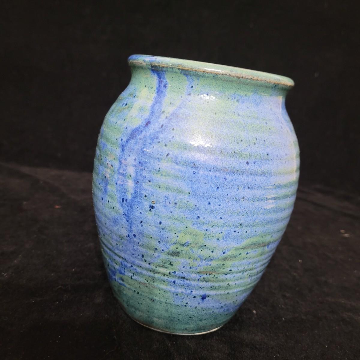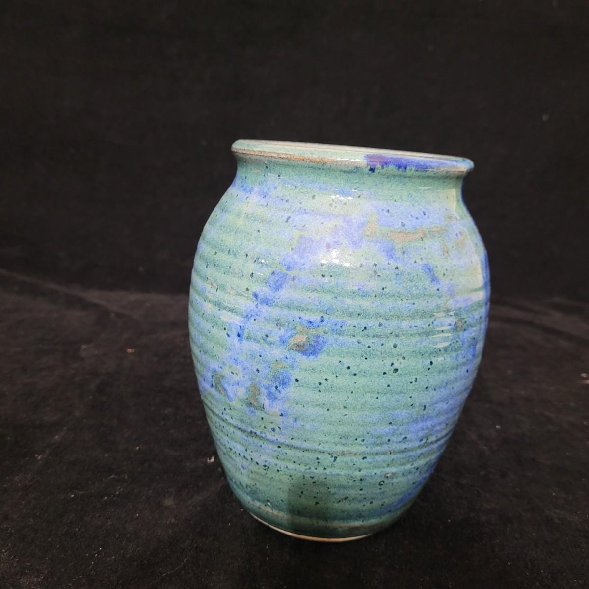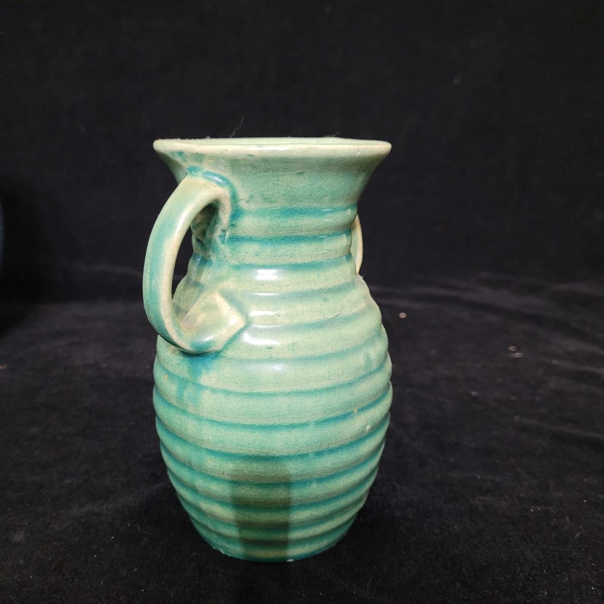 A lovely collection of pottery including a small McCoy vase, larger Mud Puppies Pottery vase, small decorative bowl, and rectangular Haeger planter dish. Bowl has chipping at lid (see photos). Large blue vase measures approximately 4"DIA x7"H. Shipping available.