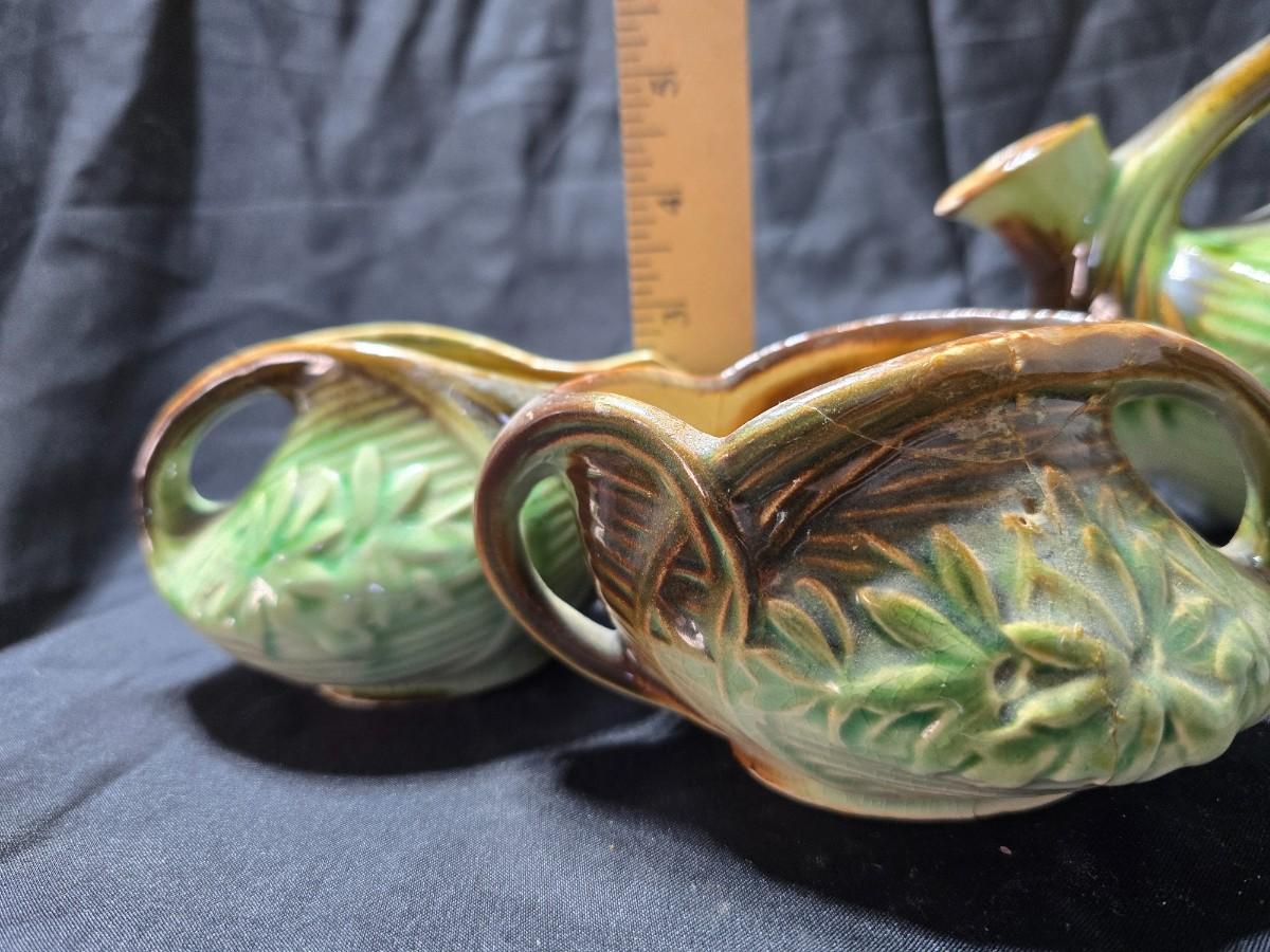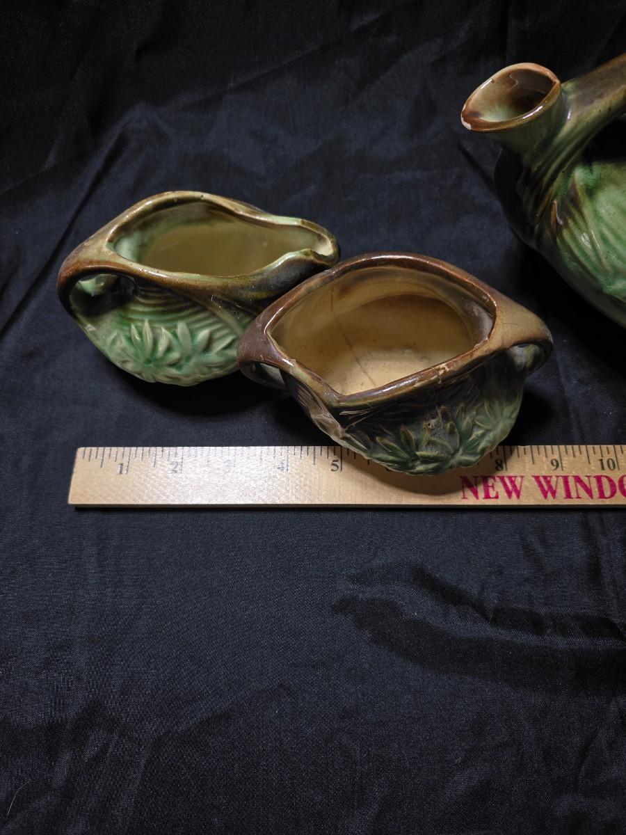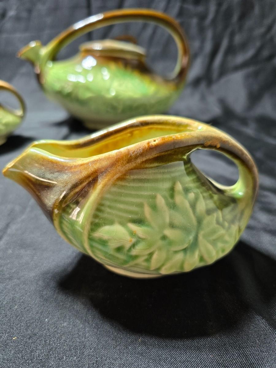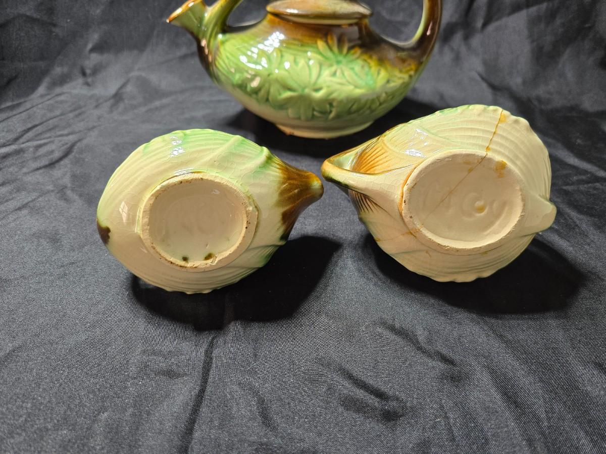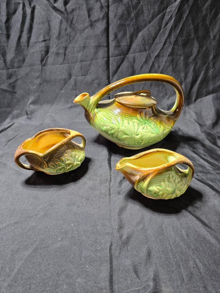 The set includes a teapot with a lid, an open sugar bowl, and a creamer, all featuring a distinctive green and brown glaze with a raised floral/leaf design. These pieces have some small chips as shown.