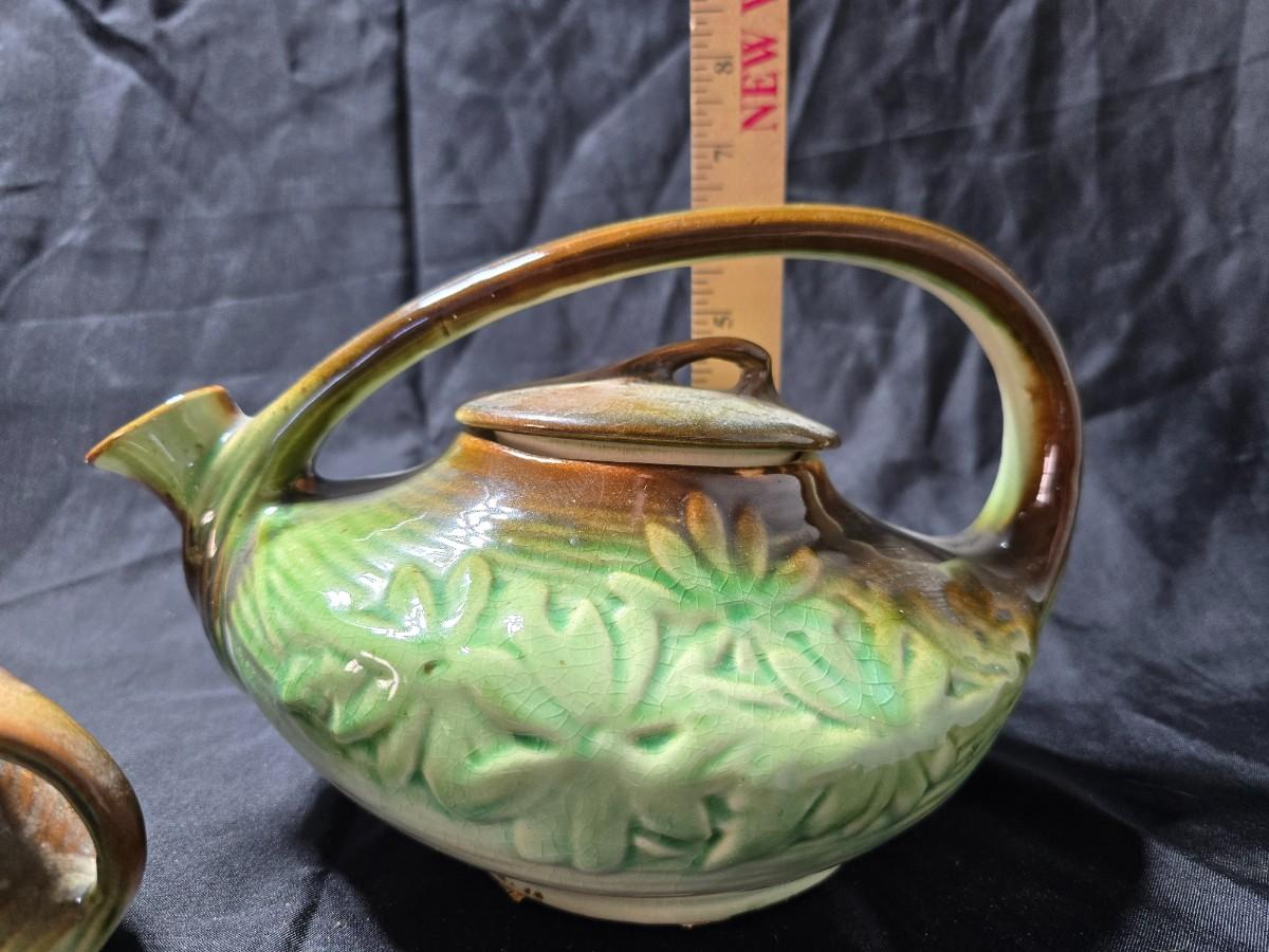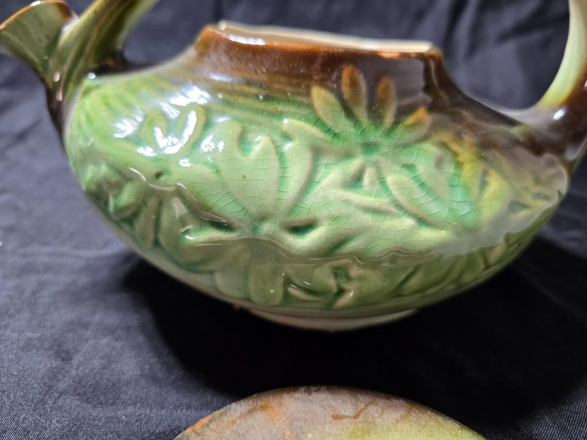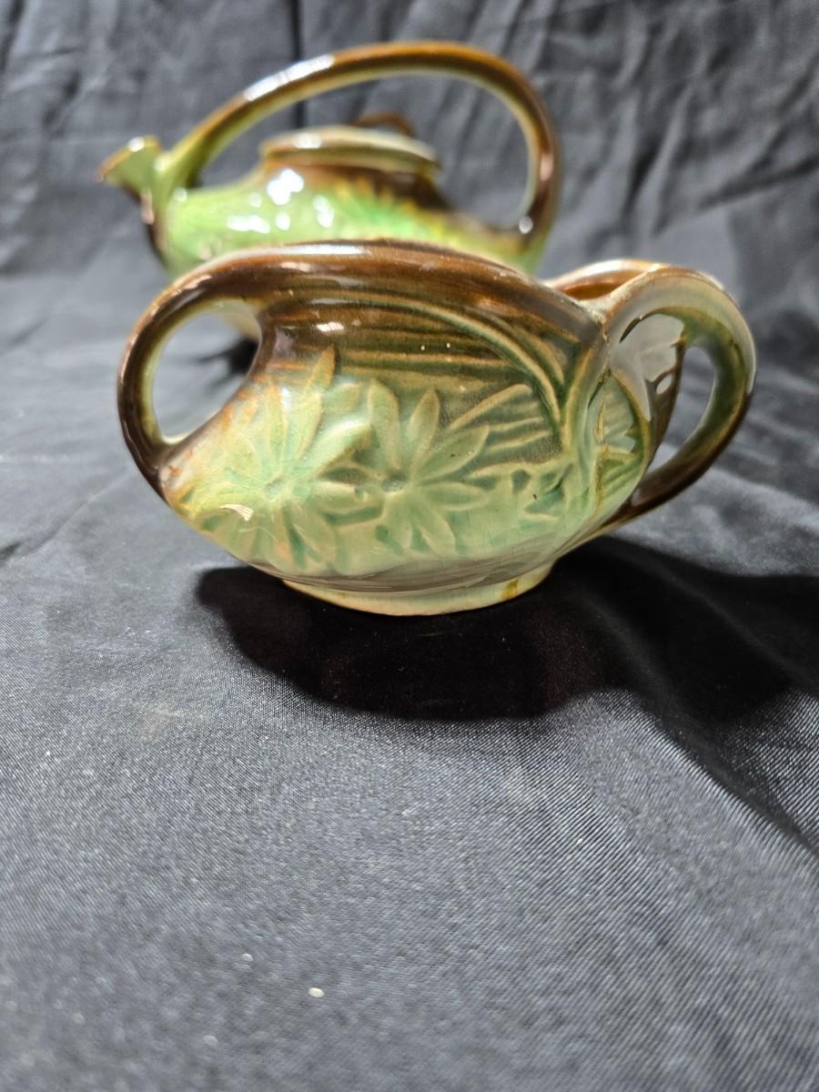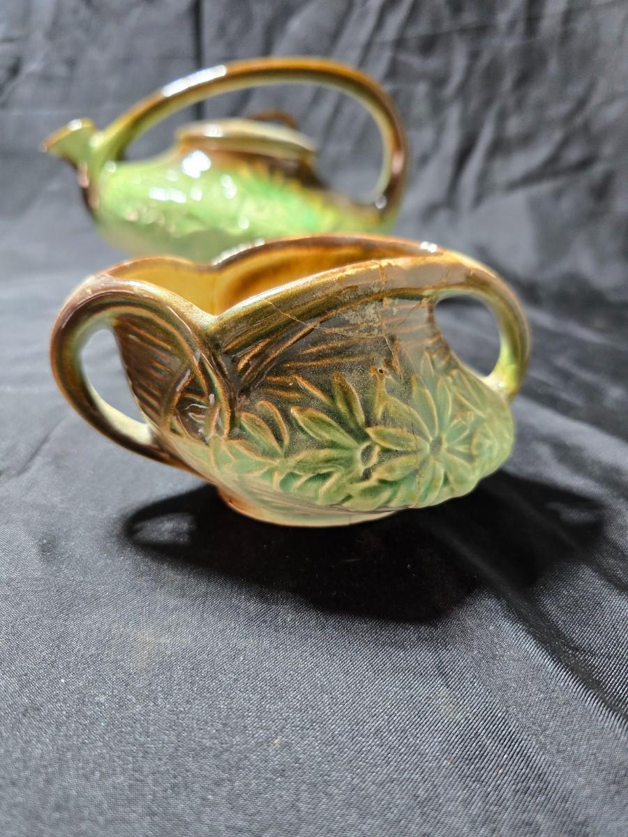 The set includes a teapot with a lid, an open sugar bowl, and a creamer, all featuring a distinctive green and brown glaze with a raised floral/leaf design. These pieces have some small chips as shown.