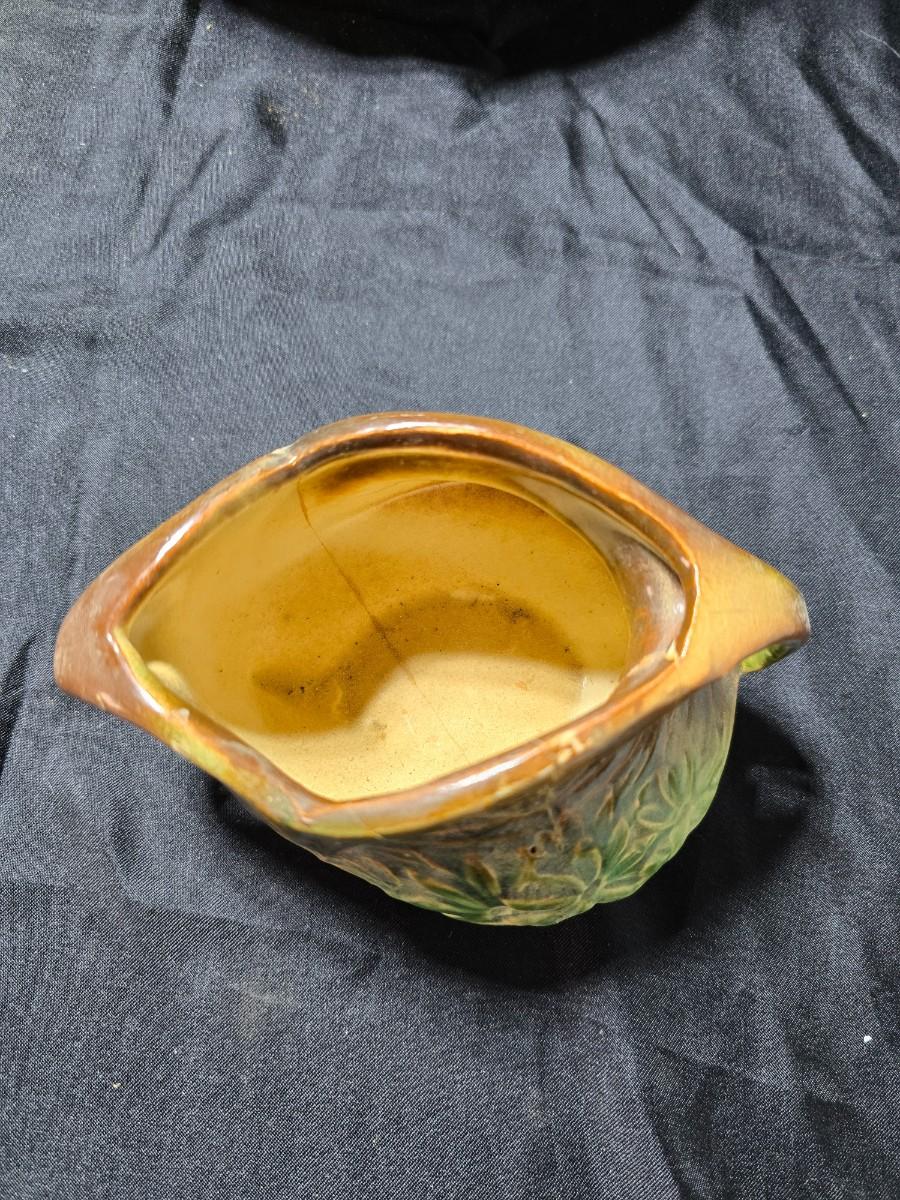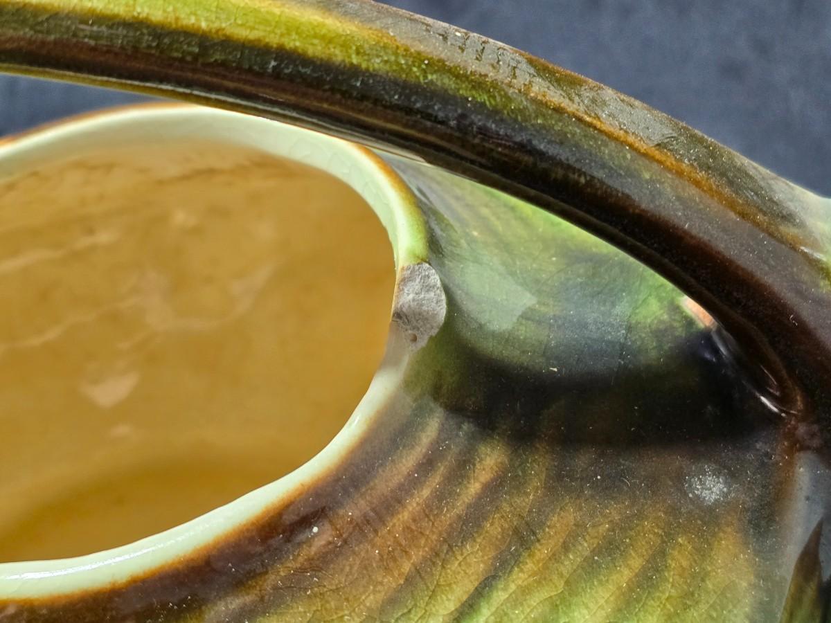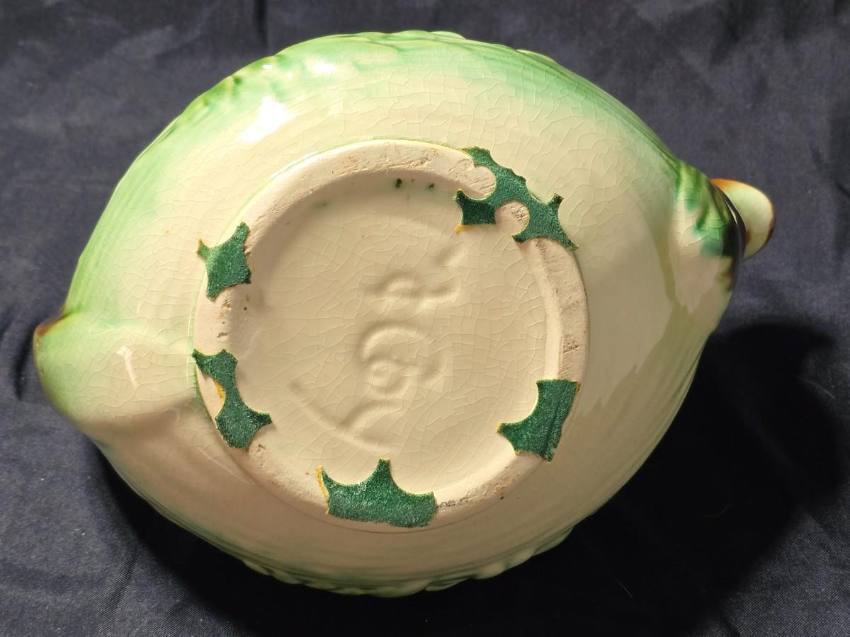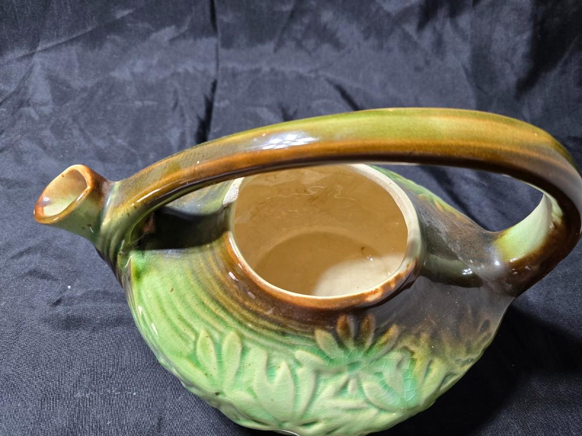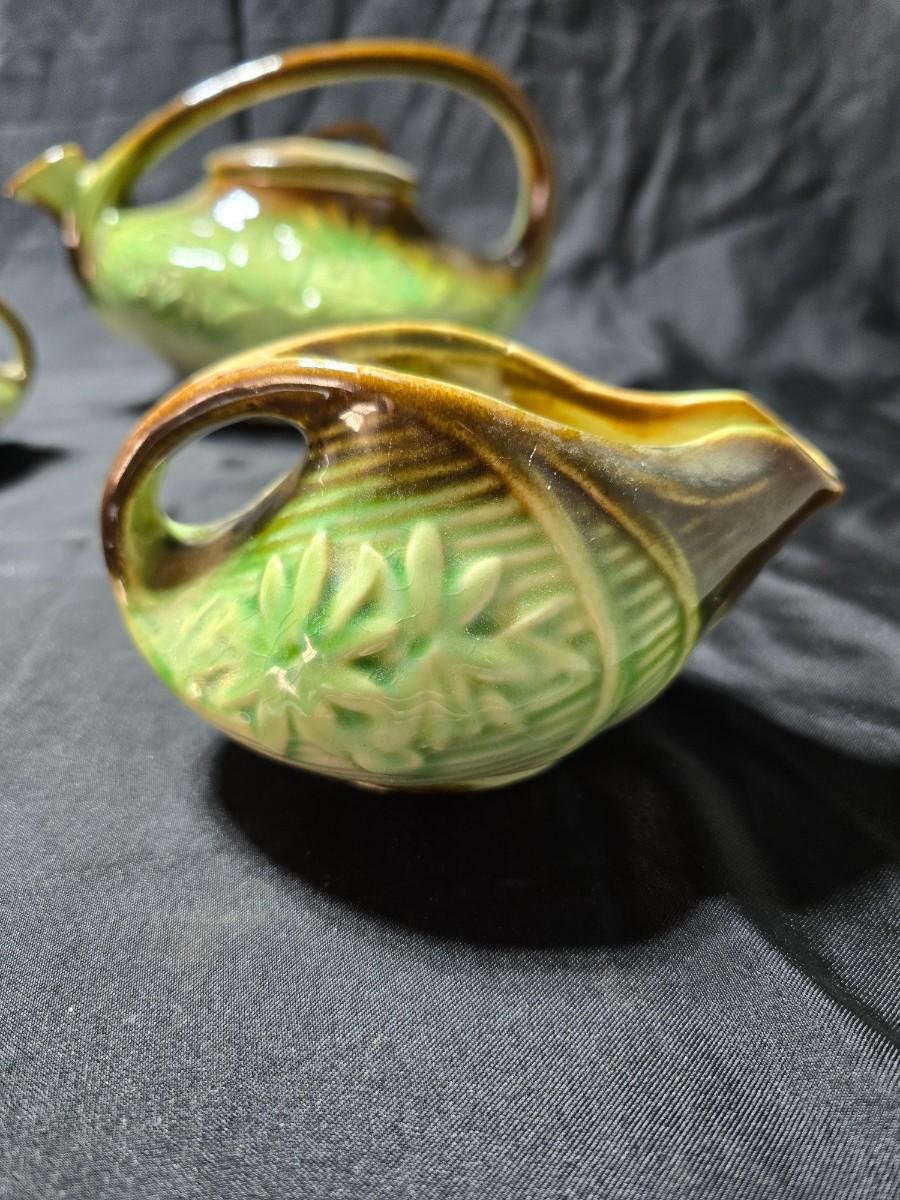 The set includes a teapot with a lid, an open sugar bowl, and a creamer, all featuring a distinctive green and brown glaze with a raised floral/leaf design. These pieces have some small chips as shown.