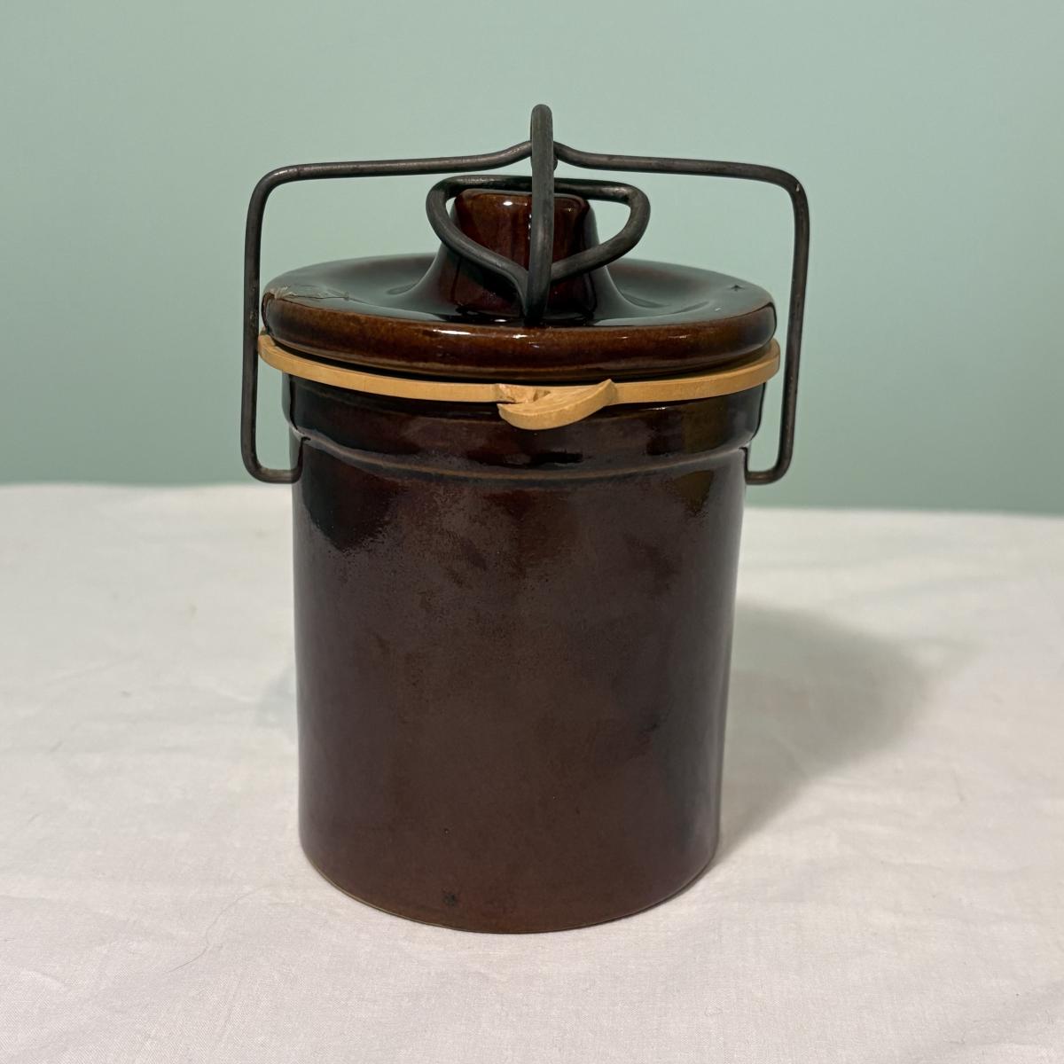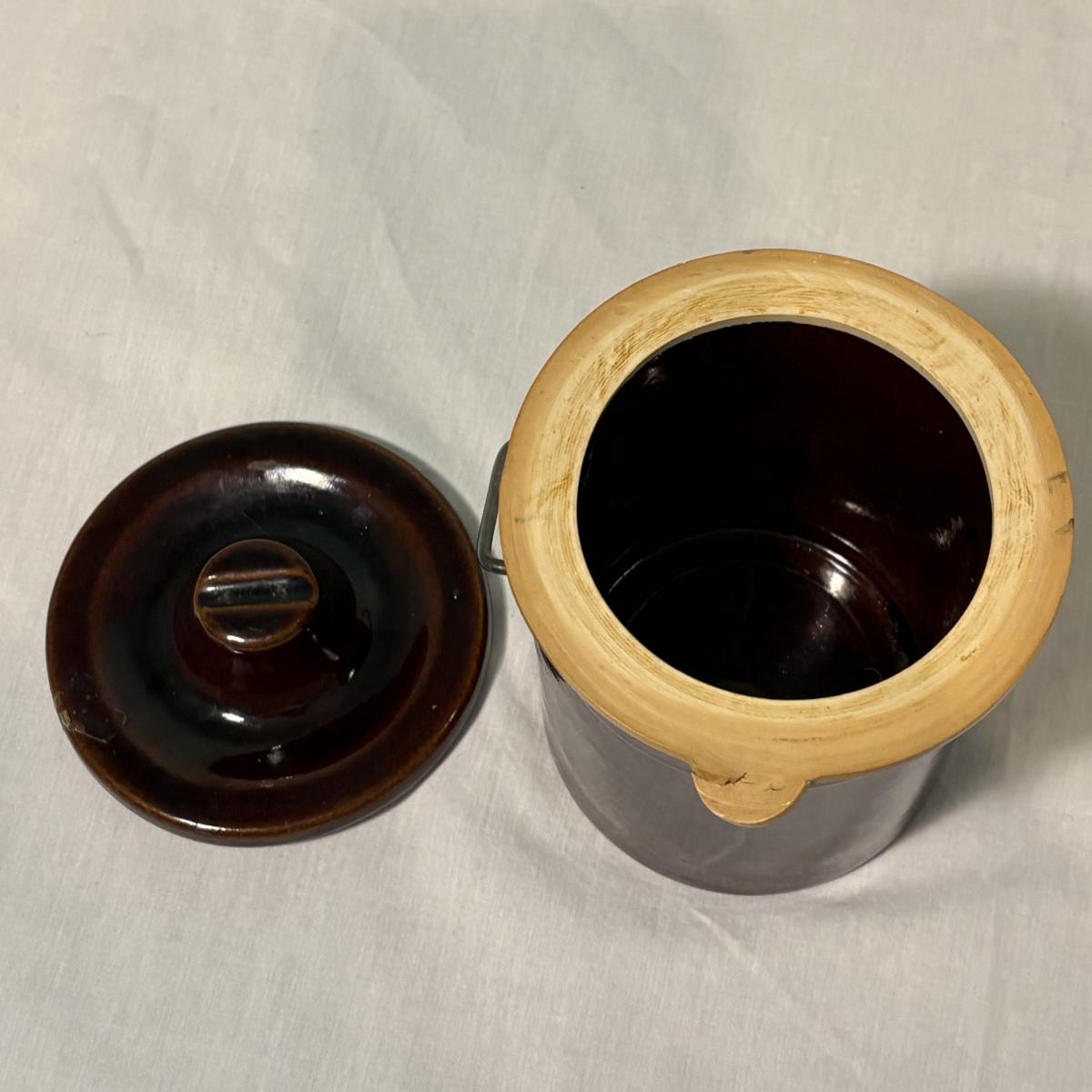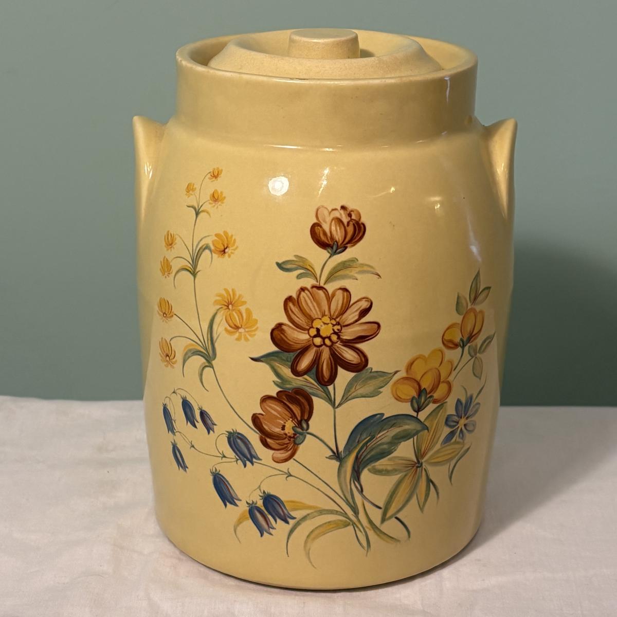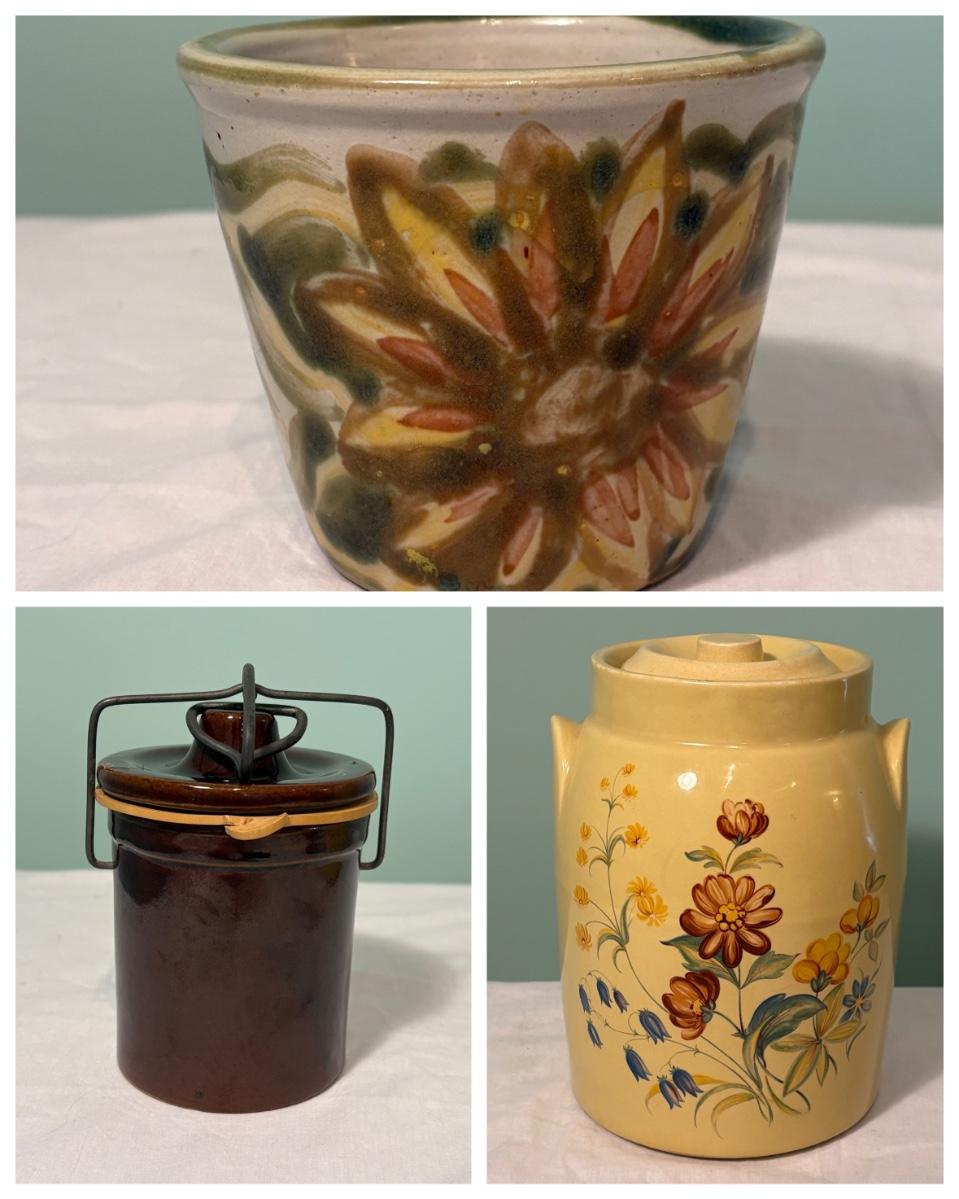 This lot includes a McCoy Pottery Cookie Jar, a Louisiana Stoneware floral planter, and a small vintage brown crock. The measurements of the McCoy cookie jar are approximately 5"D x 8.5"H. Blemishes in small brown crock, see pictures for reference.