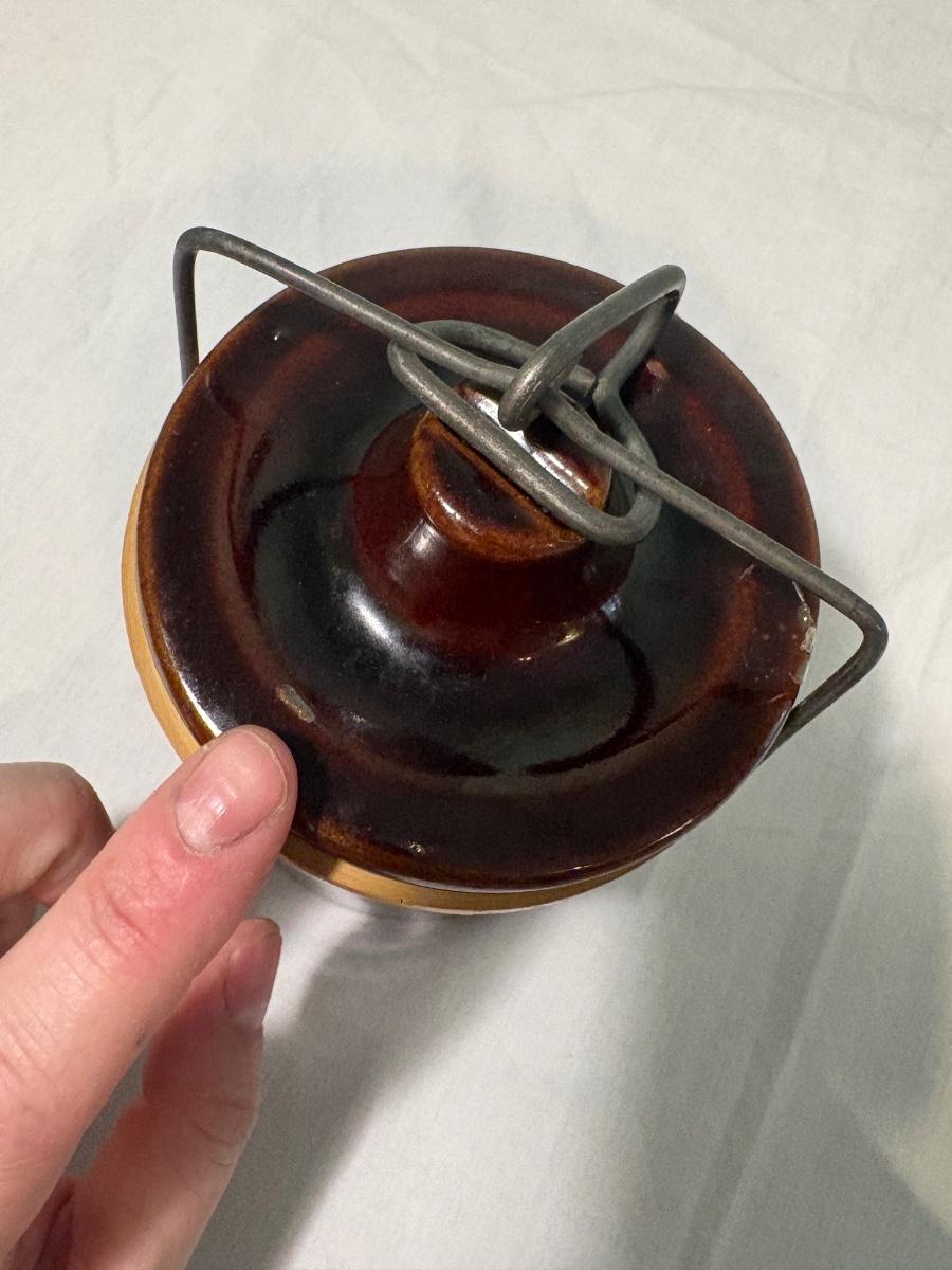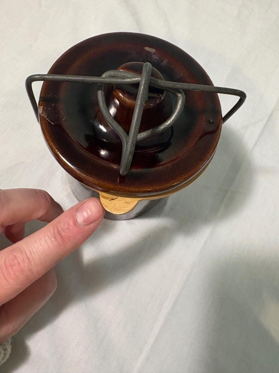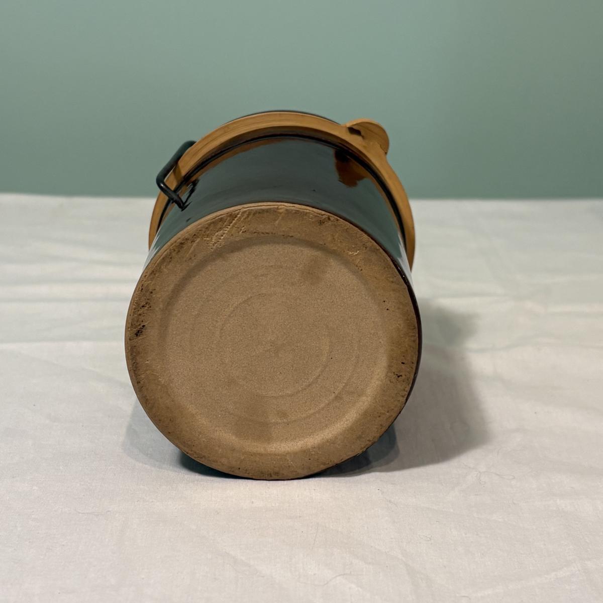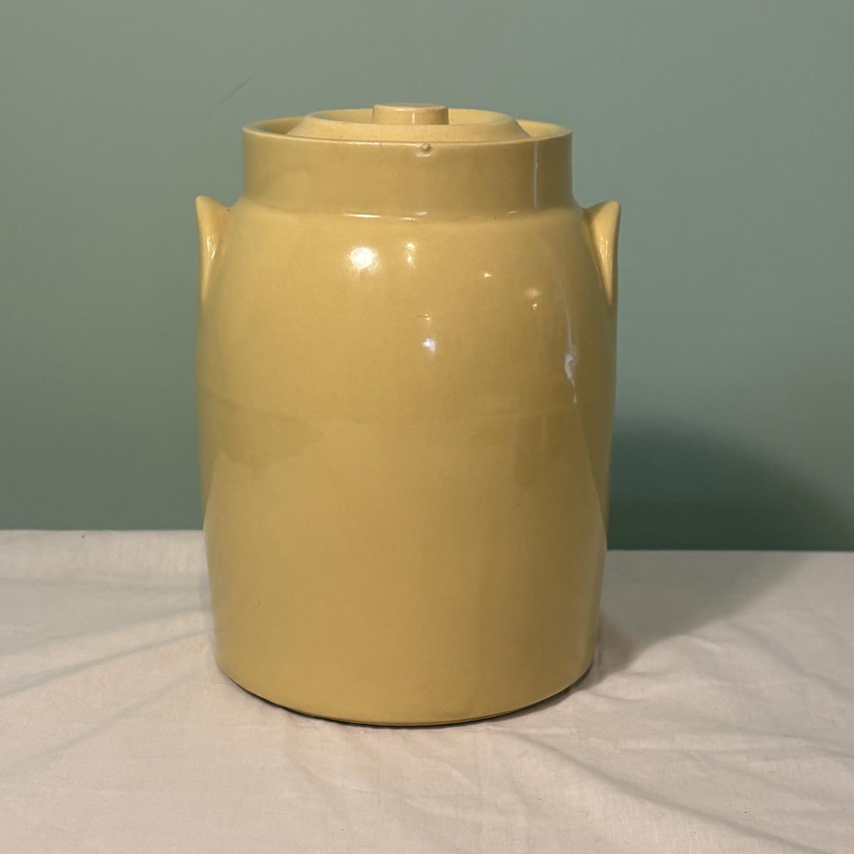 This lot includes a McCoy Pottery Cookie Jar, a Louisiana Stoneware floral planter, and a small vintage brown crock. The measurements of the McCoy cookie jar are approximately 5"D x 8.5"H. Blemishes in small brown crock, see pictures for reference.