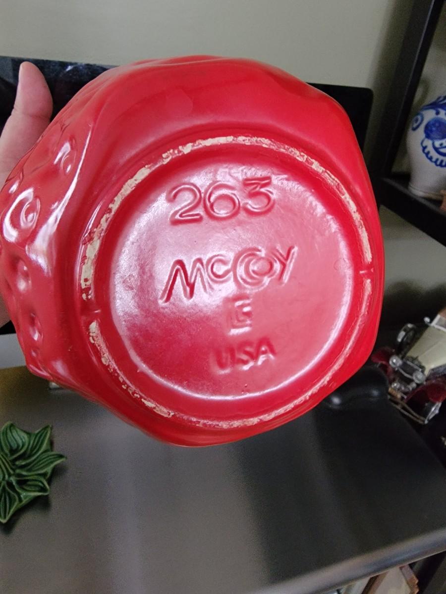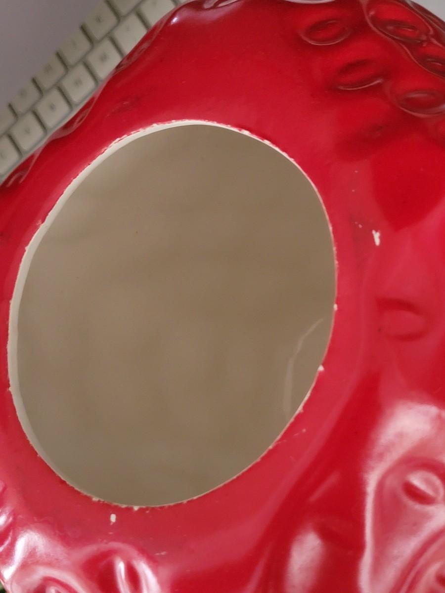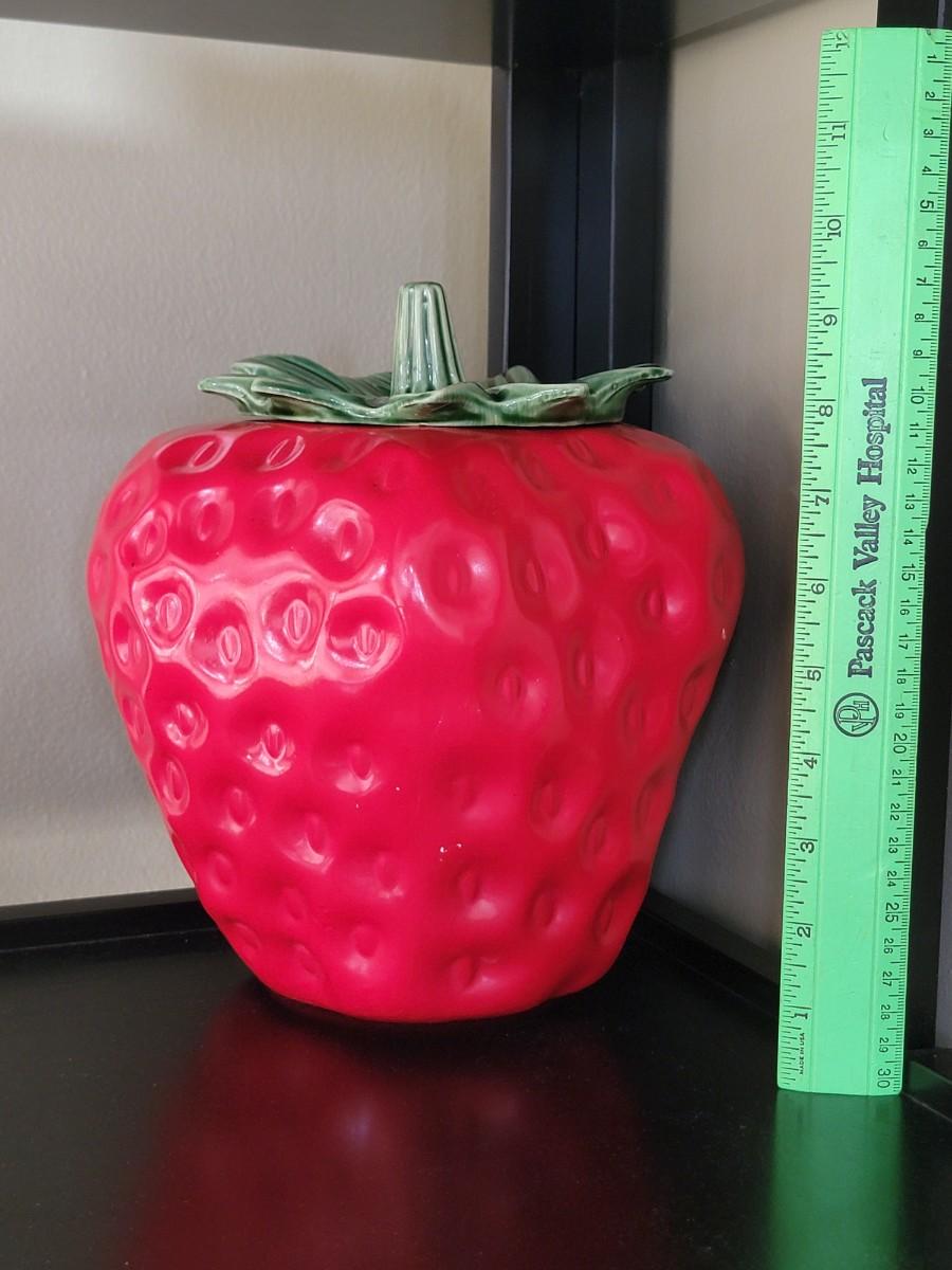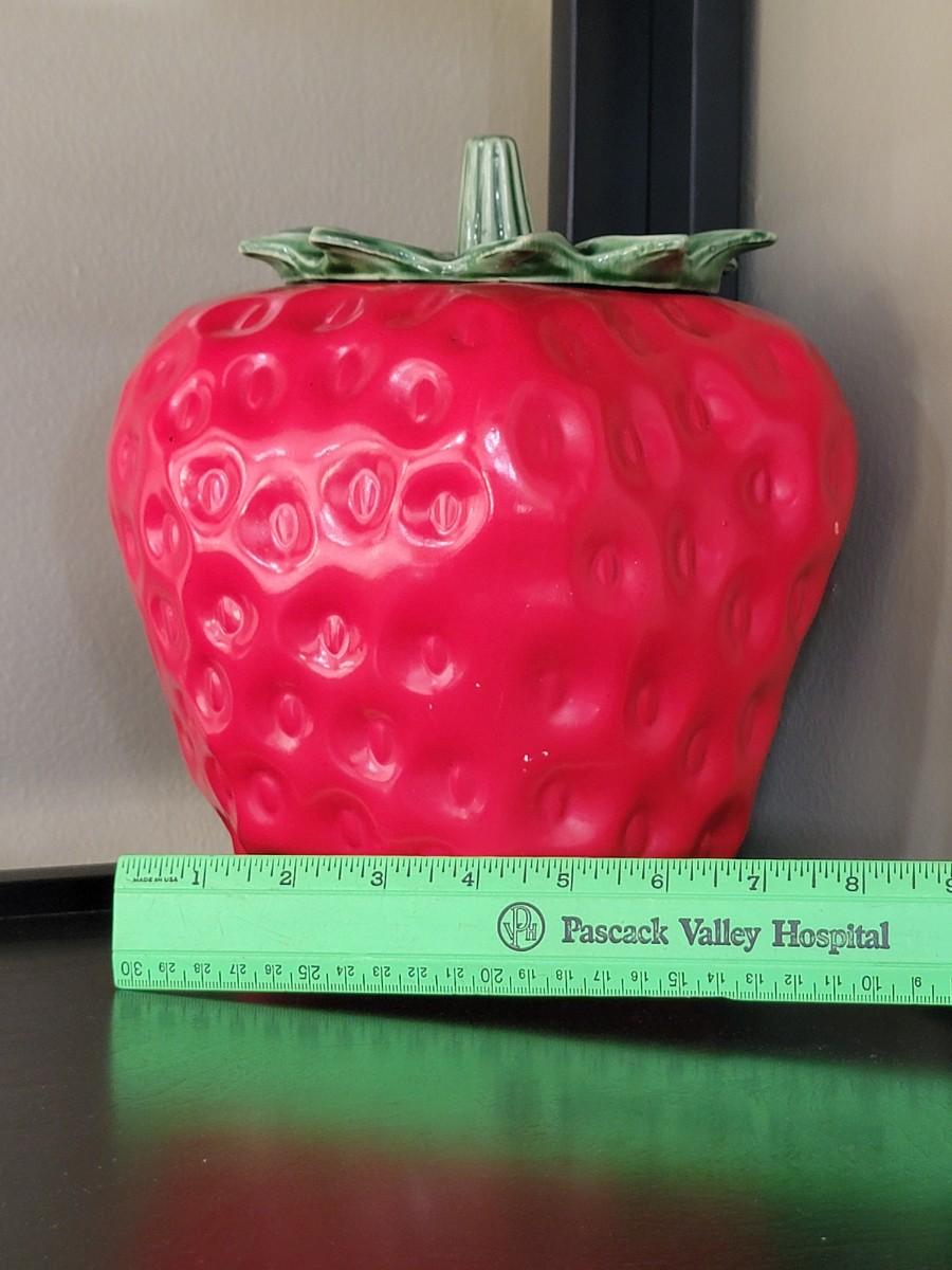 Fun, retro McCoy Strawberry cookie jar. The exterior will need a cleaning as it has a little stickiness. Has asome light scuffs, white spots which might be dirt or scuff marks. No chips noted.