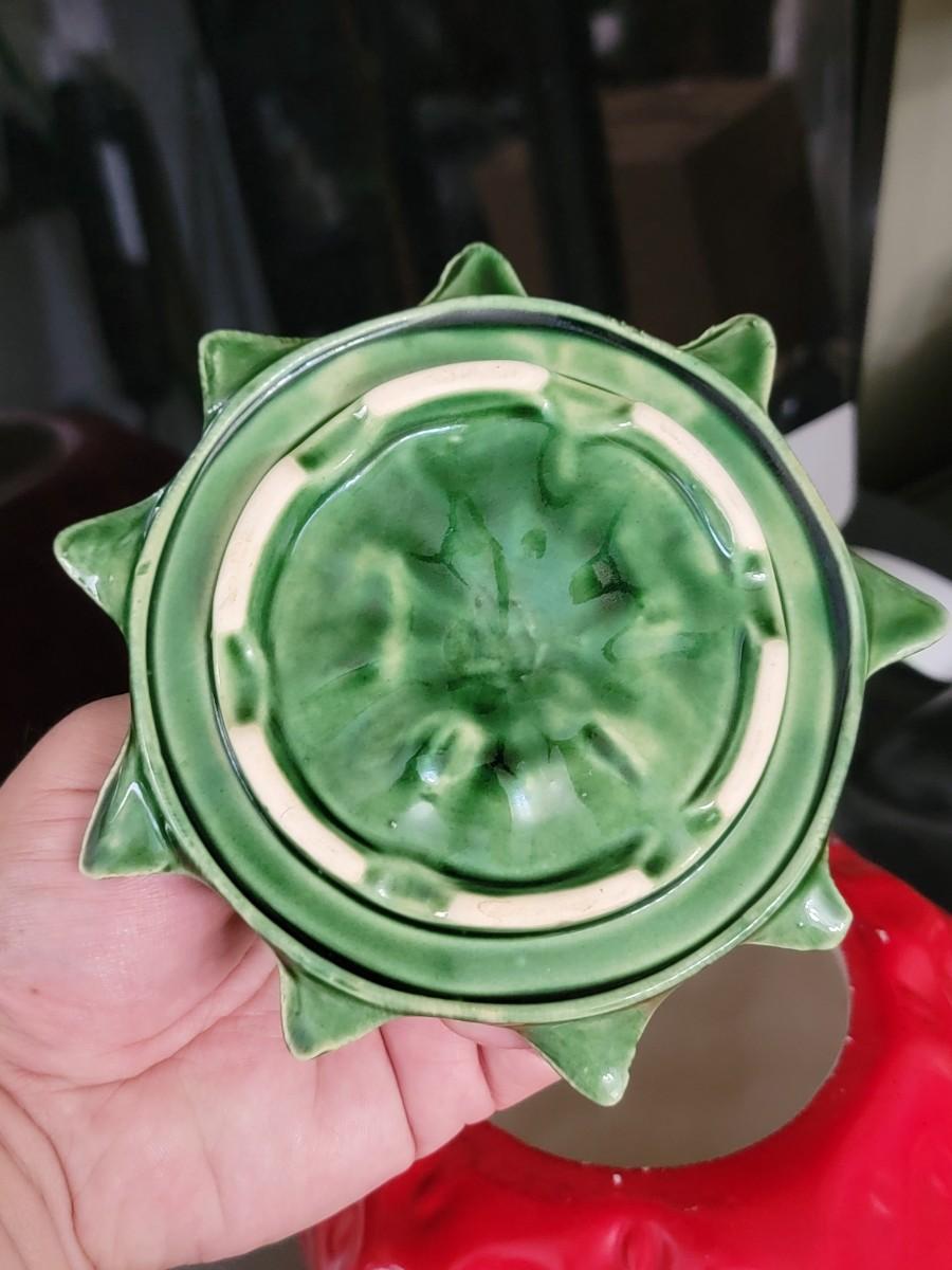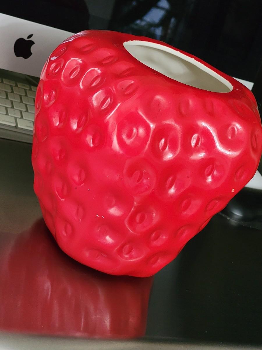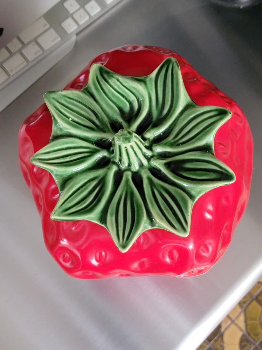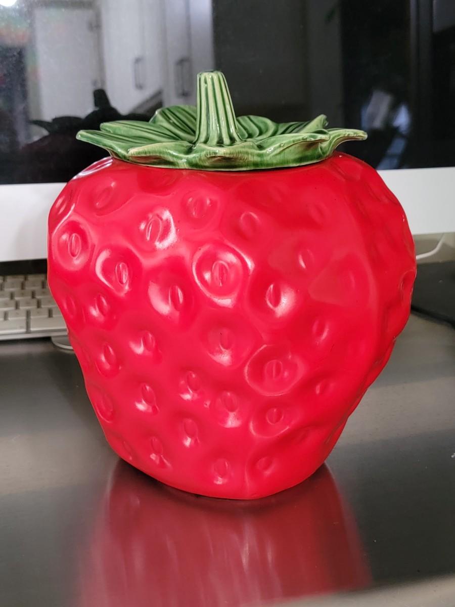 Fun, retro McCoy Strawberry cookie jar. The exterior will need a cleaning as it has a little stickiness. Has asome light scuffs, white spots which might be dirt or scuff marks. No chips noted.