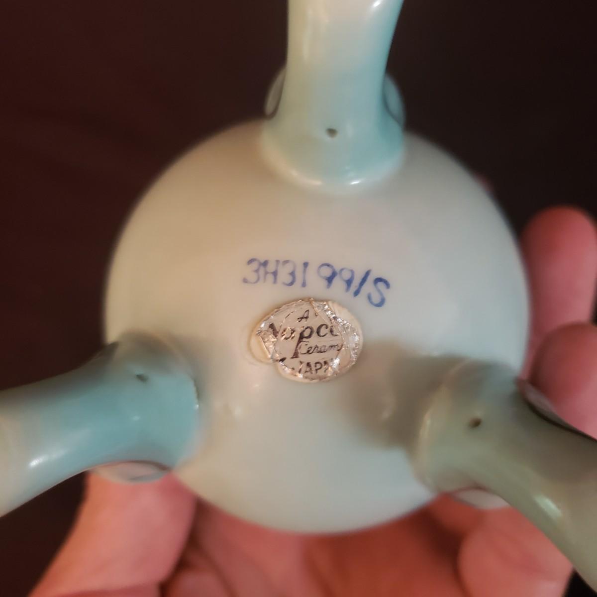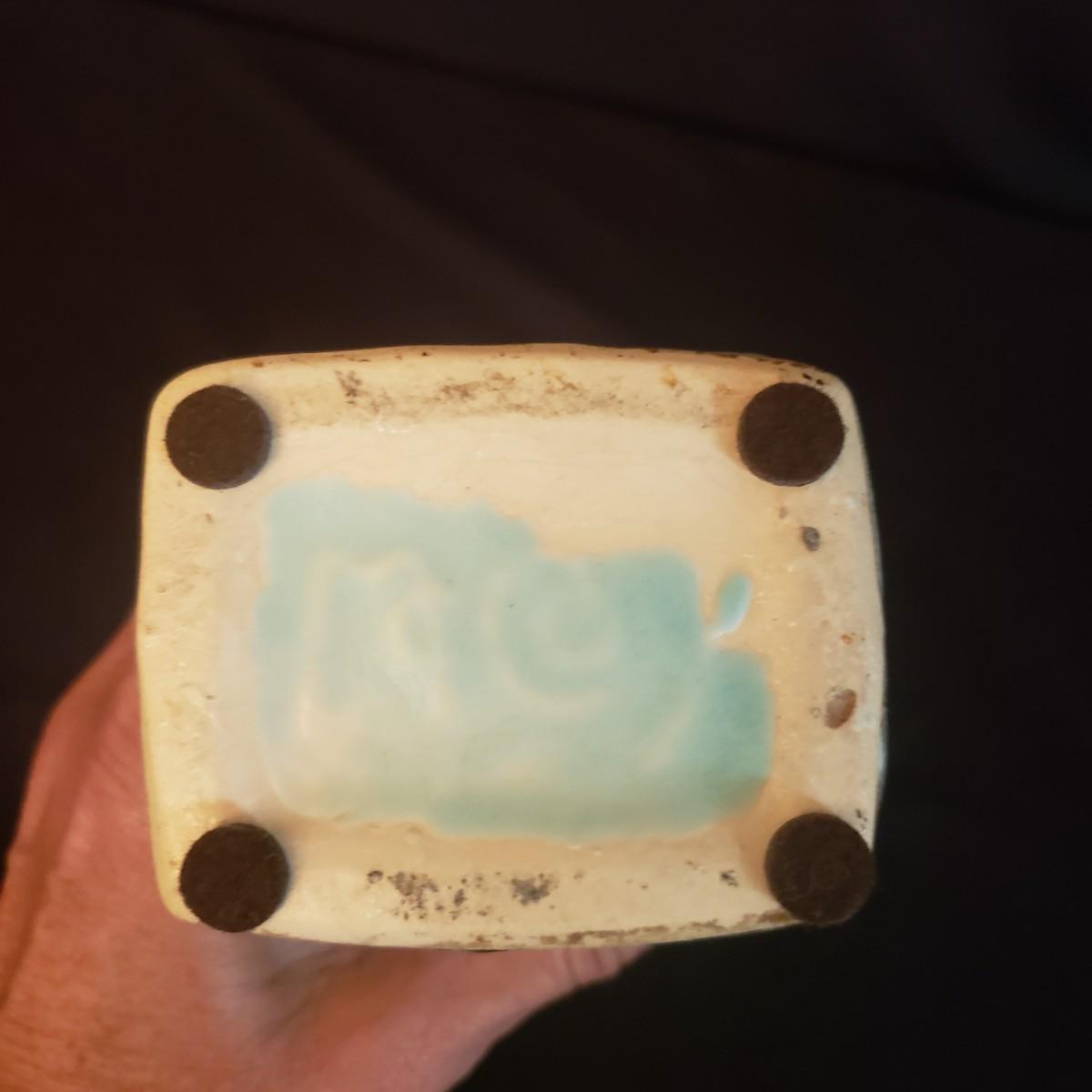 The McCoy vintage rose vase in a blue/green tinted glaze, measures approximately 5"x2"x6" H. The vintage Napoware footed "cracked" egg vase with blue, and pink roses that are hand painted and made in Japan. The Napo vase measures approximately 3"x4" H.