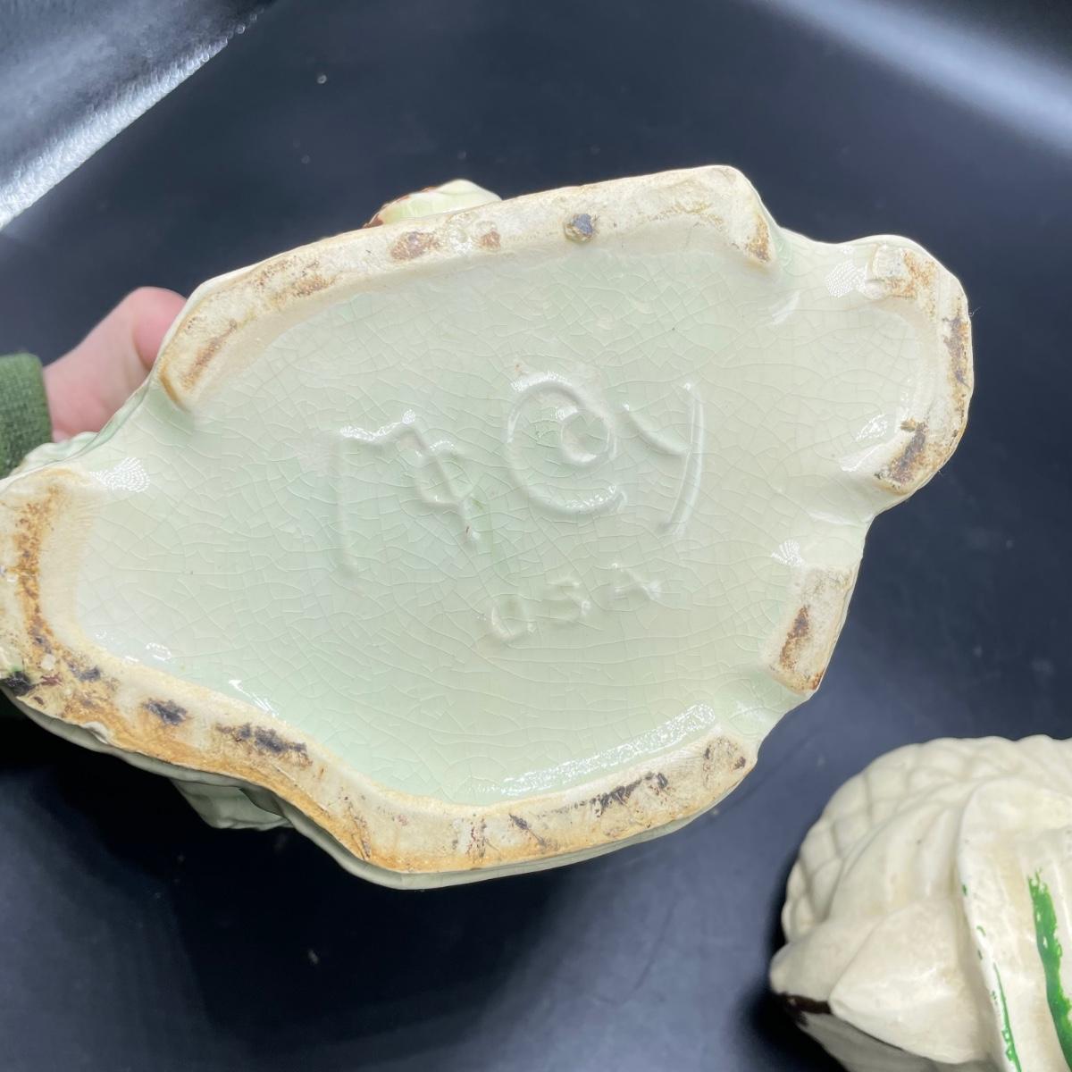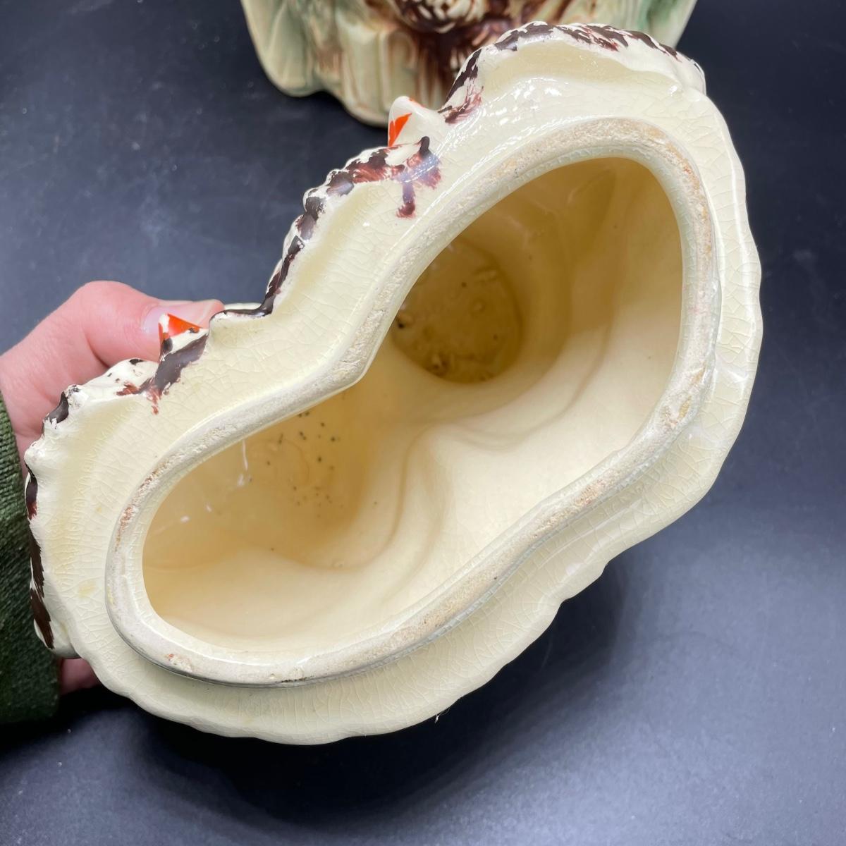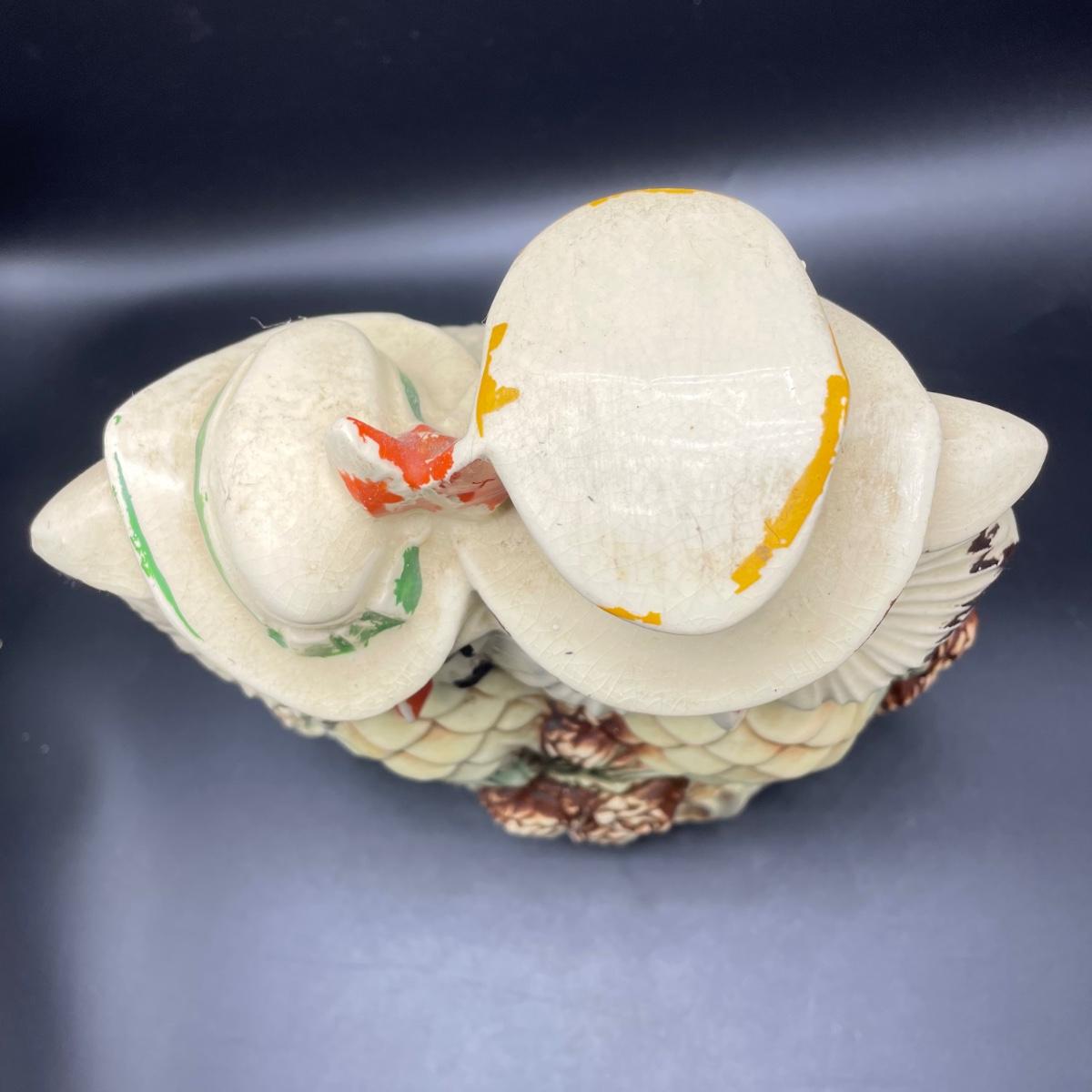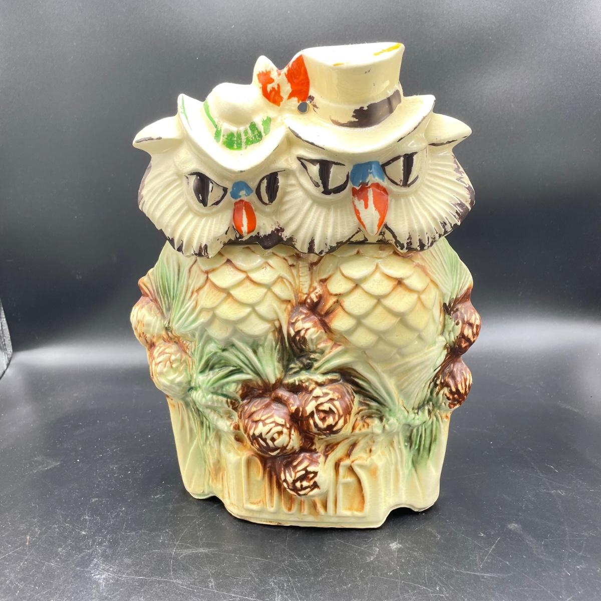 Mid Century owl couple cookie jar from McCoy named “When Shadows Fall”. Jar has crazing throughout and some worn off paint, but it’s in great shape otherwise. Piece measures approximately 9” x 5” x 11”. Shipping available.