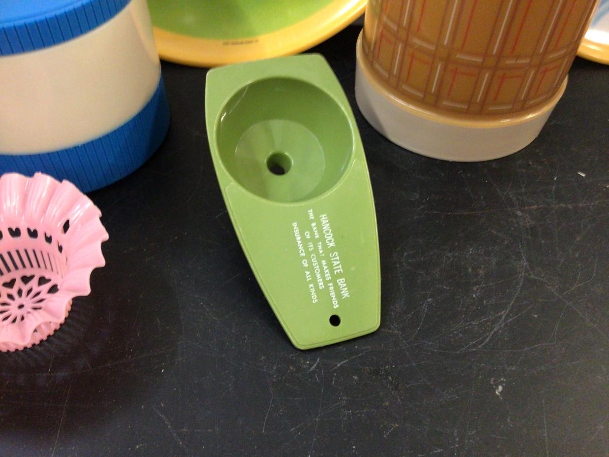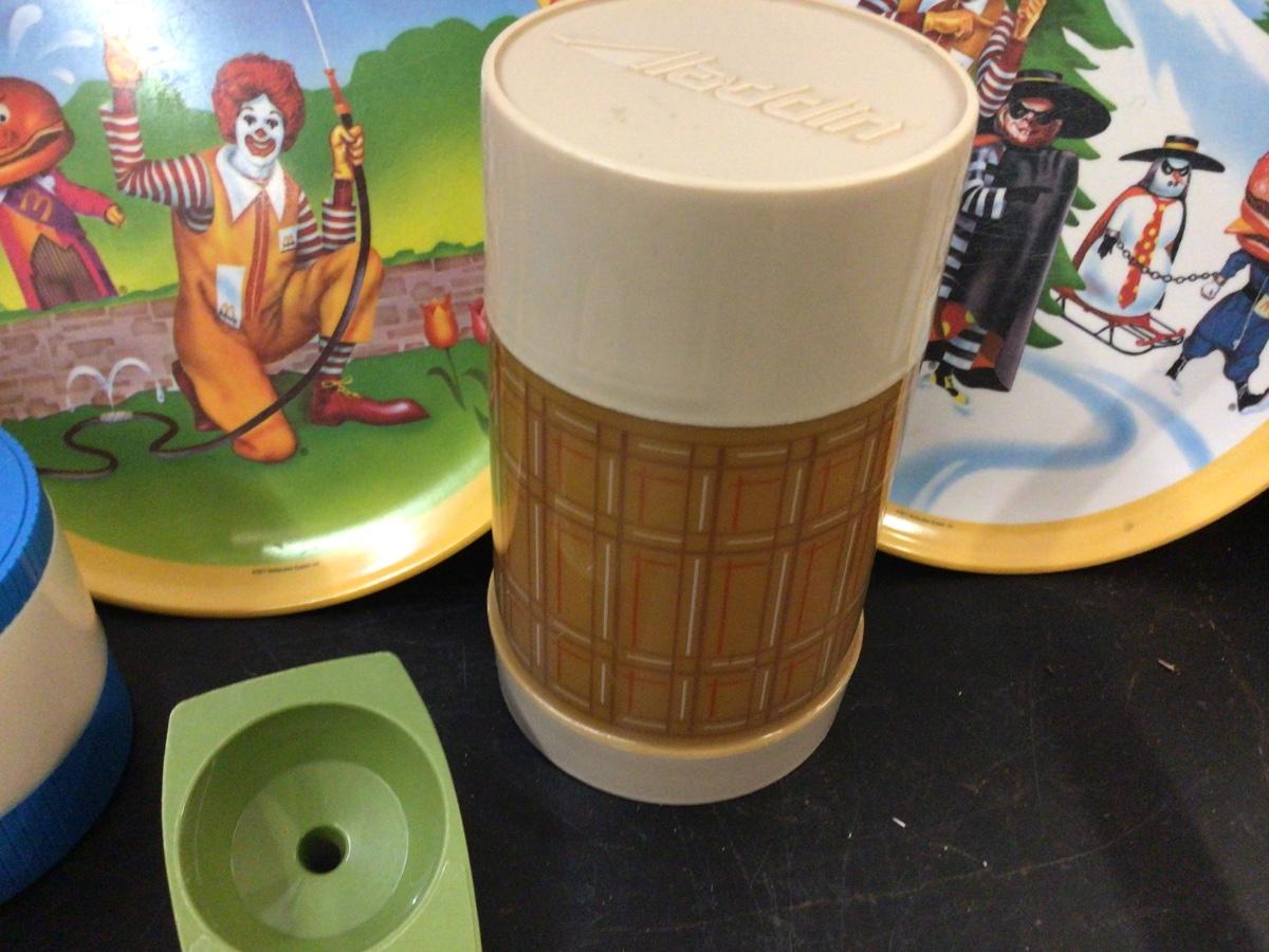 You get three plastic McDonalds 1970’s plates, two Aleddin thermoses, a plastic egg separator, and some plastic cup cake liners.