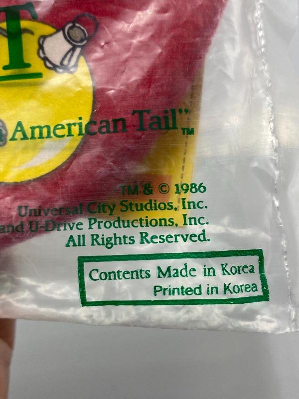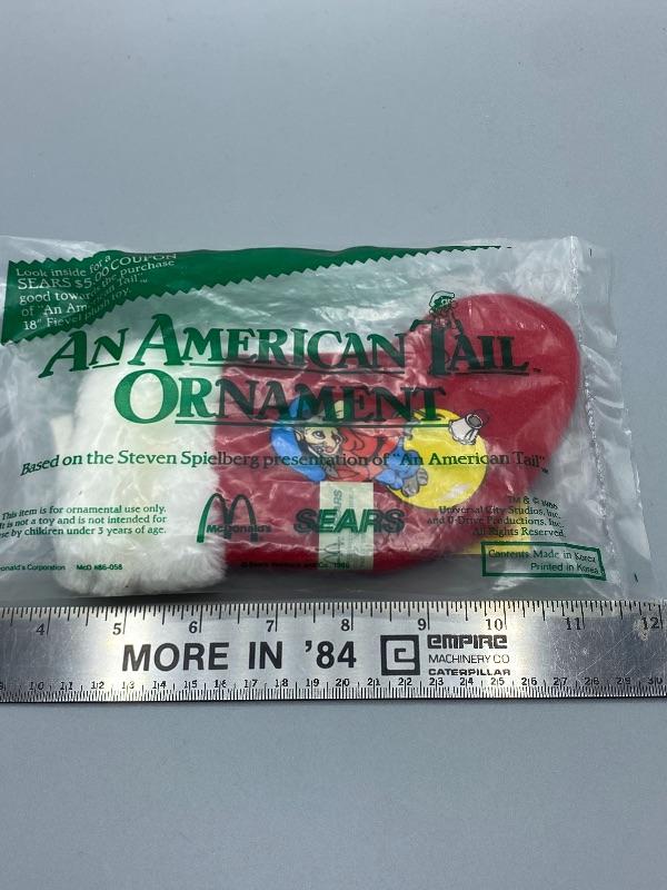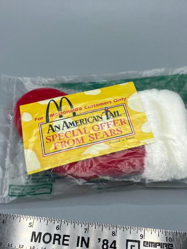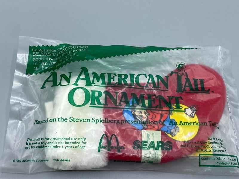 An American Tail Christmas stocking. Originally a McDonald's Happy Meal Toy from 1986, this stocking has never been removed from plastic. About 7" length. McDonald's partnered with Sear's for this promotional toy.