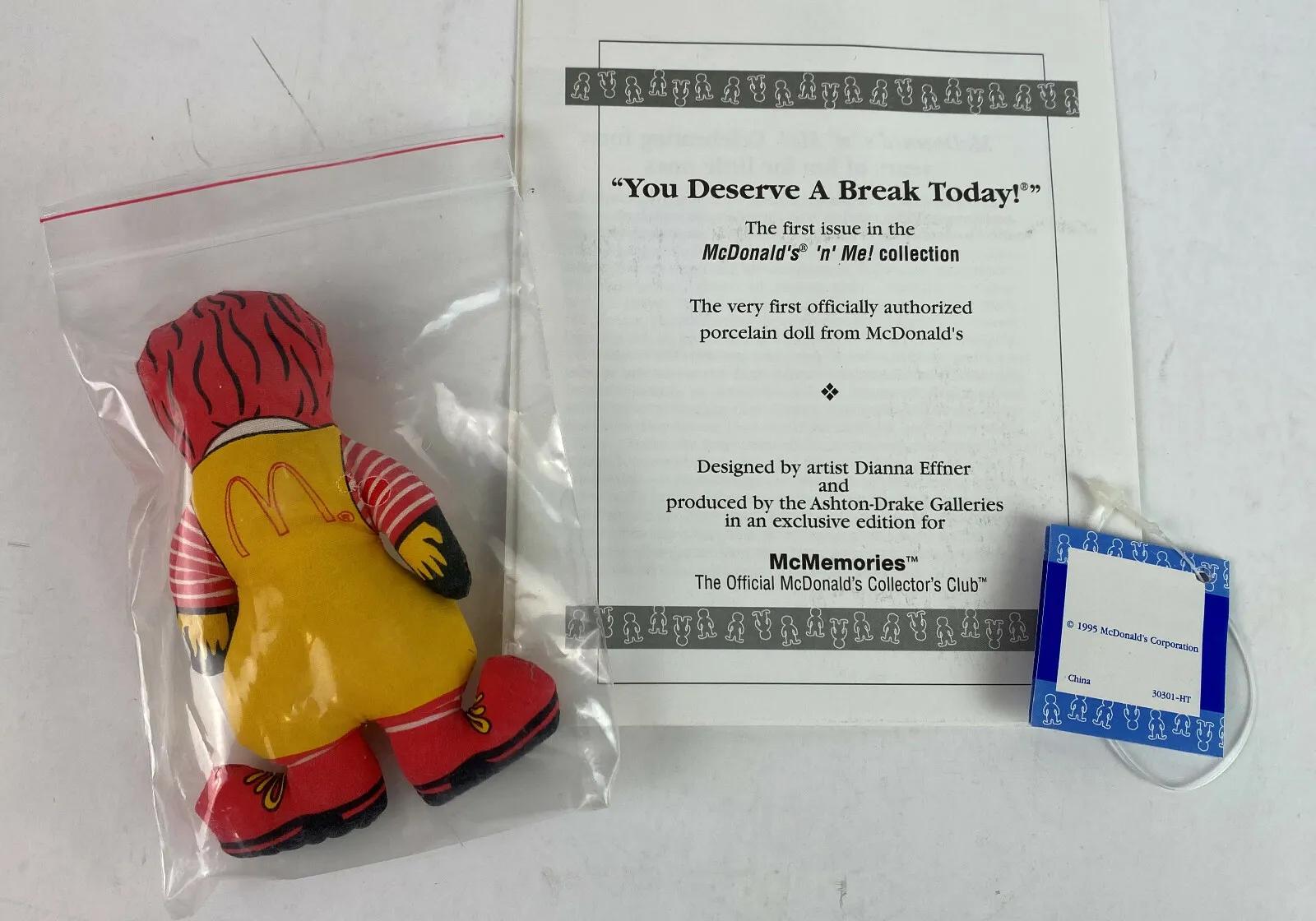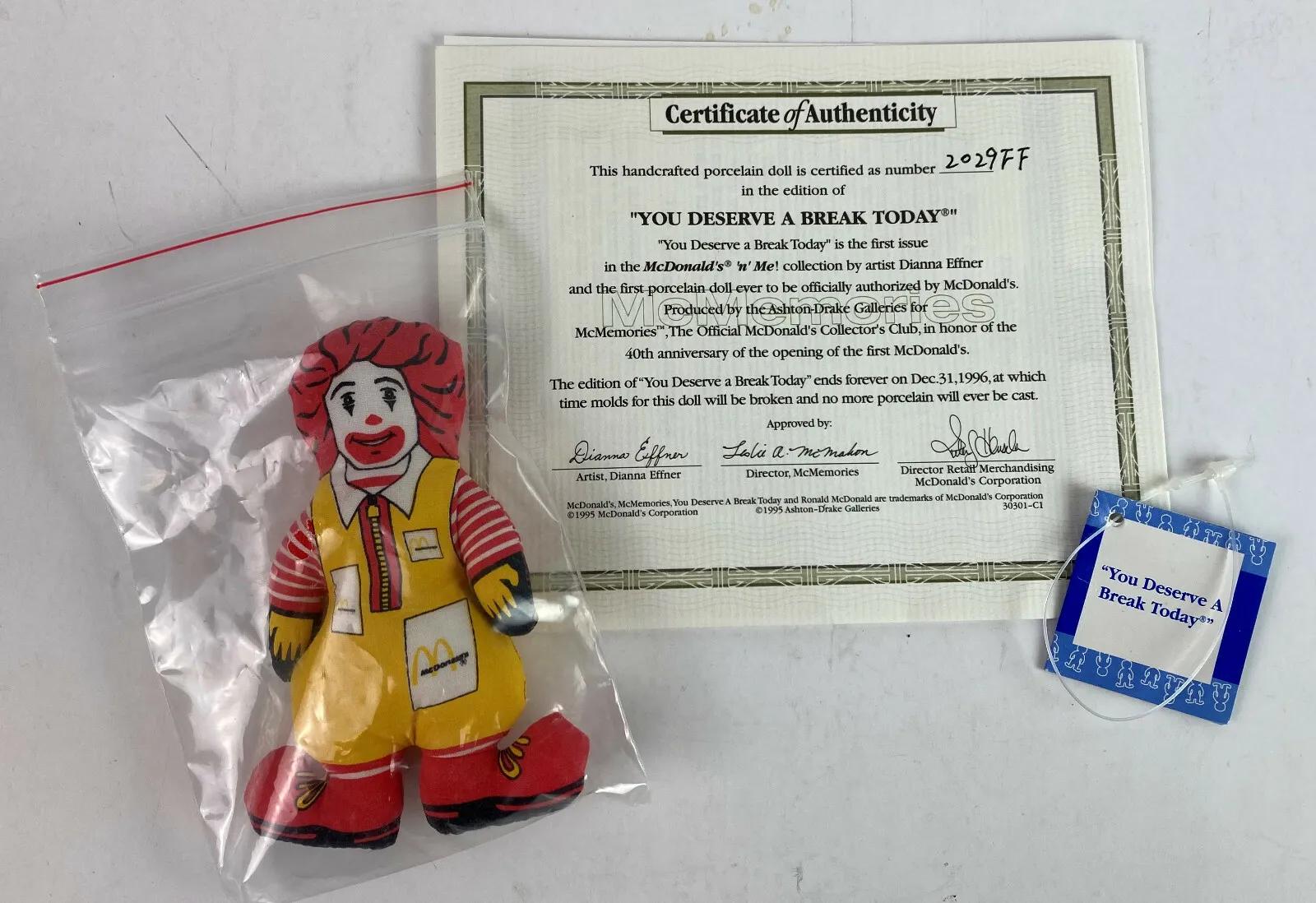 Issued for McDonald's 40th anniversary in 1996 here is a McMemories 12" handcrafted porcelain doll by artist Dianna Efner..."You Deserve A Break Today"...First edition 1995...made by Ashton-Drake Galleries...with original packaging and COA and small Ronald McDonald doll...#2029FF...New condition in box...