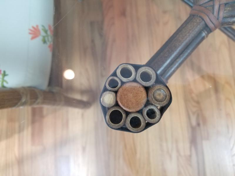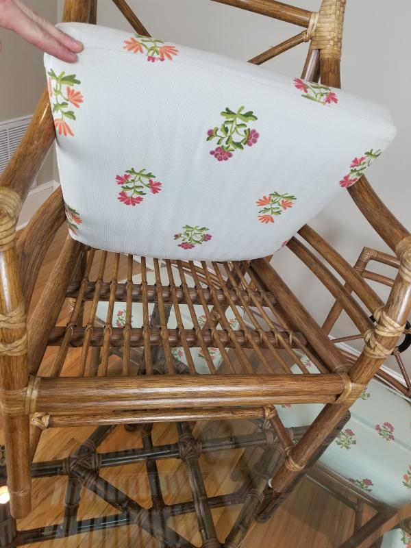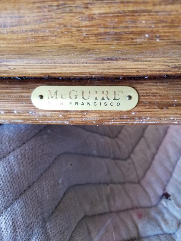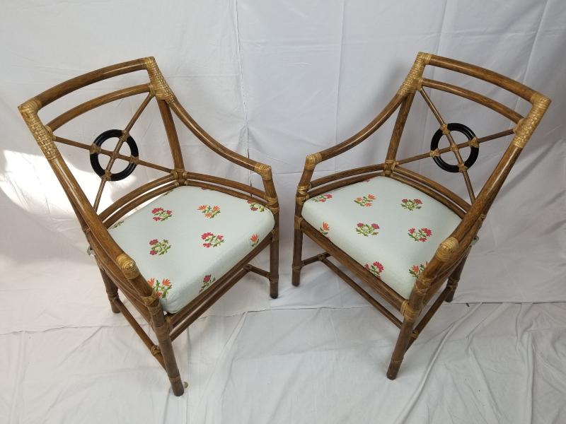 This is a wonderful set by McGuire! The chairs are called "Target" from McGuire and are still available.The outer ring of the chair is a contrasting dark color. There are 4 Arm Chairs and 4 regular side chairs. The seats are cushions and can be easily reupholstered in a fabric of your decor. Don't miss out on a great buy!