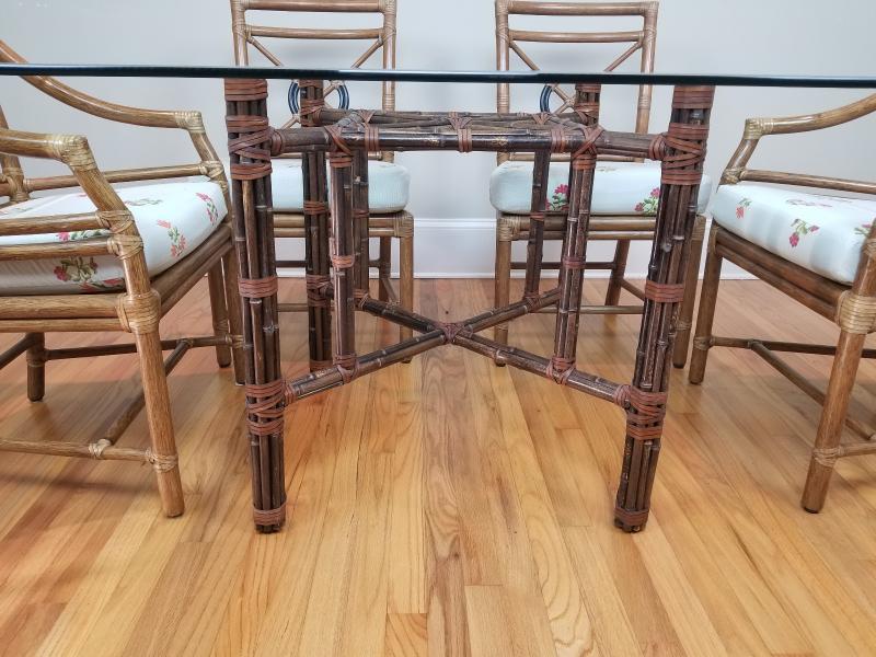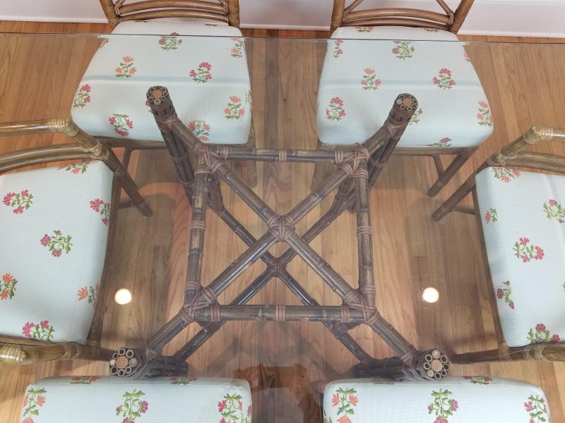 Beautiful Mint Condition McGuire Rattan Beveled Glass Top Table with 8 Target Style Chairs