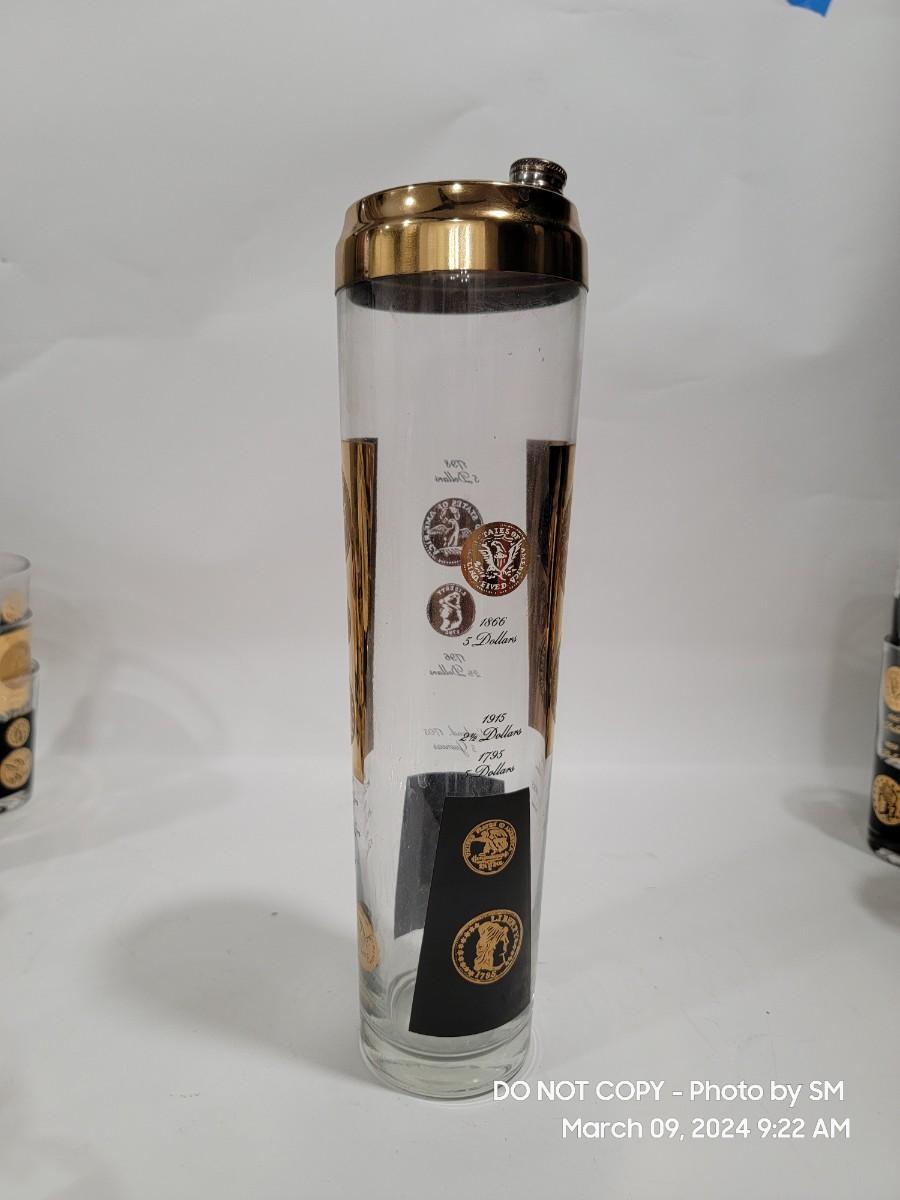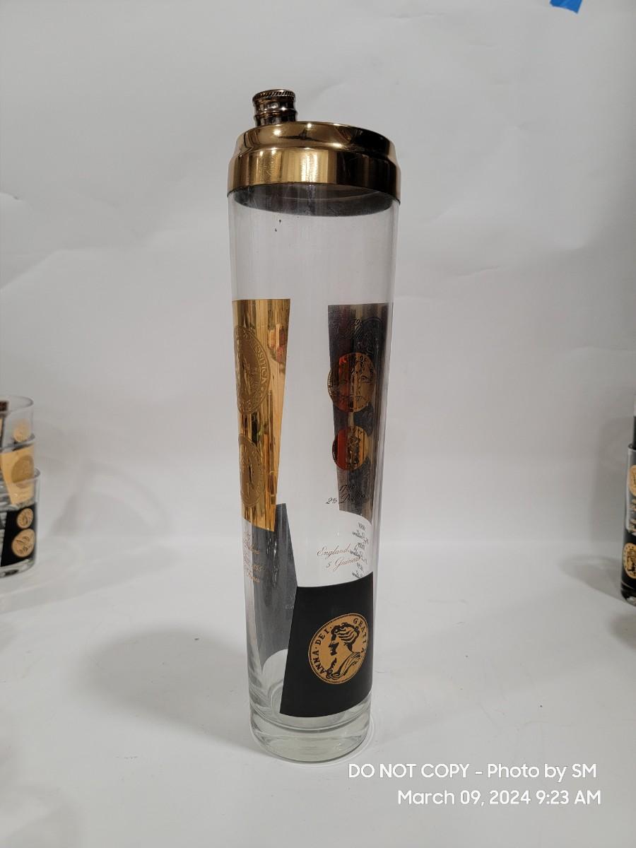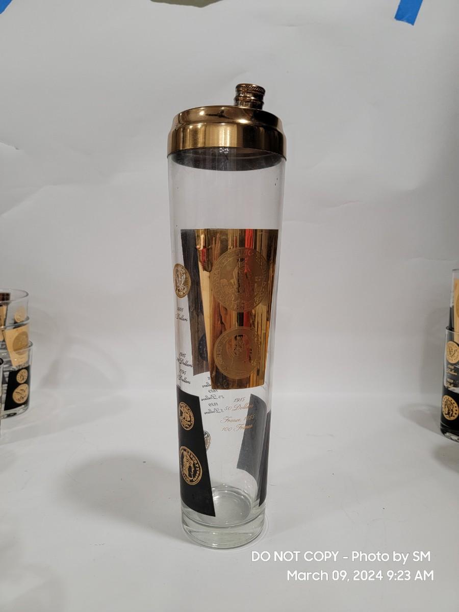 Listing is mainly for the cocktail shaker, but all the glasses are still esthetically pleasing and usable. This is a true dramatic display on an open bar. No chips.