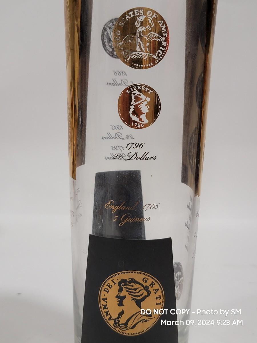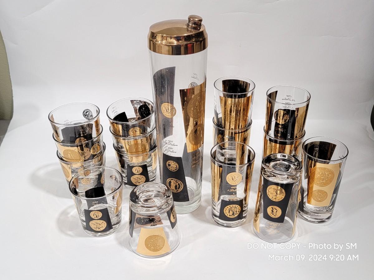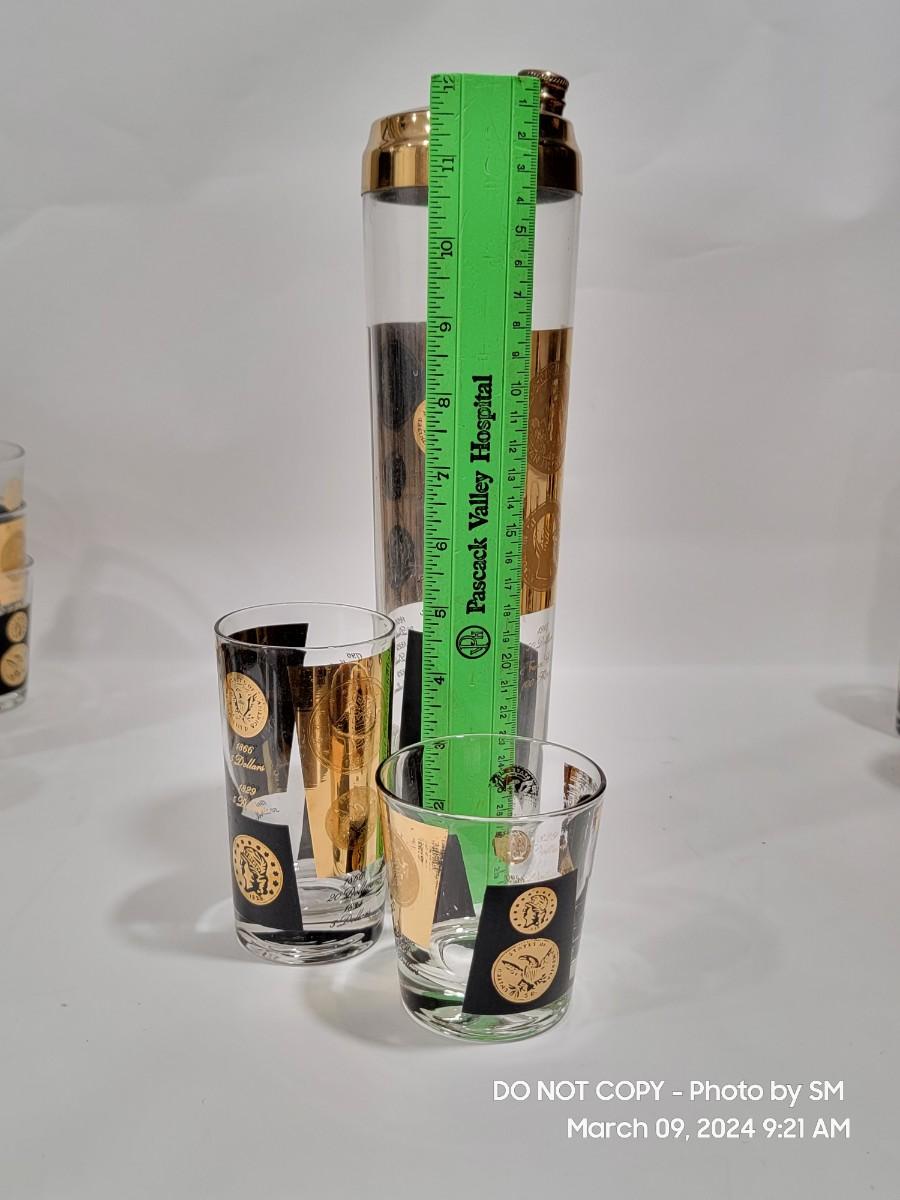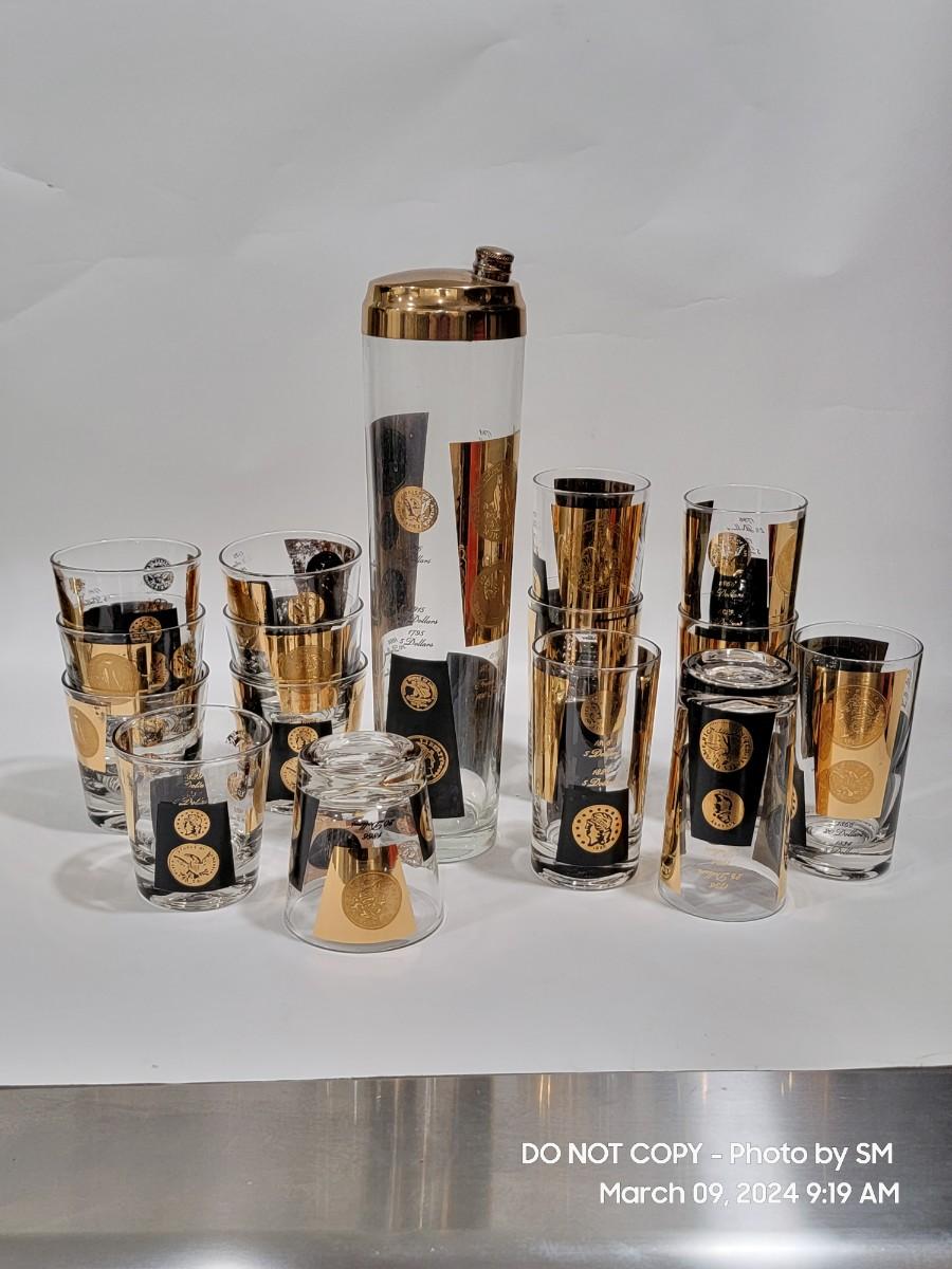 Listing is mainly for the cocktail shaker, but all the glasses are still esthetically pleasing and usable. This is a true dramatic display on an open bar. No chips.