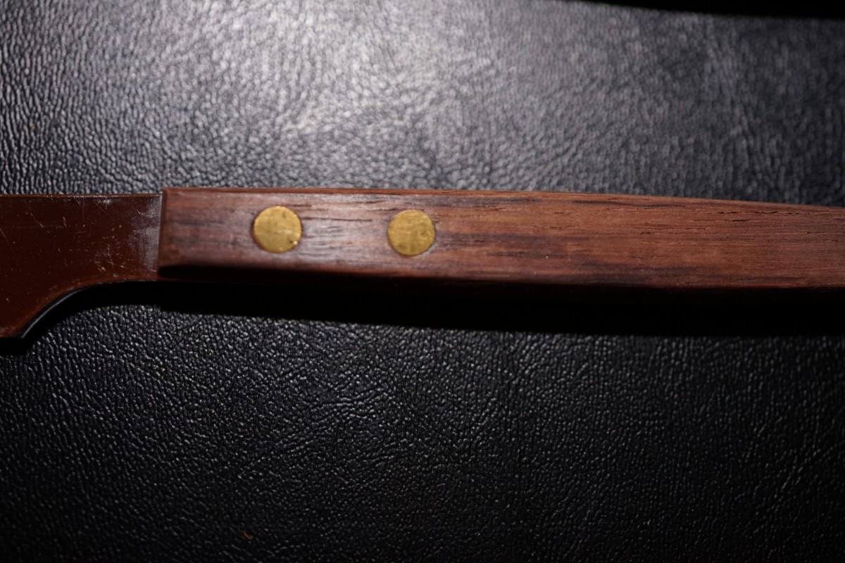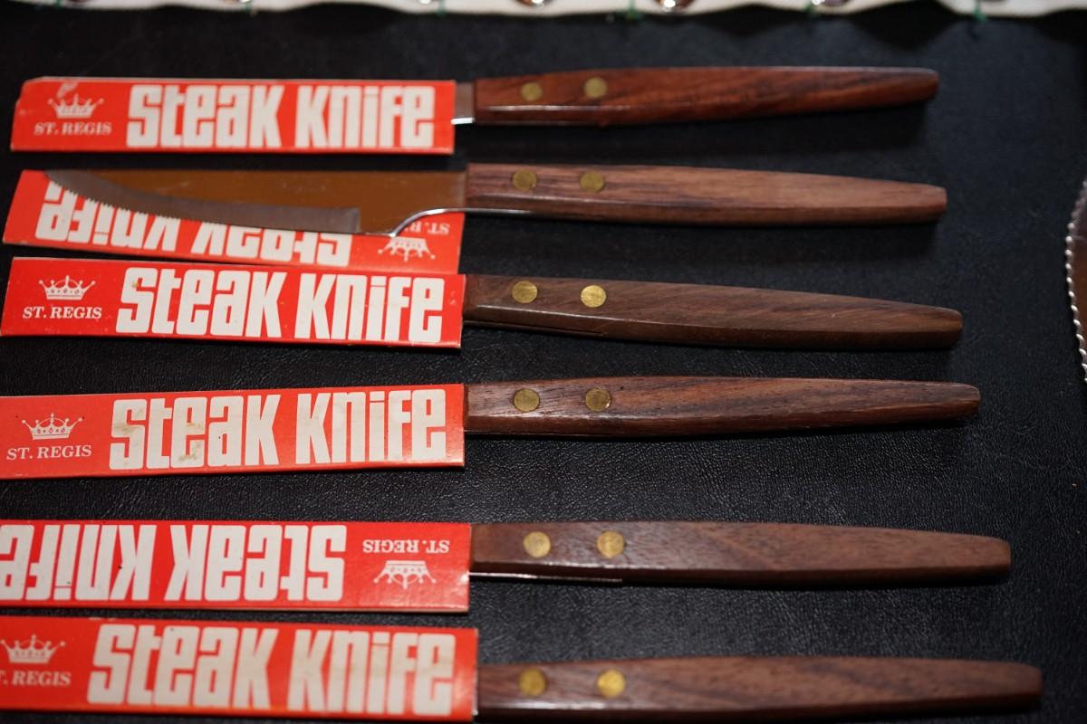 St. Regis Steak Knives group of six mahogany handle with inlay of brass buttons.