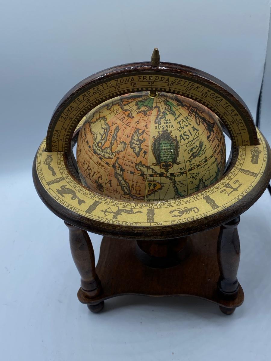 Retro globe with early Italian representation of world , astrology around the side, About 9” tall and wide. FUN!