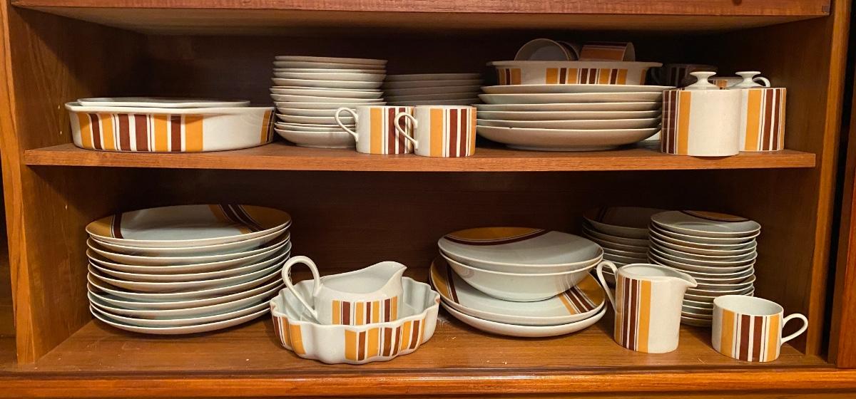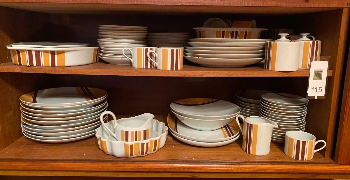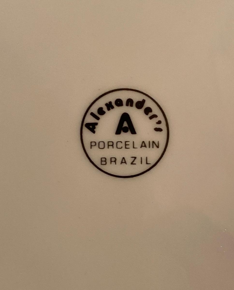 Mid Century Modern Alexander's Porcelain Brazil dish set with a cool pattern. (17) 10" plates, (2) 10" bowls, (2) 15" platters, (1) 8.5" serving dish, (16) 2.5" mugs, (2) 4" creamers, (2) 3" sugar jars, (1) 3" gravy dish, (1)6 6" saucers, (15) 6" small plates, (16) 8" bowls, (1) 12" casserole dish, (1) 16" casserole dish