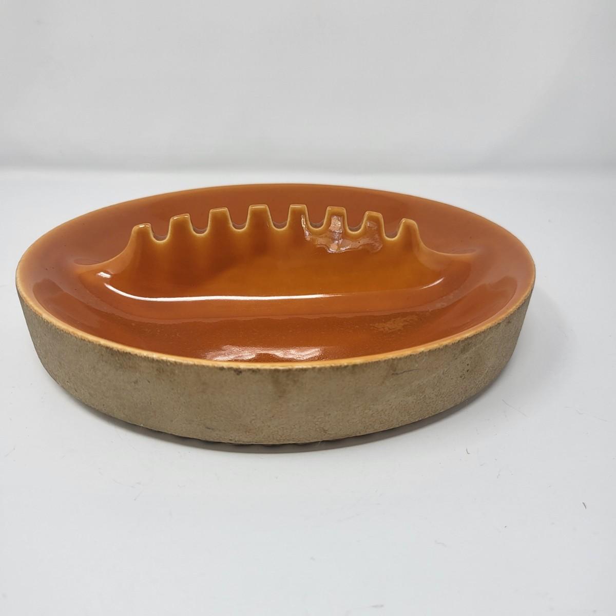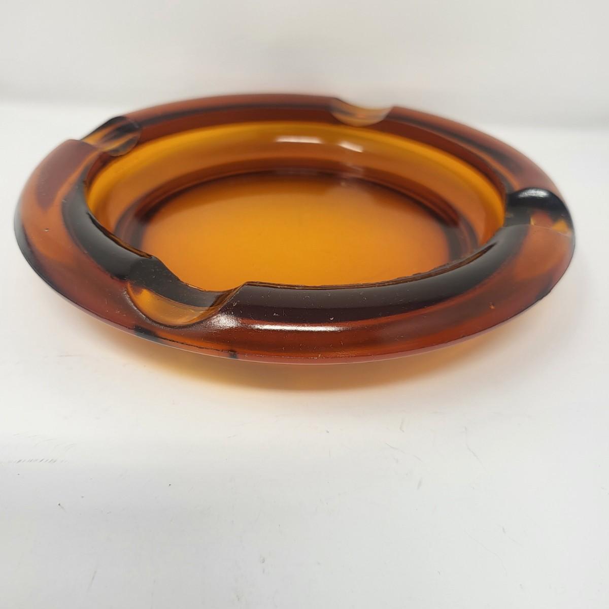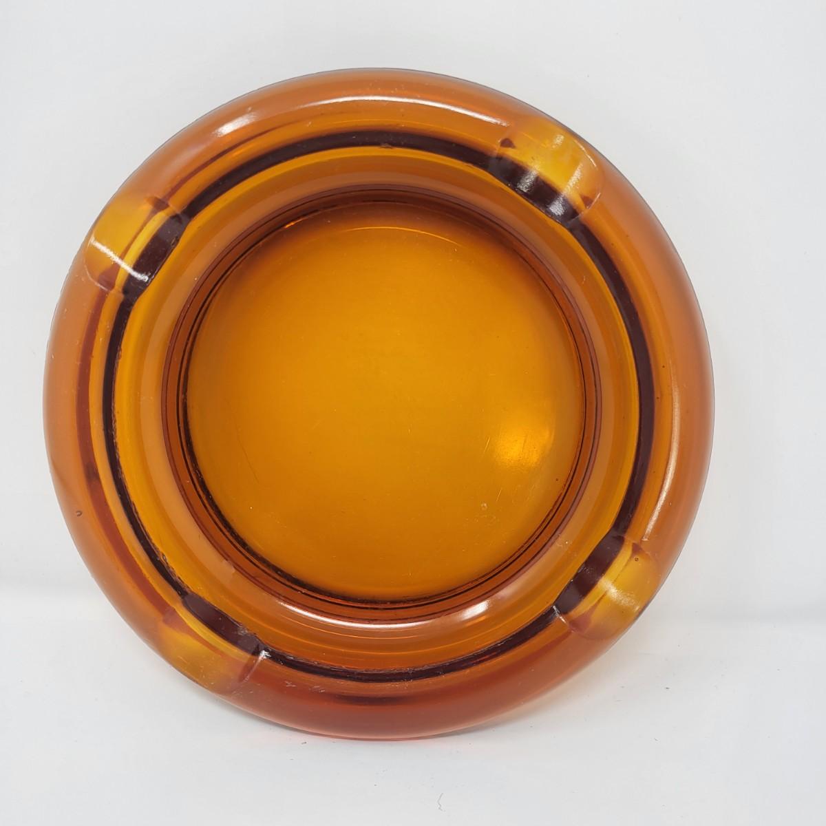 Two different MCM ashtrays. Amber glass and Hyalyn #765 glazed ceramic, 8" diameter x 1.5" tall.