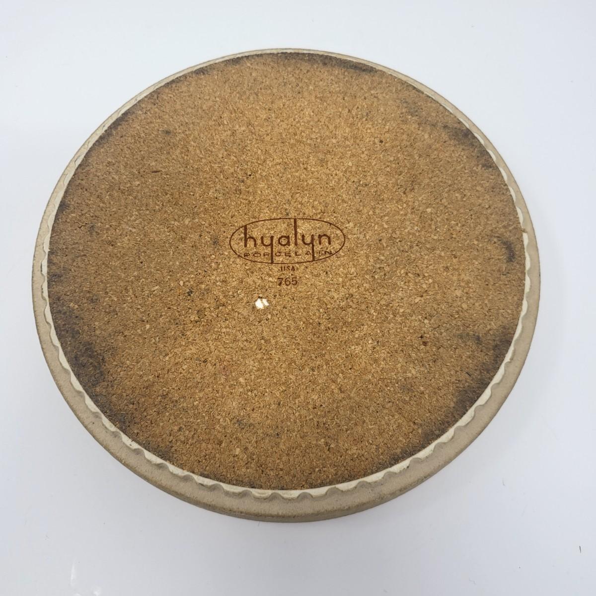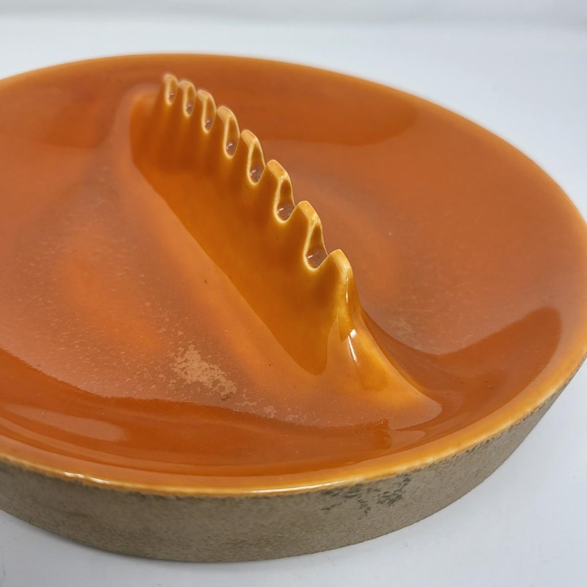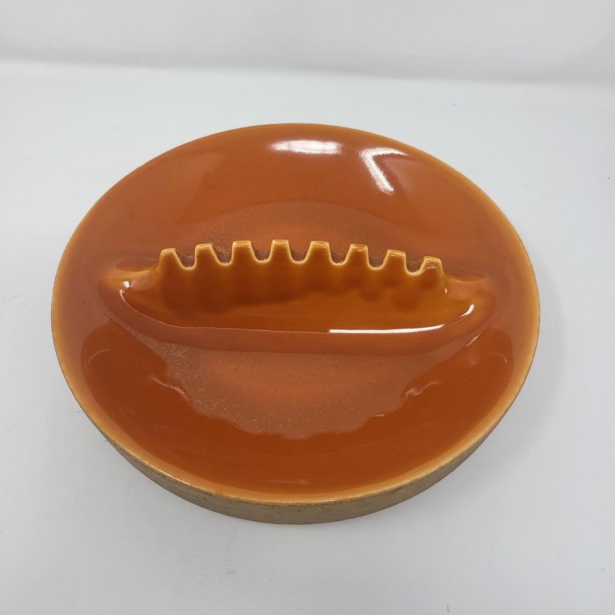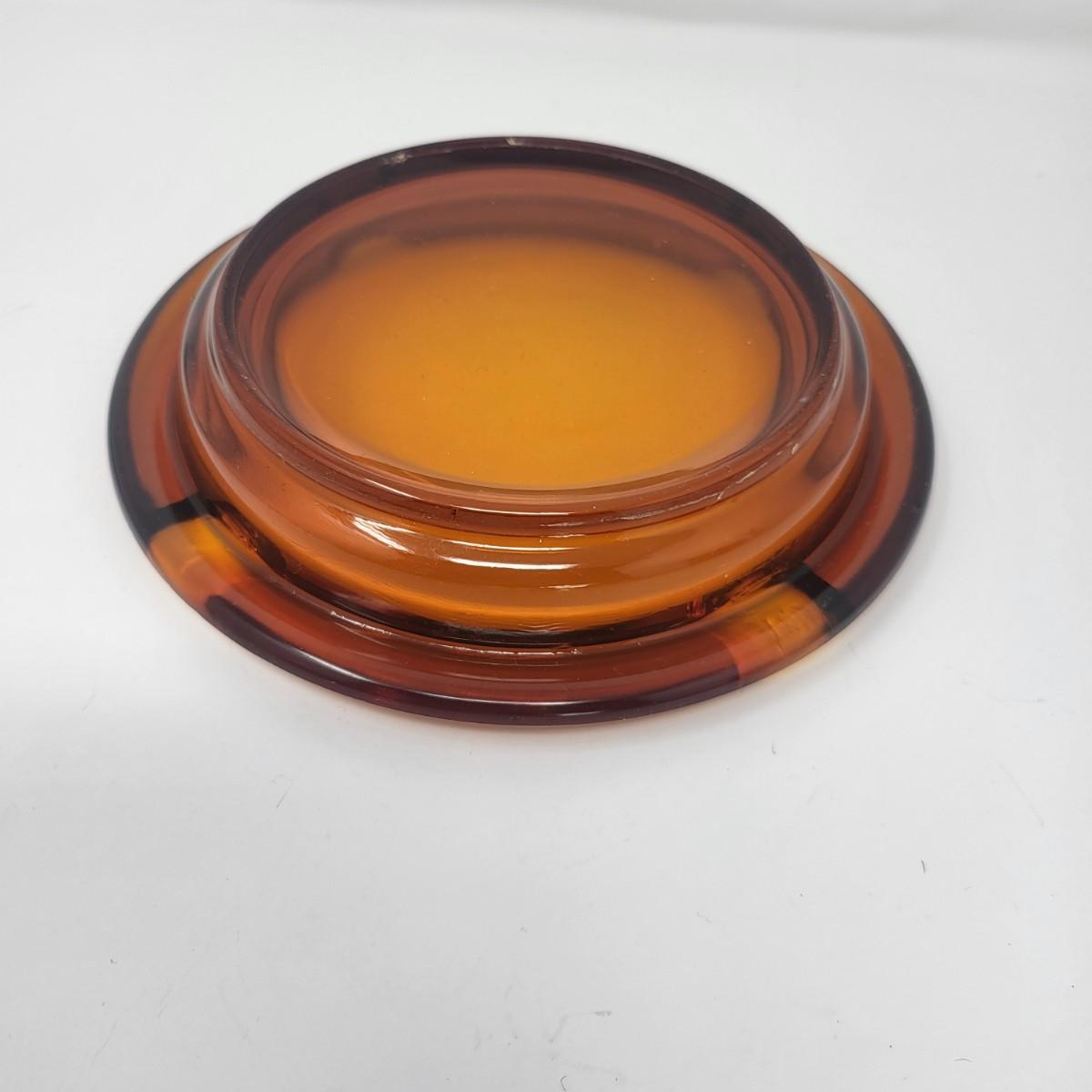 Two different MCM ashtrays. Amber glass and Hyalyn #765 glazed ceramic, 8" diameter x 1.5" tall.