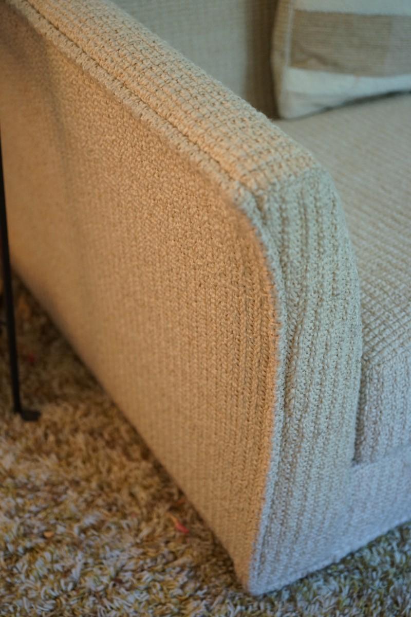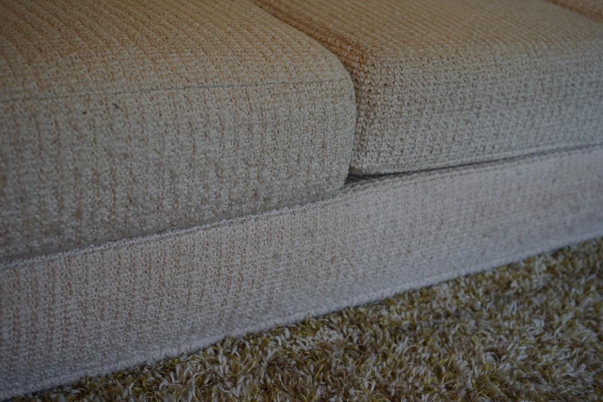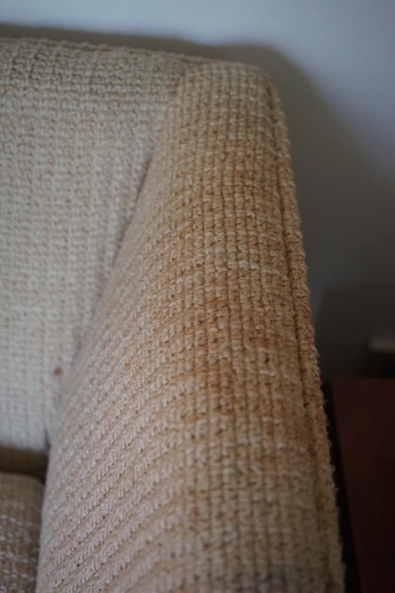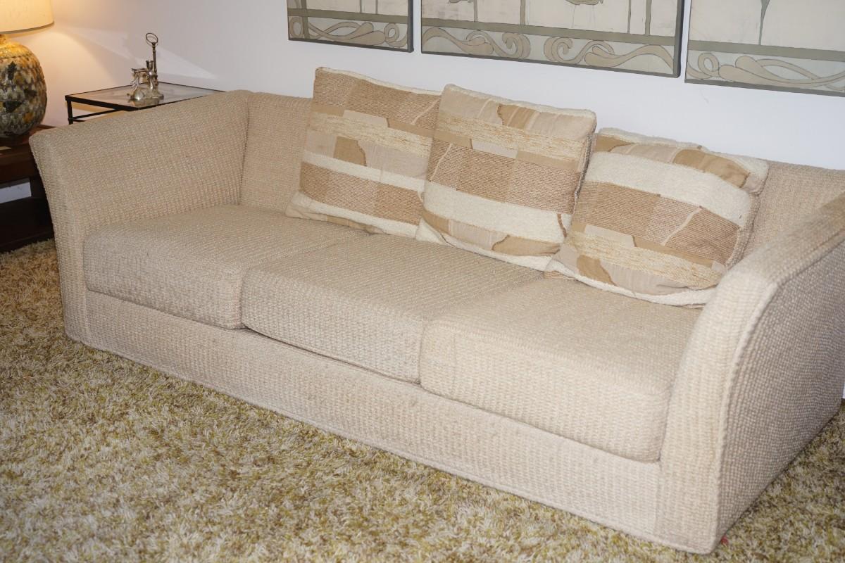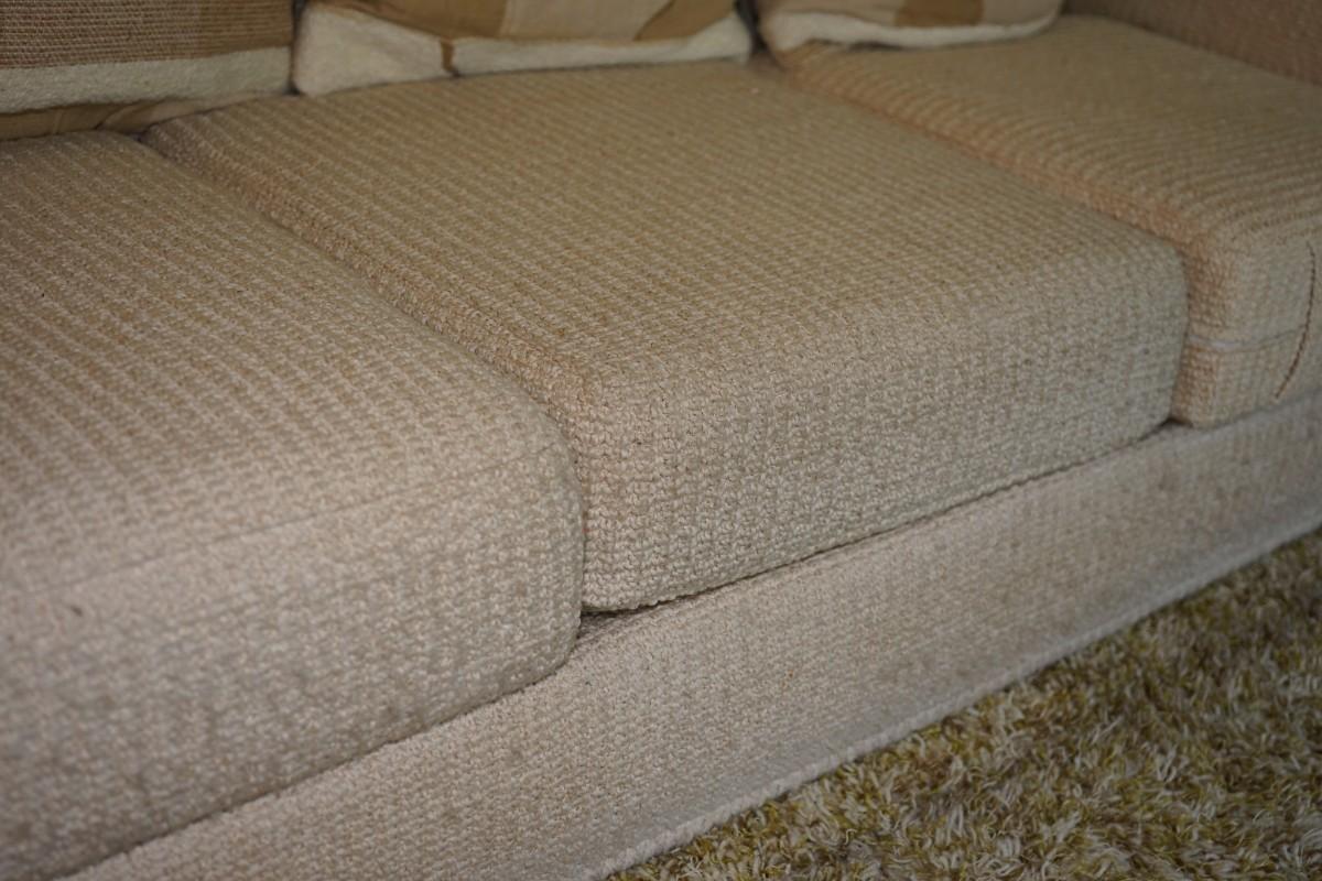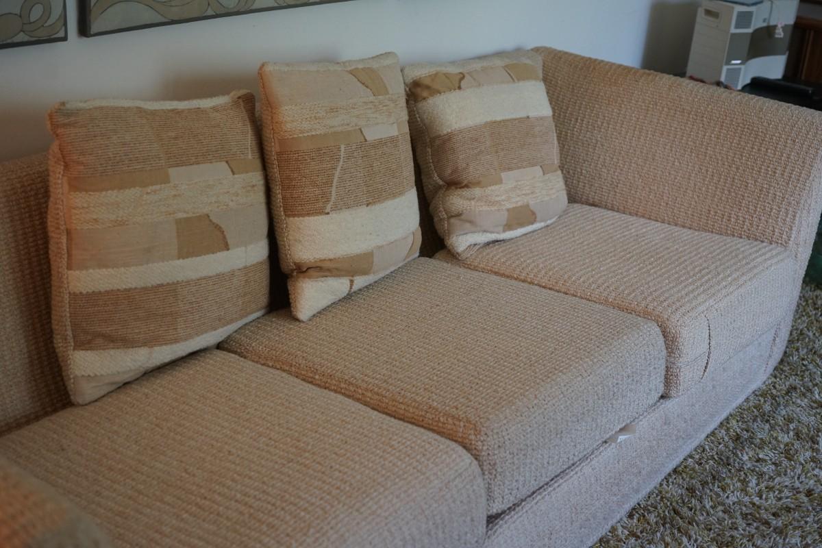 1970's-80's mcm sofa that is very comfortable. has three pillows. woven textured upholstery