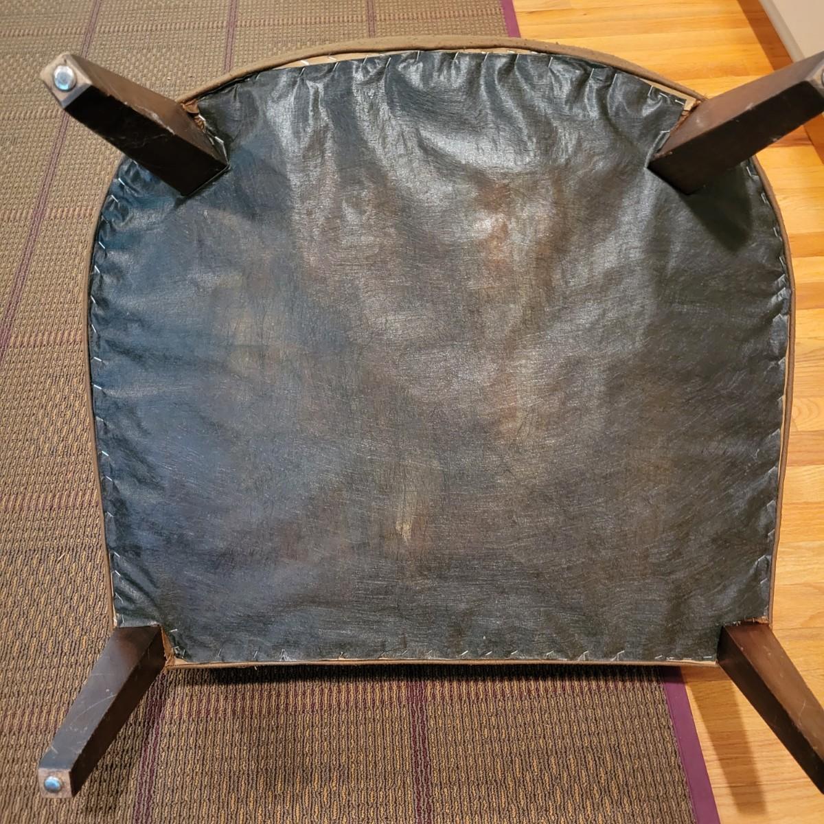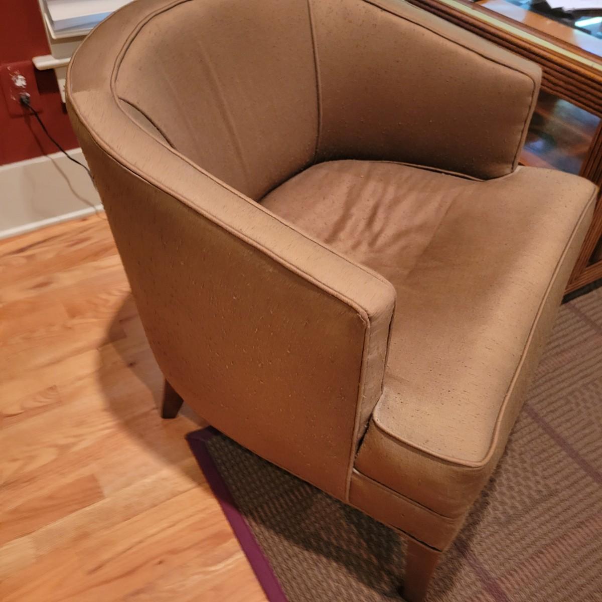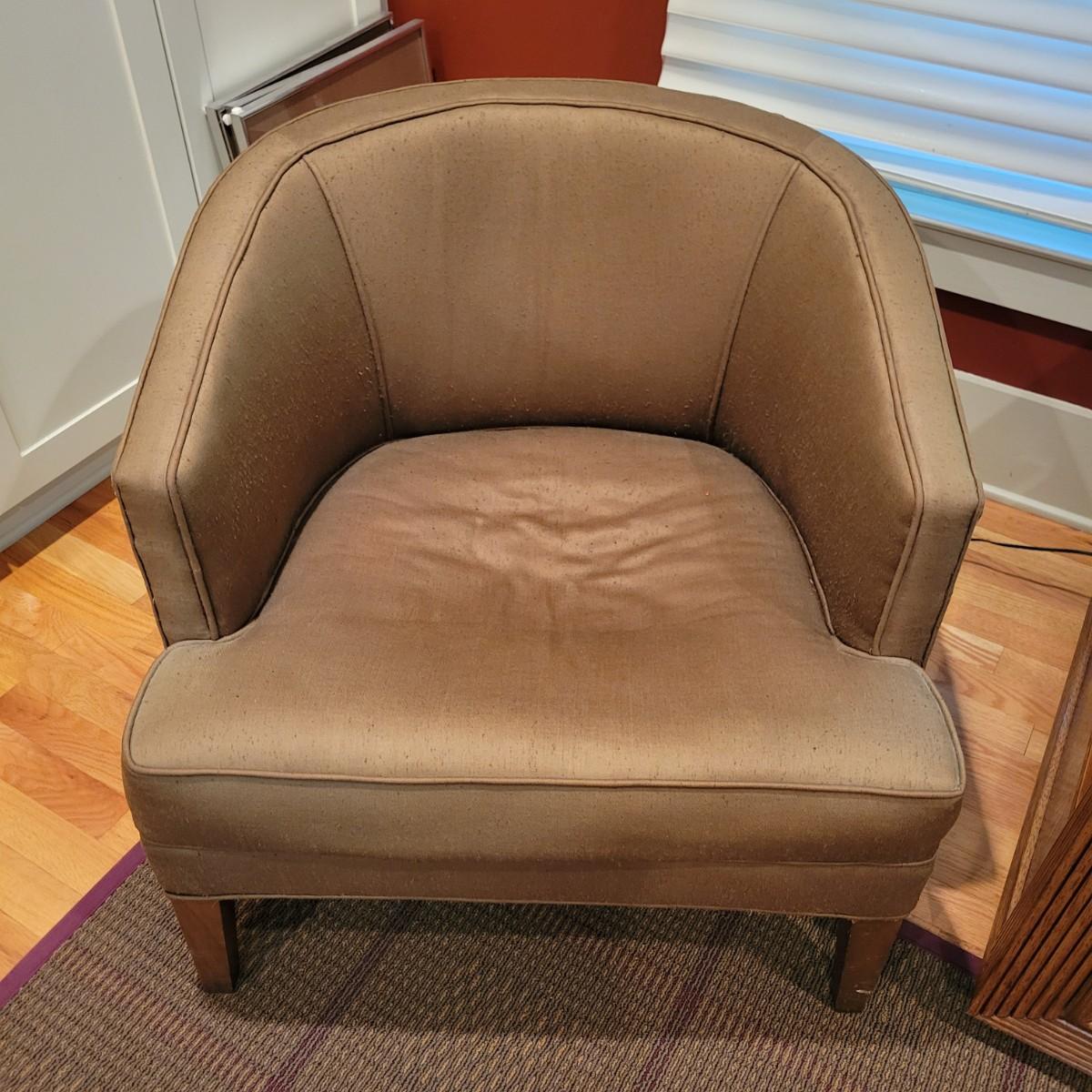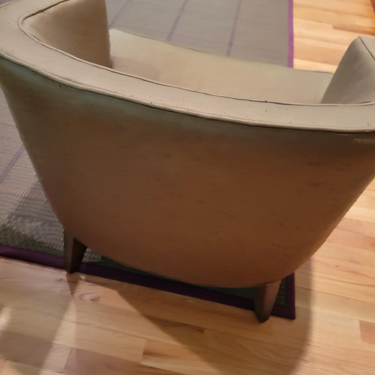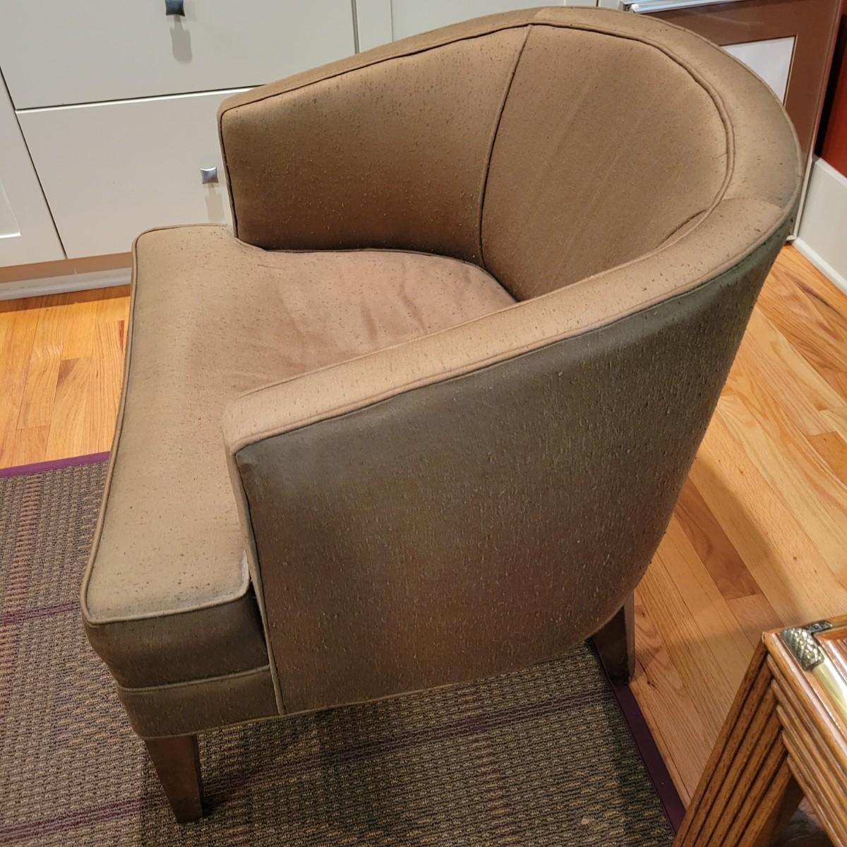 A MCM barrel style chair with a distressed brown upholstery. This chair measures approximately 27" x 27" x 27"H with a seat height of 15". This chair does show some wear on the cushion from use and is not removable. The seat is well worn. Local pickup only