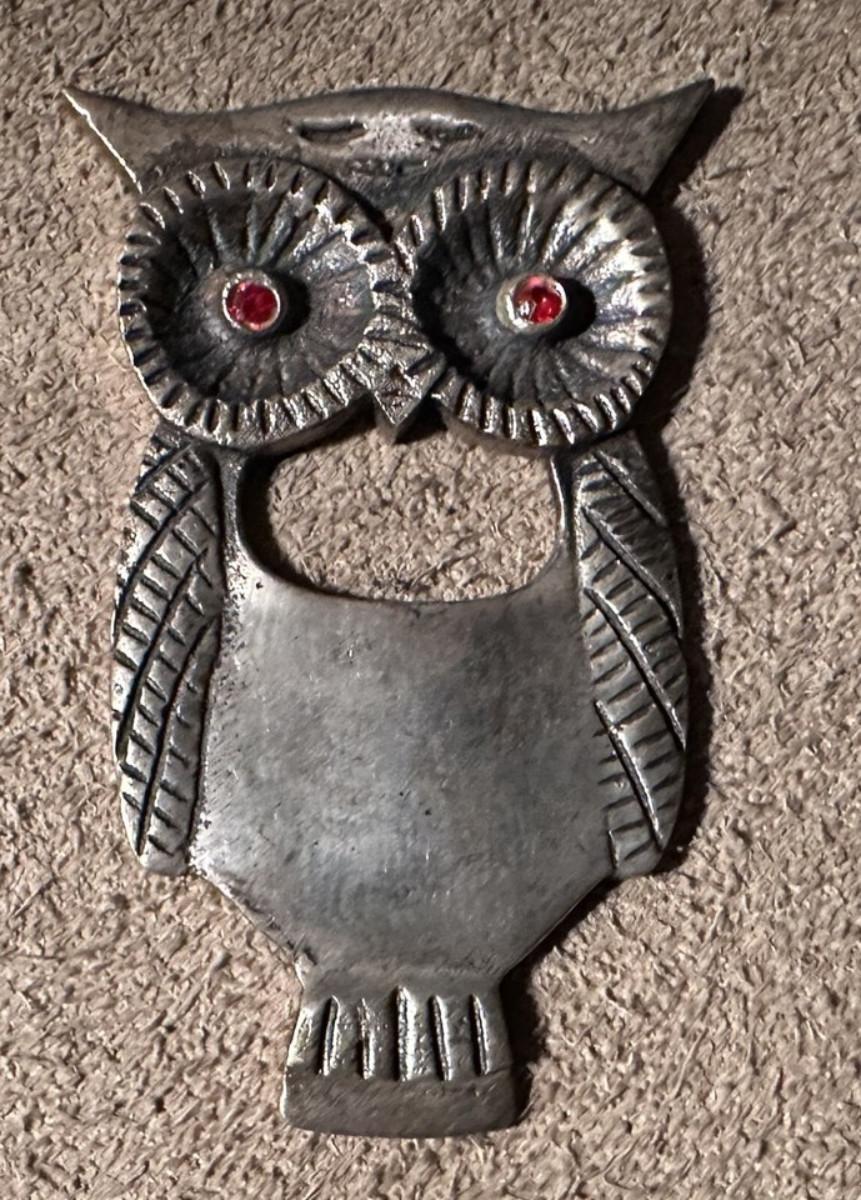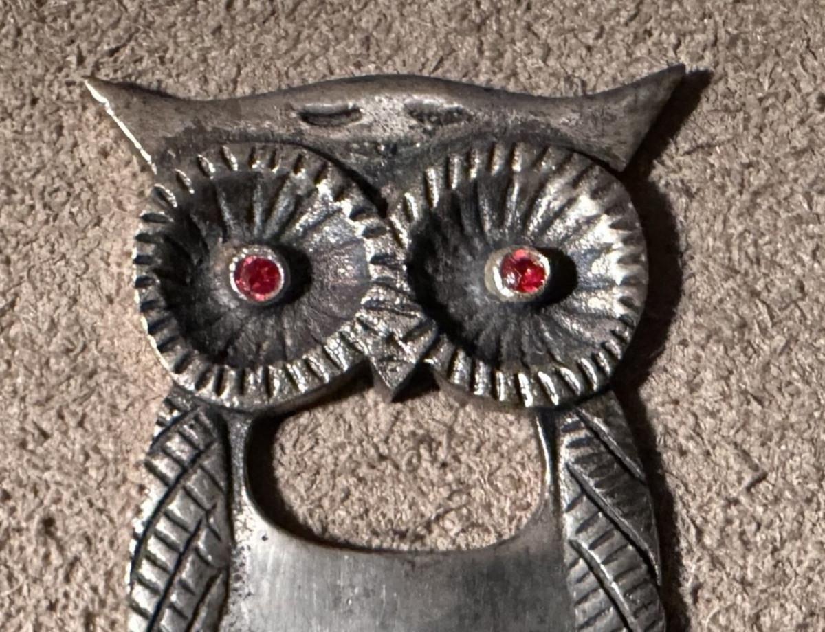 Here is a heavy cast metal Owl bottle opener...4" x 2.5" Mid Century Modern novelty barware...as shown..Good condition..I believe it may be nickel over brass...Red rhinestone eyes...Unique..