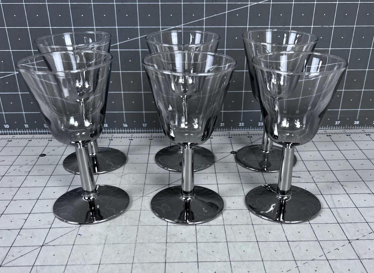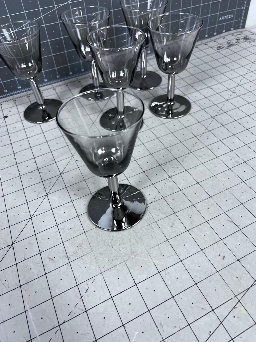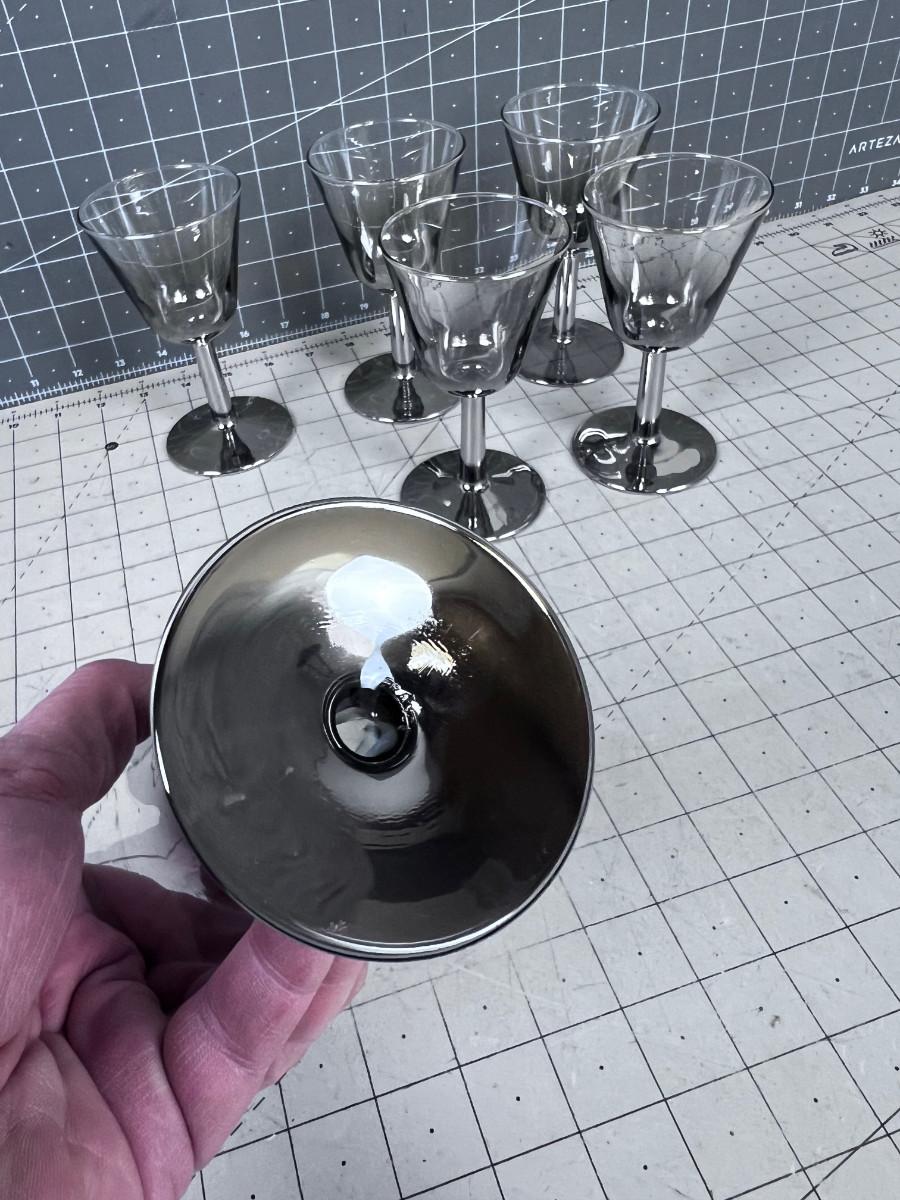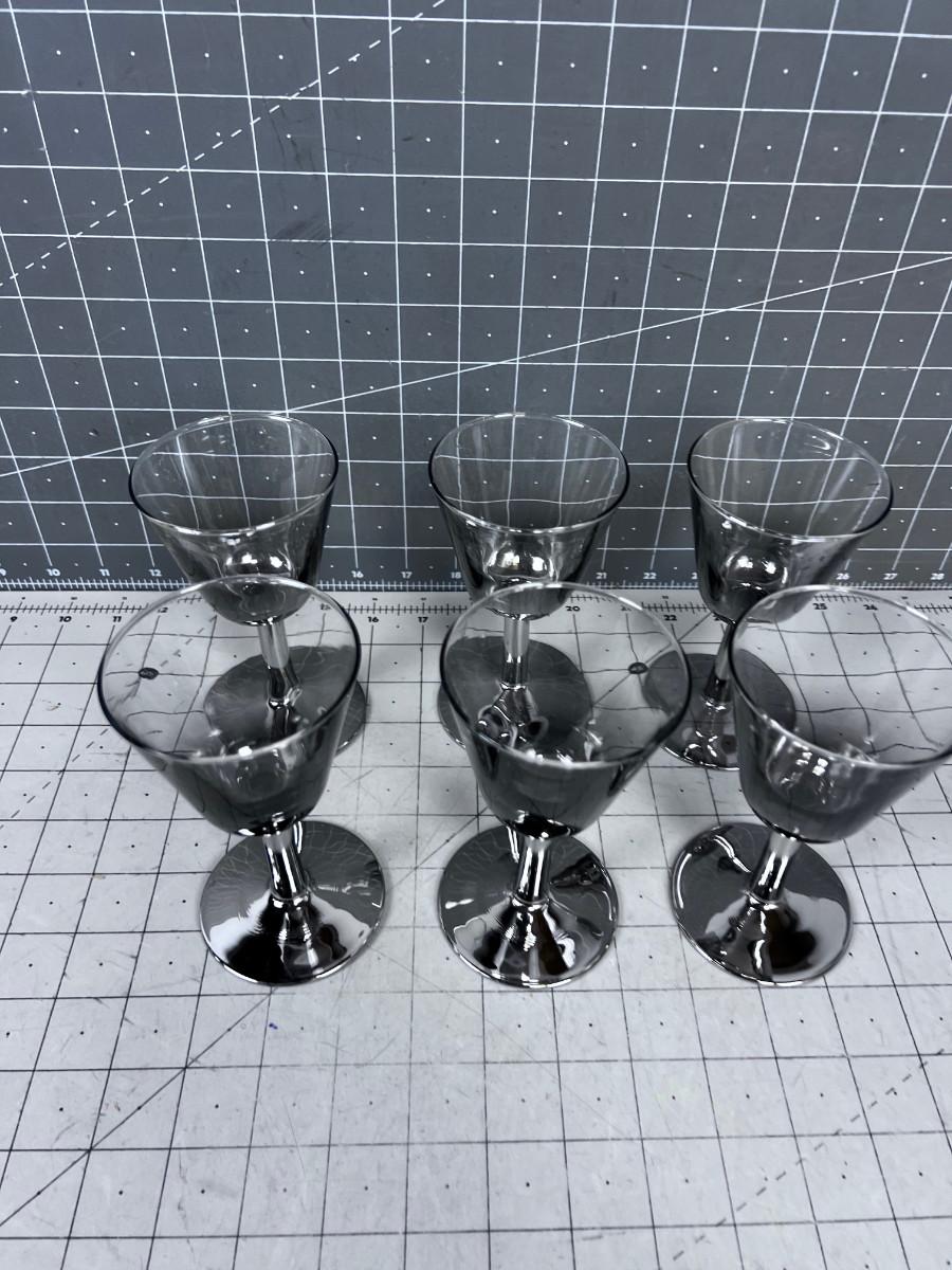Excellent condition on this vintage barware from the Mid Century...Set of six(6) mercury silver fade stemware..Cordial shape glasses..5 1/4" high x 2 7/8" wide...Made in France.