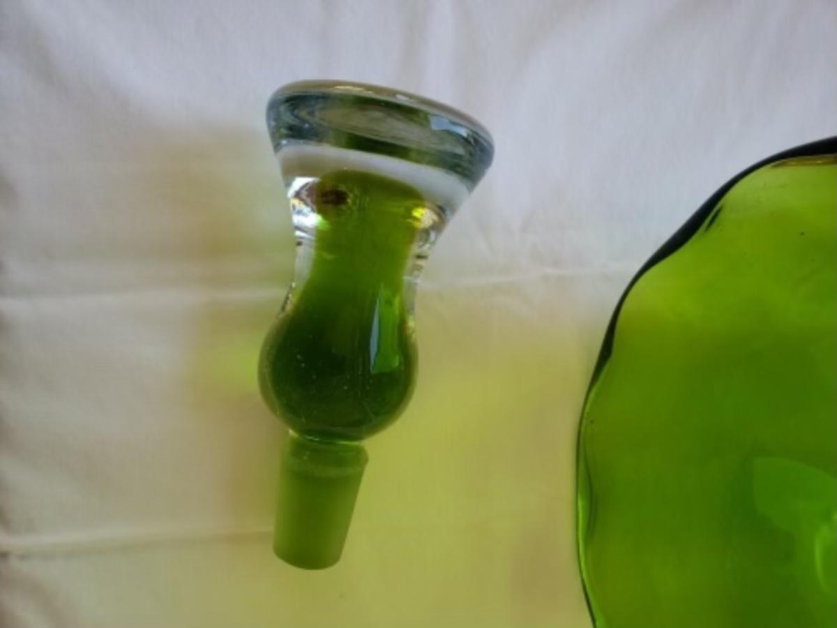 MCM Blenko lime green decanter with green and clear glass stopper. Decanter size 16.5" H x 8"W. Height with stopper. 20.5". Excellent Condition.