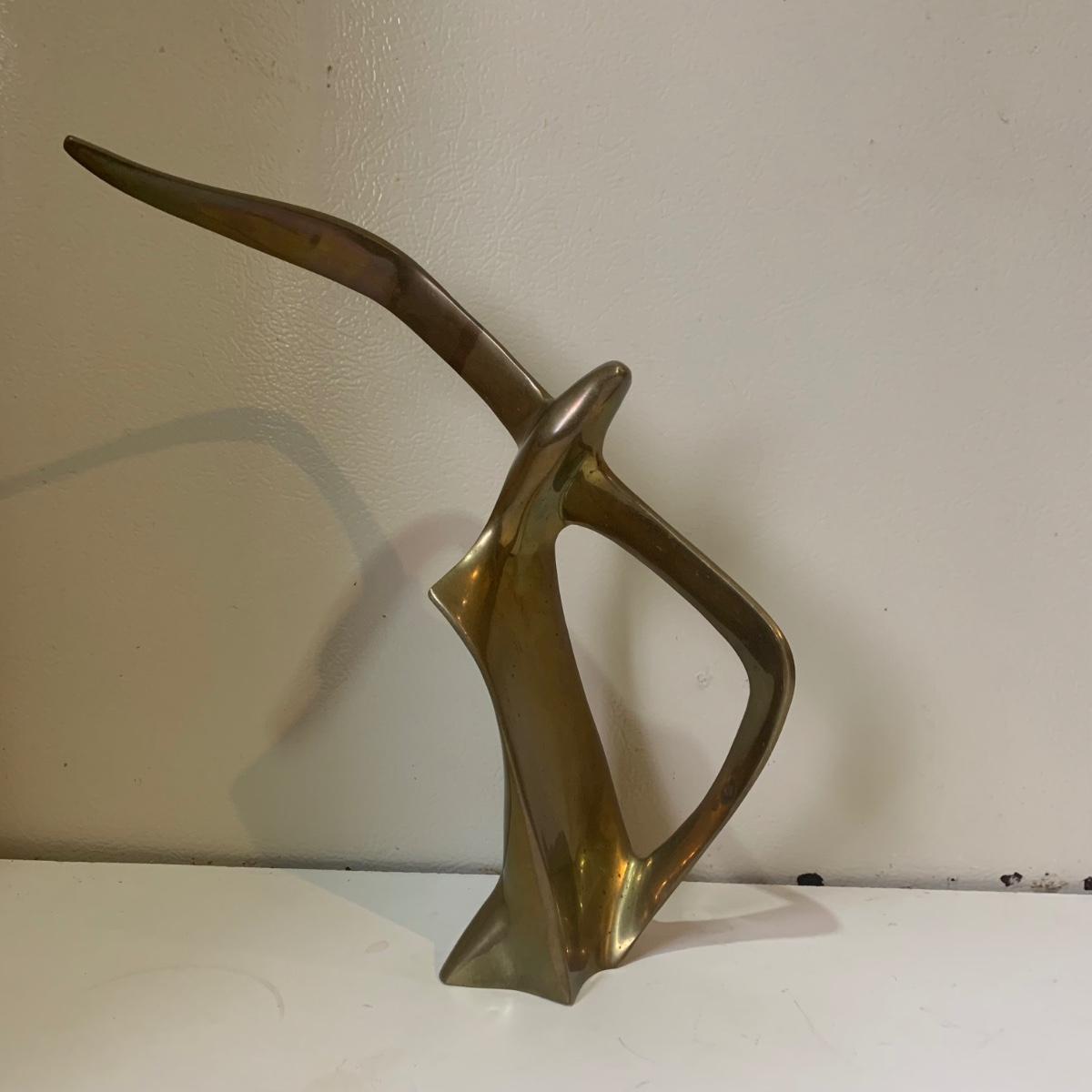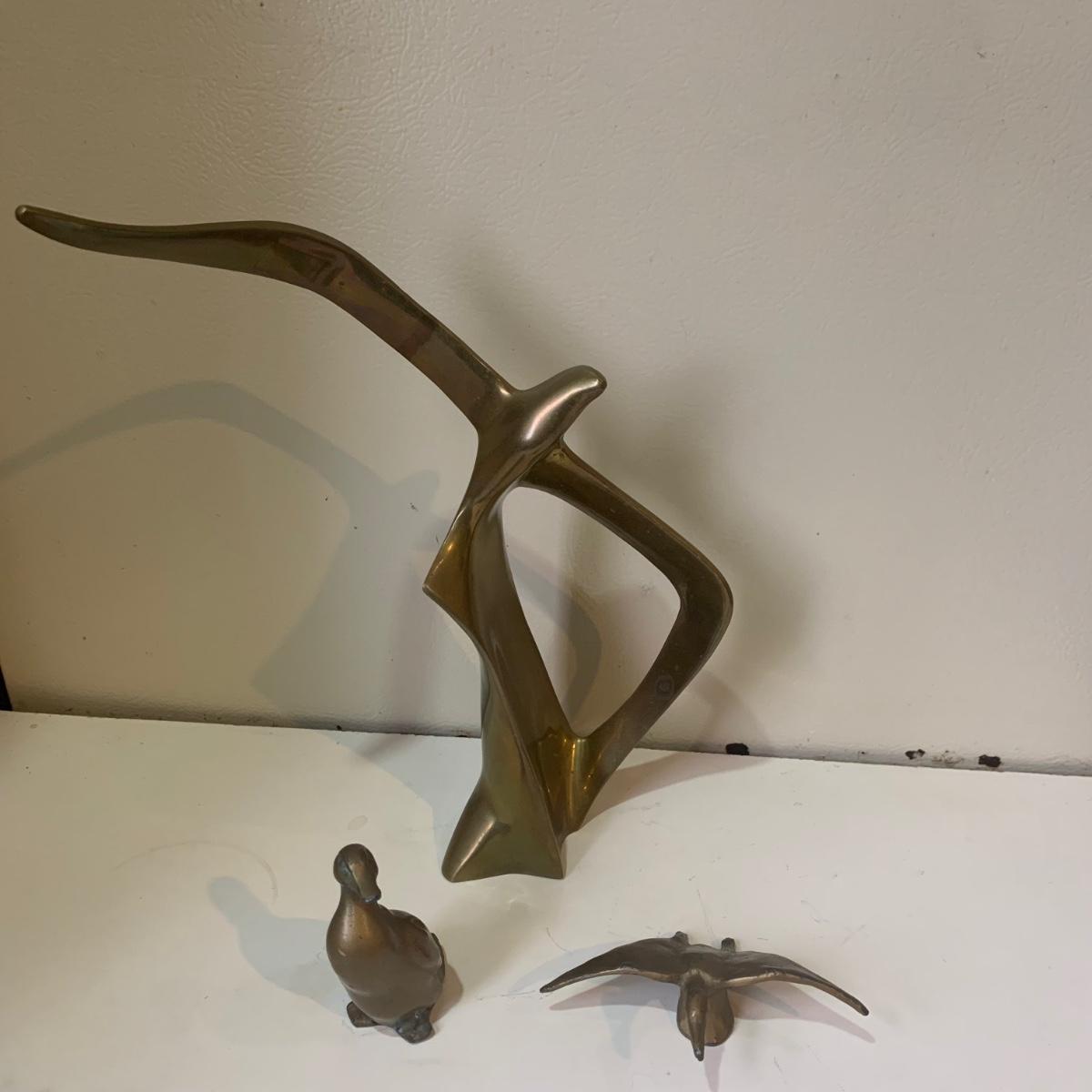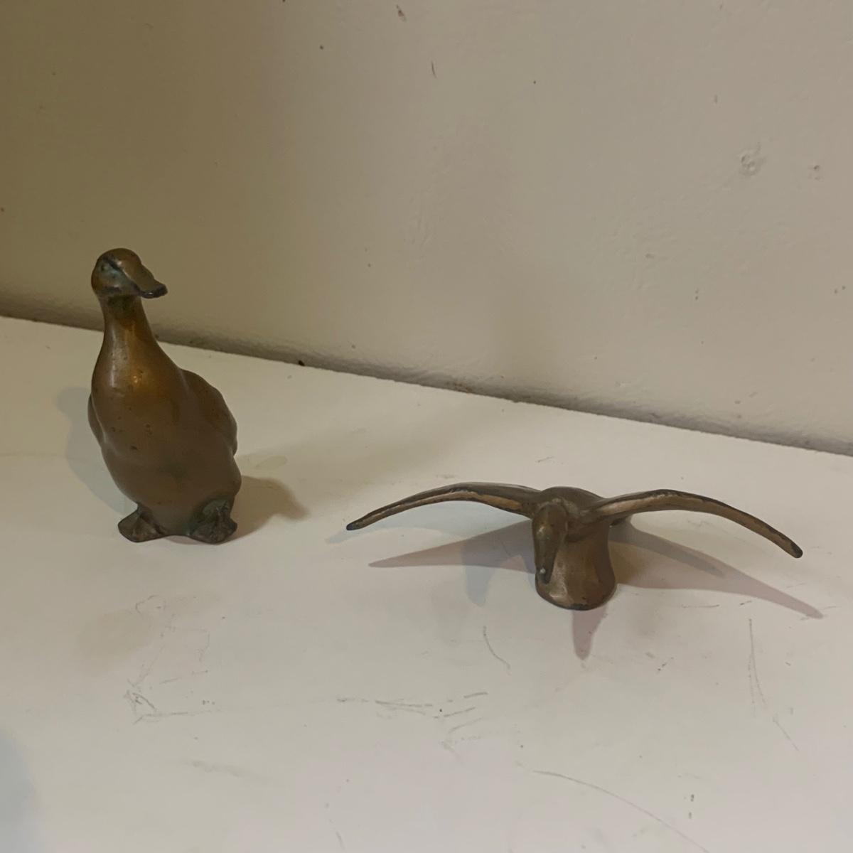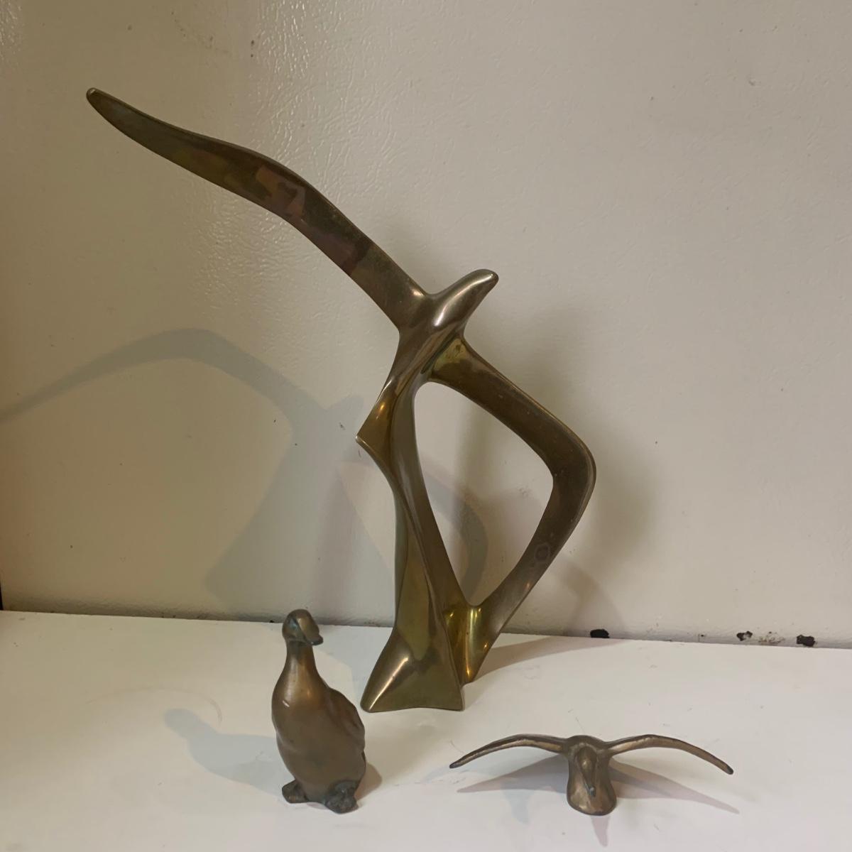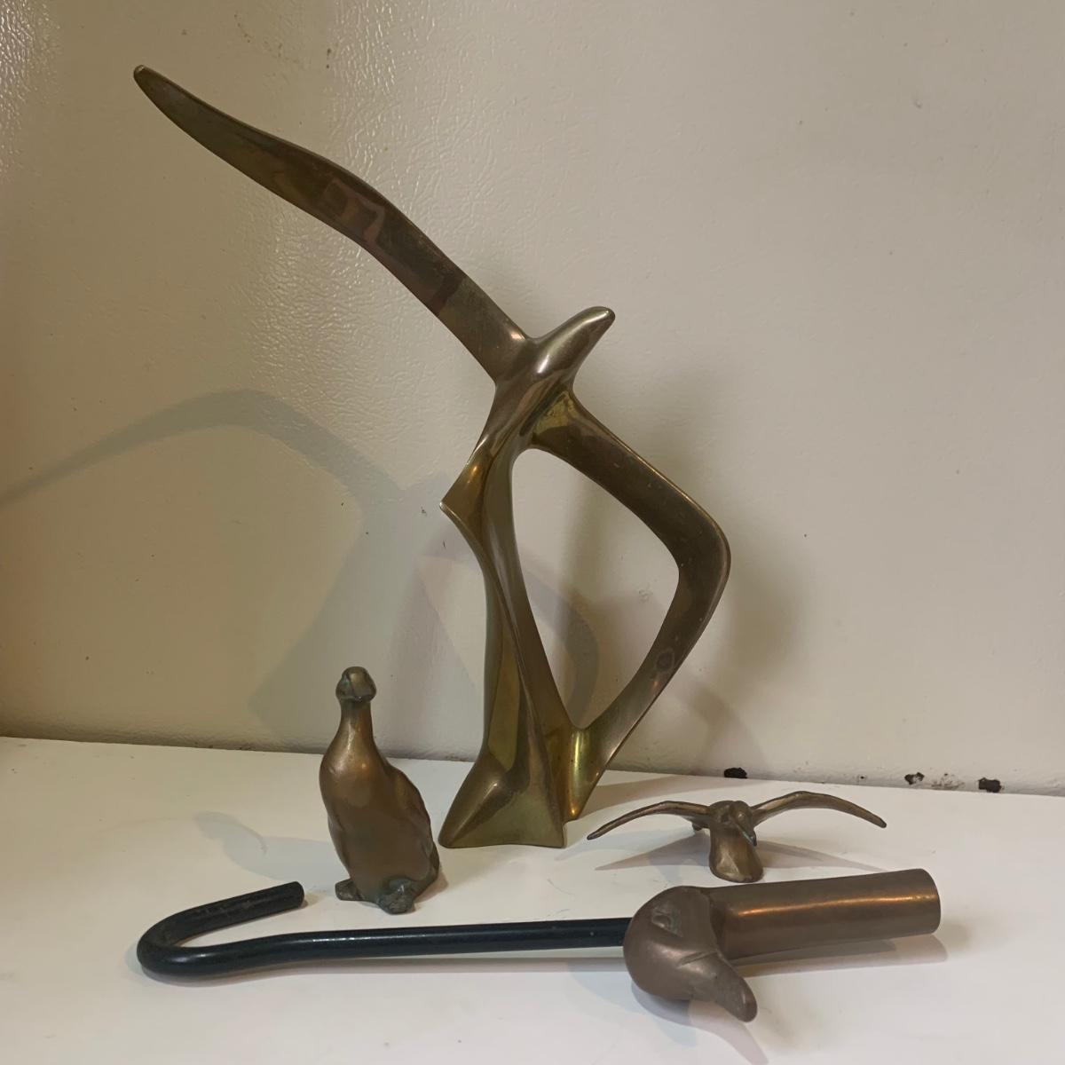 A solid brass mide century modern style brass seagull measures approximately 9” x 3” x 10.5”H. It has a couple blemishes, see photos. Also included are two small figurines, one a duck and one a pelican. They are brass colored but do not appear to actually be brass. The fourth item is a brass duck head that is a fireplace damper hook pull.